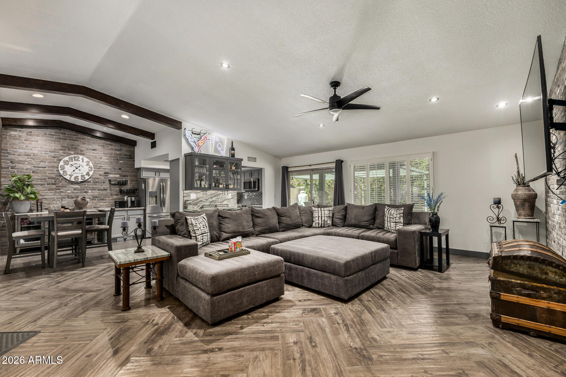 Updated and move-in ready, this home blends modern finishes with warm, inviting character. Enjoy wood-look tile flooring throughout the main living areas, plus a fully remodeled kitchen featuring updated cabinetry, countertops and a fresh, clean design. The open, airy feel is enhanced by a vaulted ceiling with striking wood beams. Recent improvements continue outside with a freshly painted exterior and a backyard set up for relaxing and entertaining--pavers, a covered patio, a pergola, and a hot tub for year-round enjoyment. Thoughtful updates from top to bottom make this home an easy choice for buyers looking for style, comfort, and turnkey convenience.