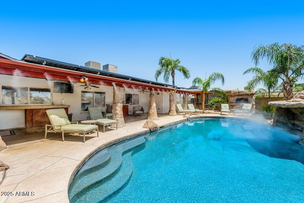Enjoy a backyard oasis with a sparkling pool, outdoor grotto bar, full kitchen, firepit, fireplace, and koi pond with waterfall. Indoors, relax with a pool table, dart board, wet bar, and smart TV with streaming. A new misting system and Bluetooth speakers complete this entertainer's dream -perfect as a primary home or vacation escape.