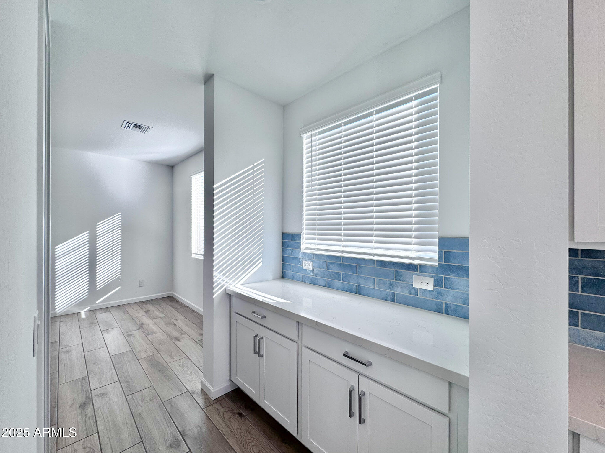 Throughout the home, finishes from the Coastal Collection create a light, inviting atmosphere. 8'' x 36'' light tan/brown plank tile flows through the main living areas, while soft carpeting in the bedrooms adds warmth and comfort. The kitchen serves as a true centerpiece, featuring 42" white shaker cabinetry with polished chrome hardware, Stria quartz countertops, and a striking Naive Sea blue tile backsplash that adds a modern coastal touch. A large pantry enhances functionality, and pre-wiring for pendant lighting allows you to personalize the space.