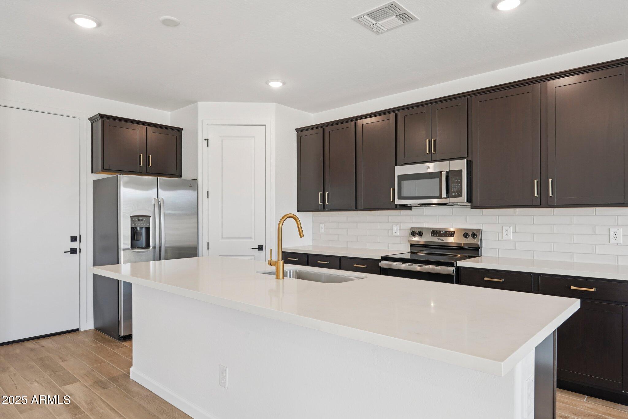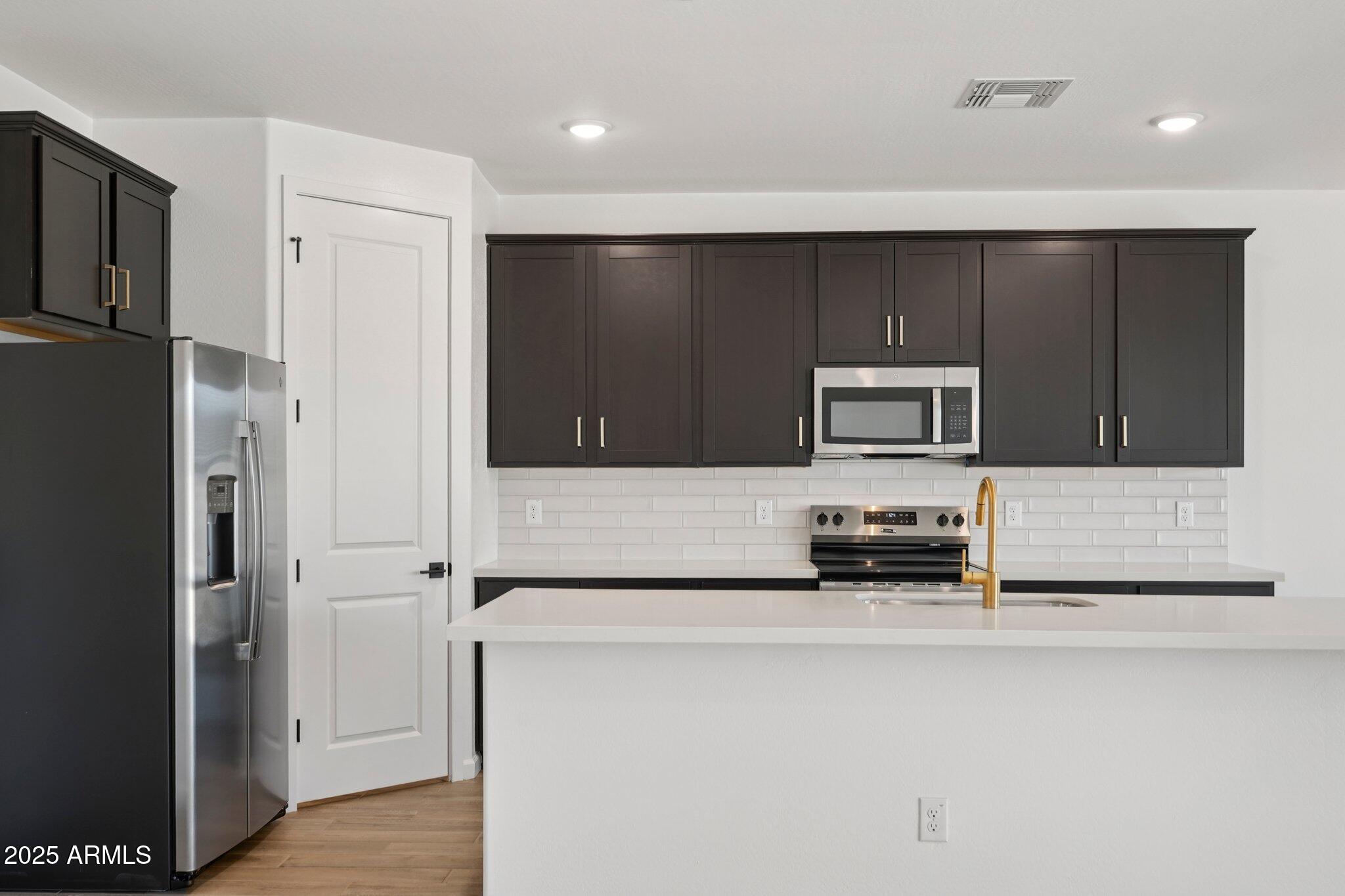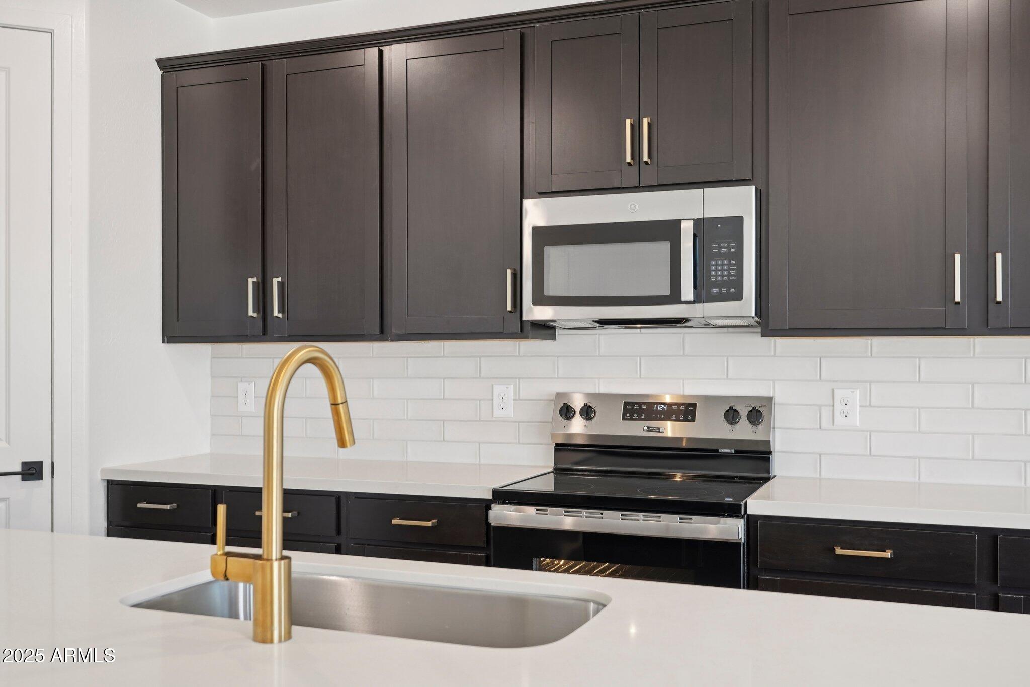 At the heart of the home is the chef-inspired kitchen, showcasing 42'' espresso cabinetry with Champagne Bronze hardware, Carrara Breeze quartz countertops, and a stylish 3x12 brick-pattern backsplash. A full suite of stainless steel GE appliances - including an electric range, microwave, dishwasher, and refrigerator - is included for ultimate convenience.