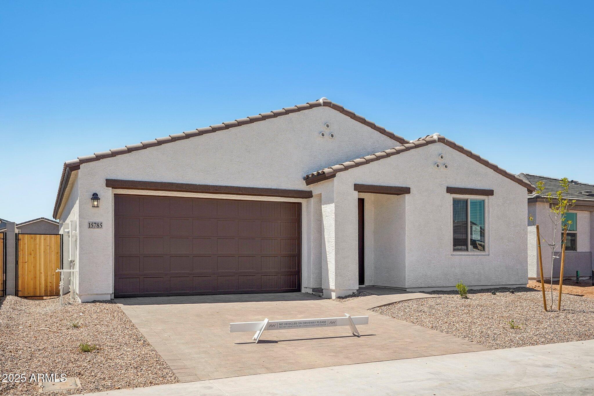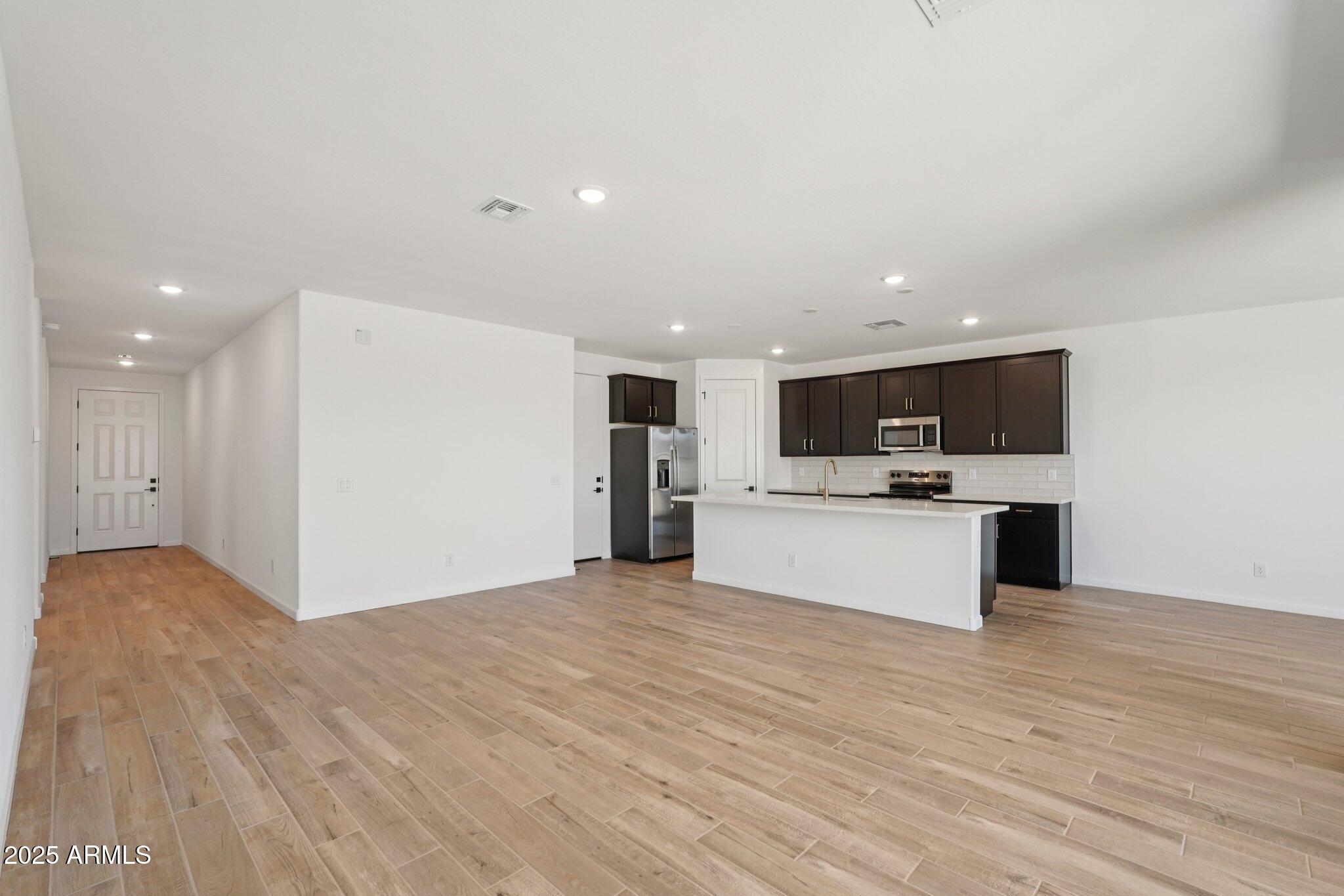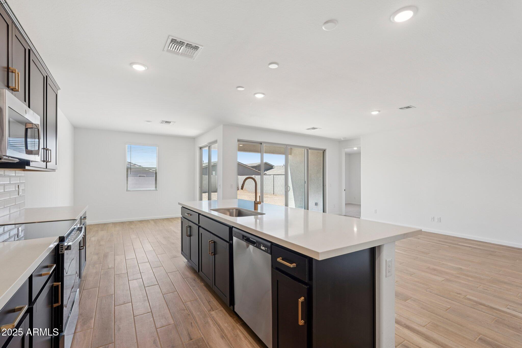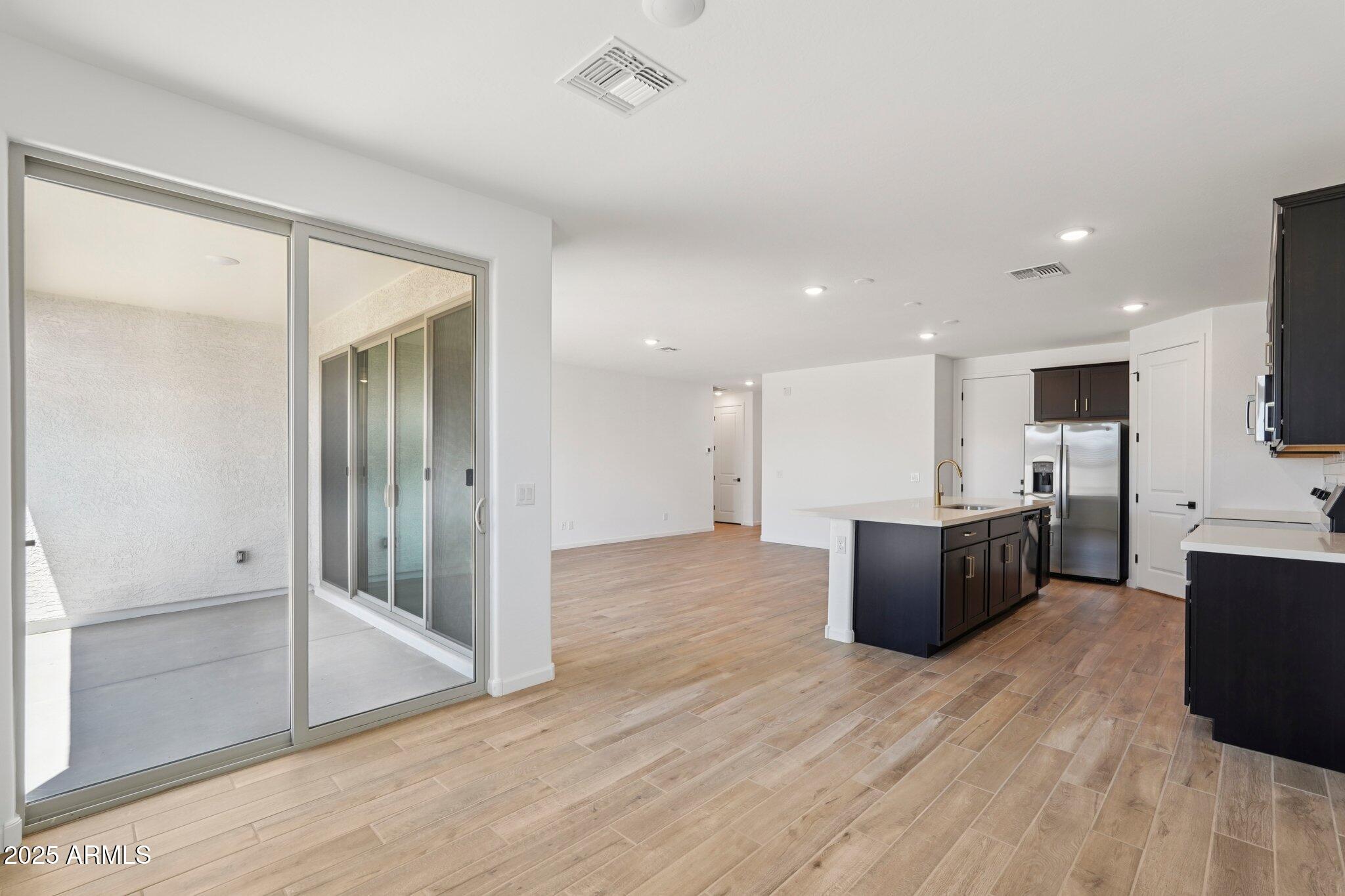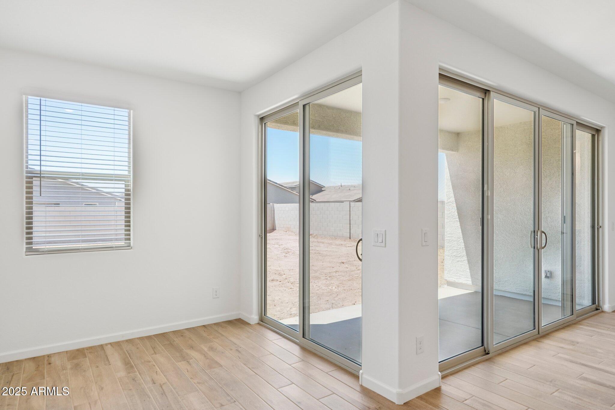 Step into the spacious great room, where 8' interior doors and a 4-panel center sliding glass door create a seamless connection between indoor and outdoor living. The generously sized backyard is ideal for entertaining, play, or relaxing under the Arizona sky.
