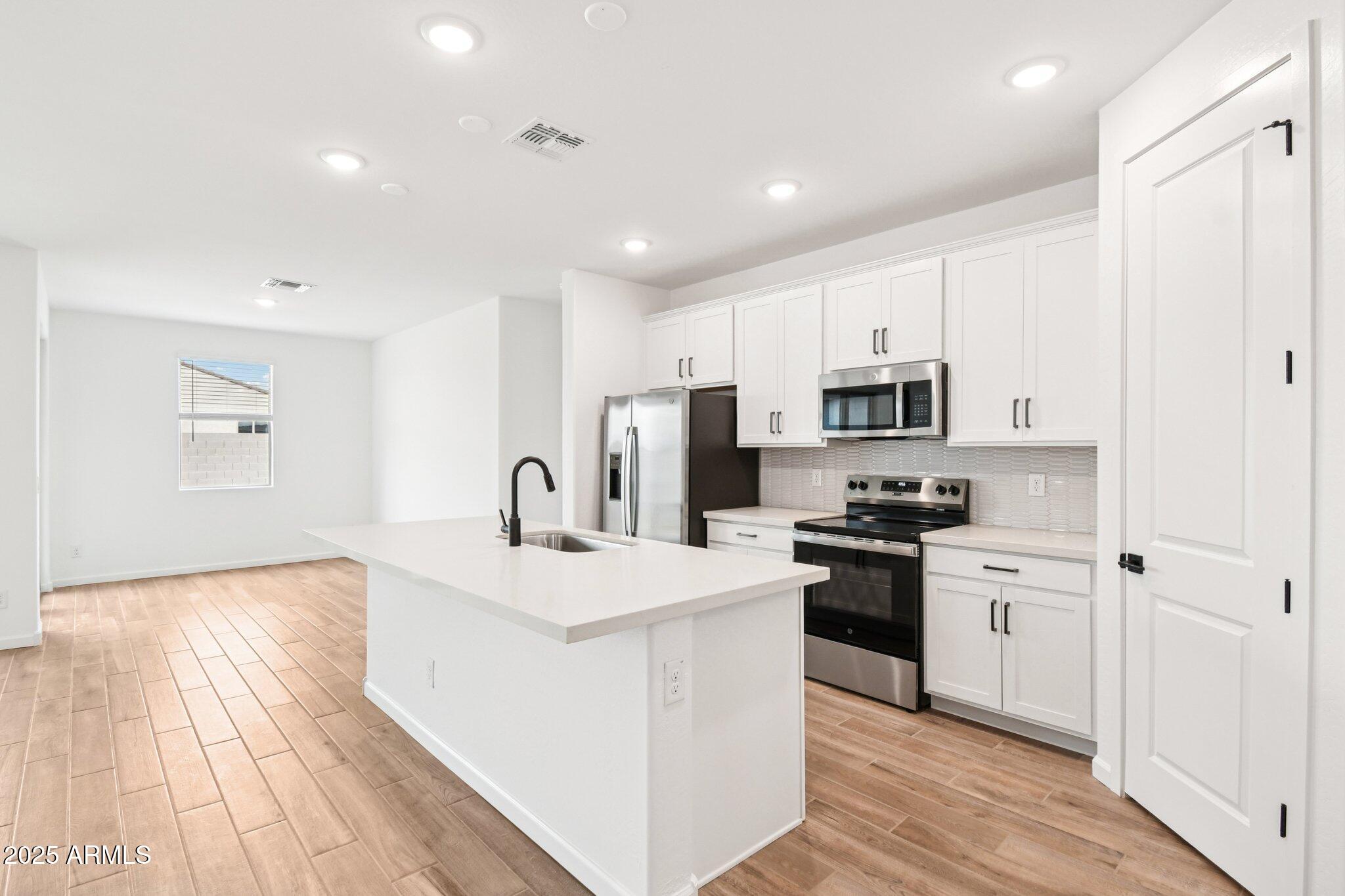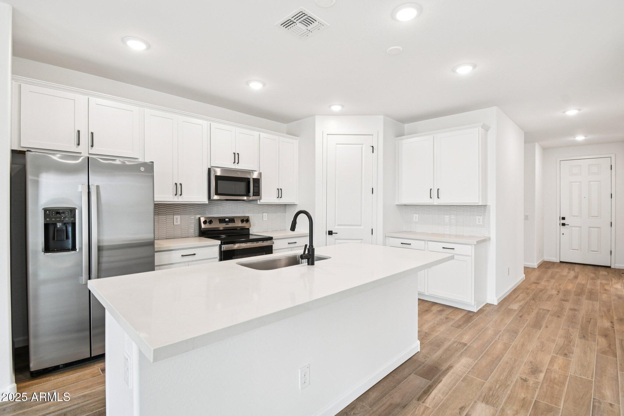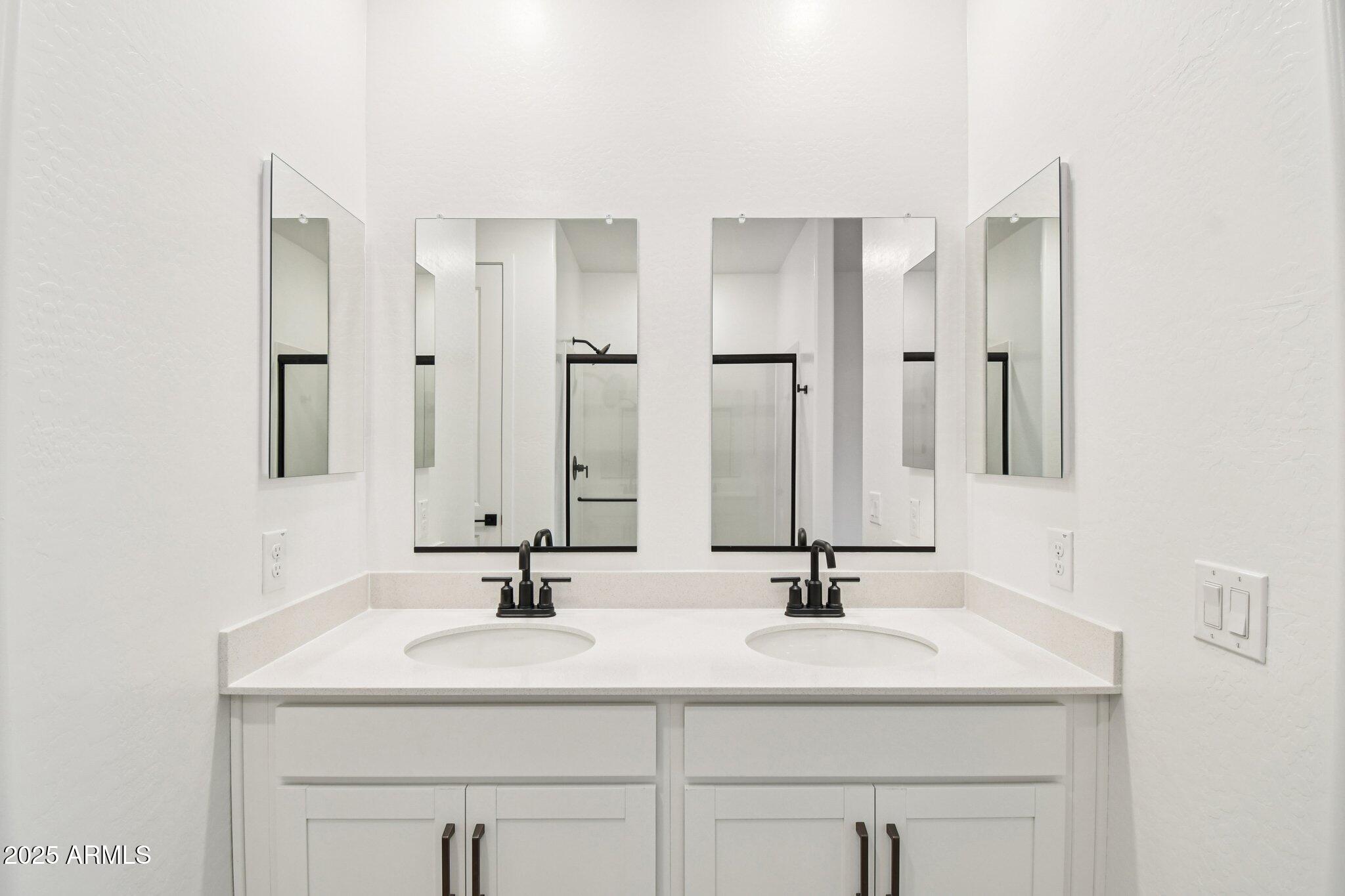 The kitchen is a true standout, featuring 42-inch white shaker-style cabinets, sleek gunmetal hardware, calming white mosaic backsplash and a pristine white quartz countertop. Step inside to discover an open-concept, split floorplan with two bedrooms situated at the front of the home and the primary suite tucked away at the rear for added privacy and peace. This design offers an ideal balance of comfort and functionality. Matte black fixtures in the bathrooms add a modern touch, while the white sand quartz countertops keep for a cohesive look throughout.