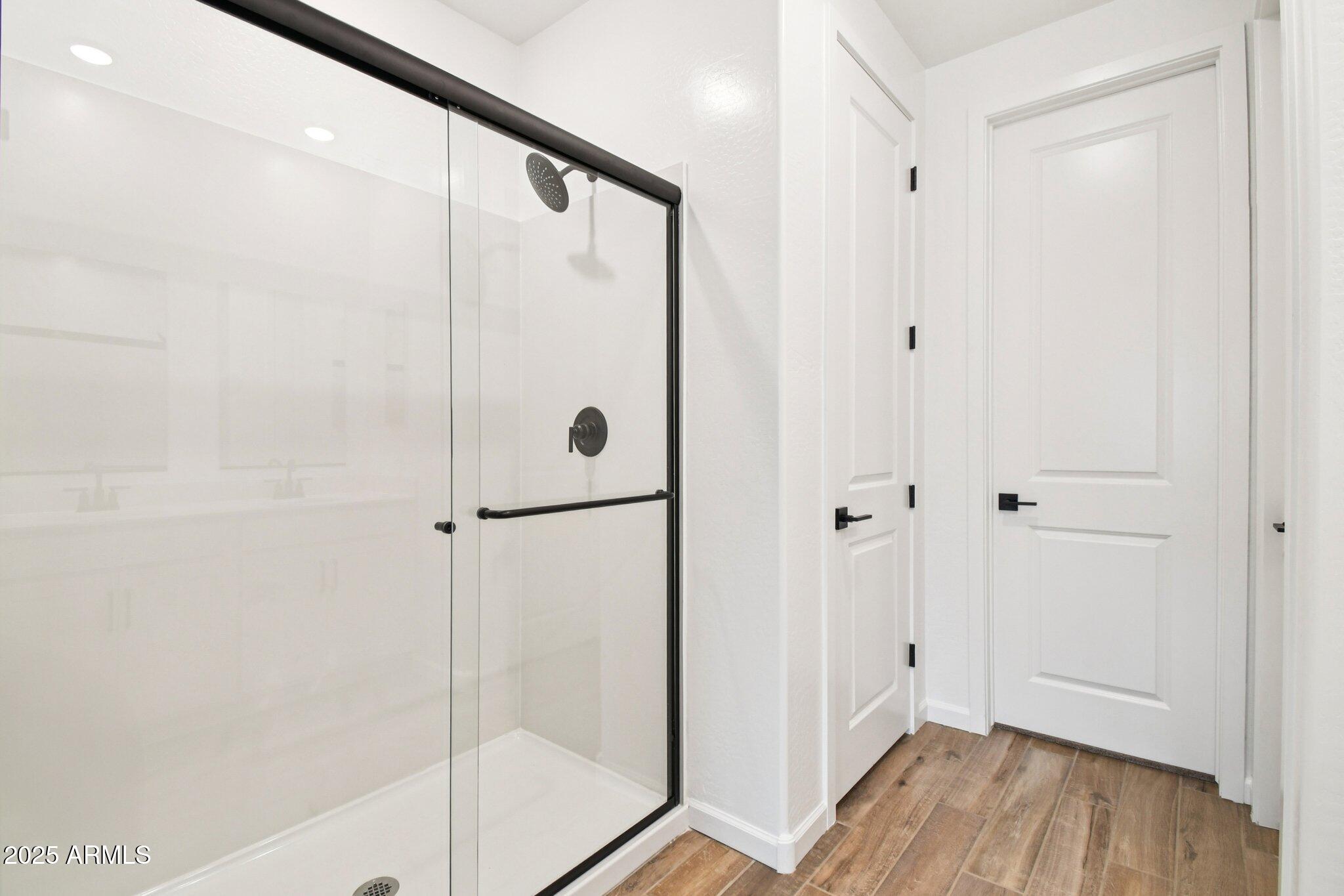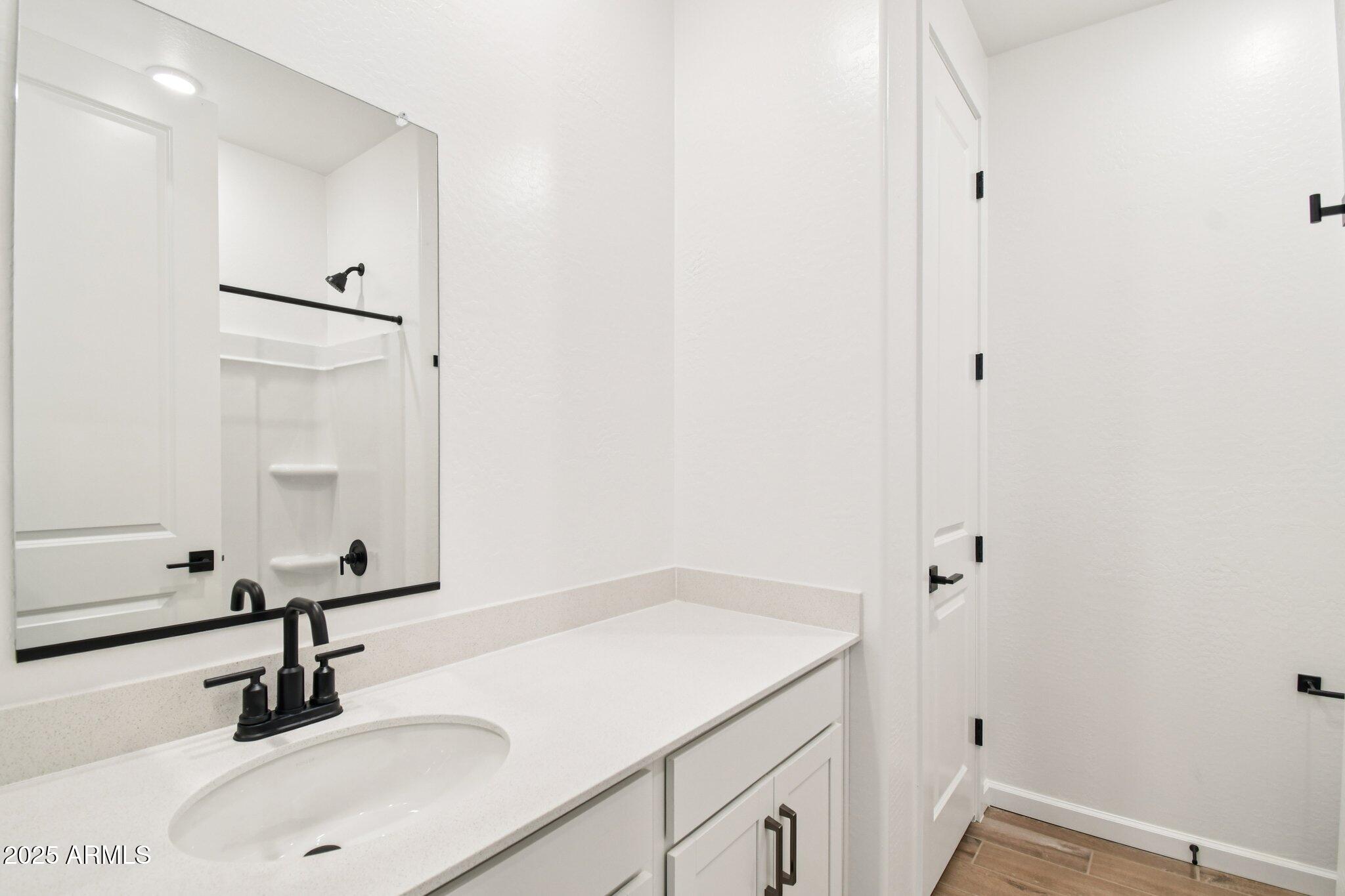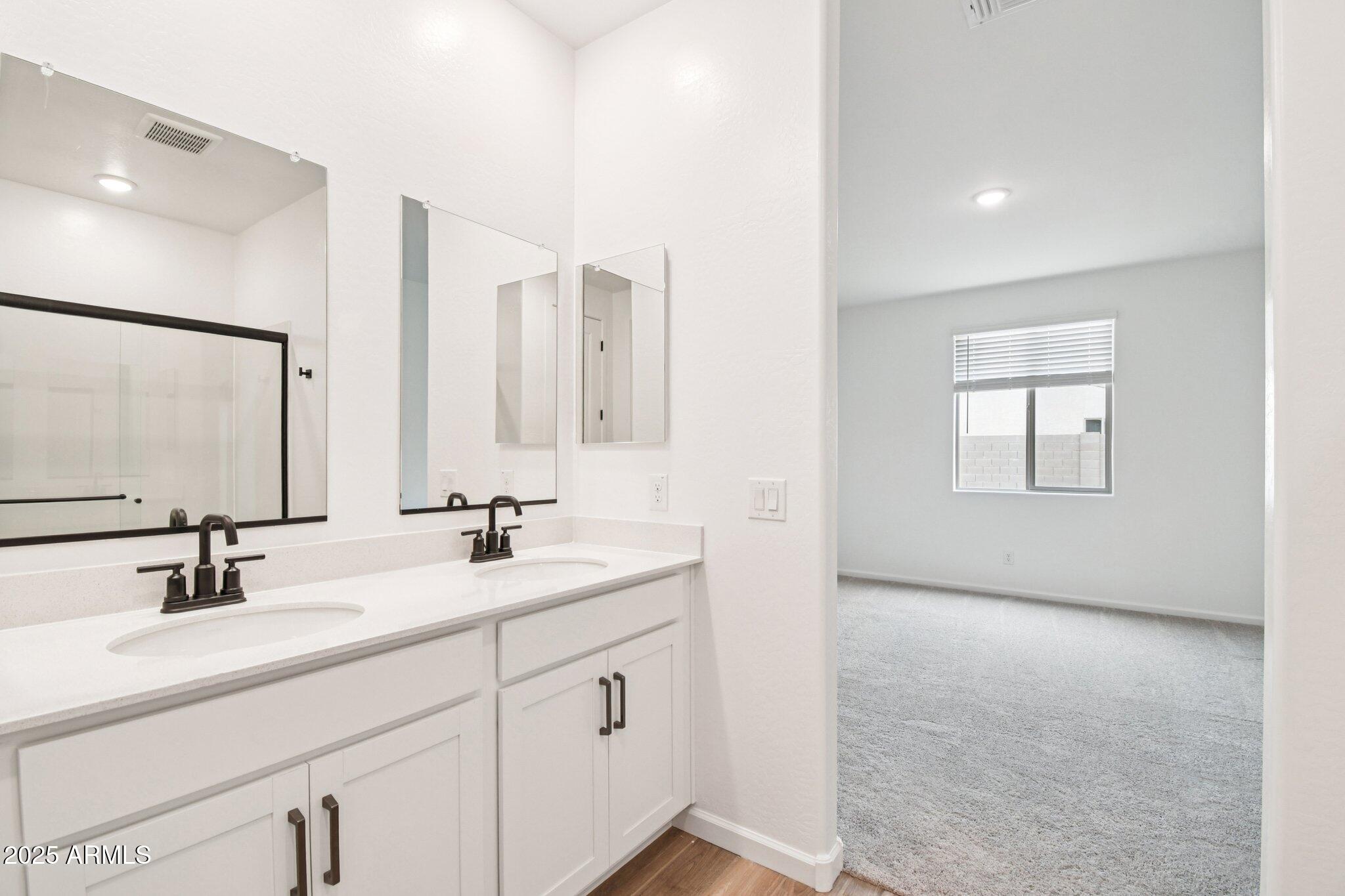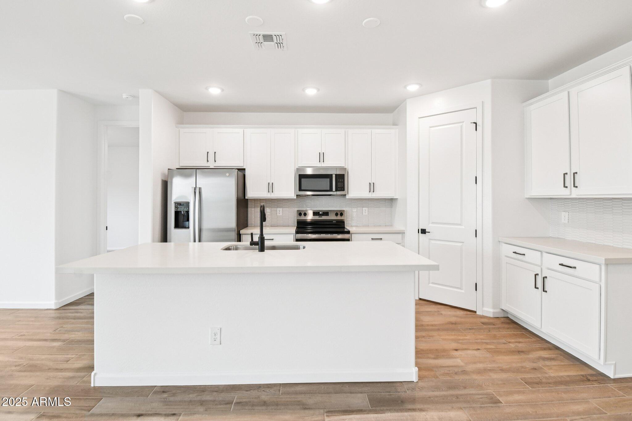 The kitchen is a true standout, featuring 42-inch white shaker-style cabinets, sleek gunmetal hardware, calming white mosaic backsplash and a pristine white quartz countertop. Step inside to discover an open-concept, split floorplan with two bedrooms situated at the front of the home and the primary suite tucked away at the rear for added privacy and peace. This design offers an ideal balance of comfort and functionality. Matte black fixtures in the bathrooms add a modern touch, while the white sand quartz countertops keep for a cohesive look throughout.