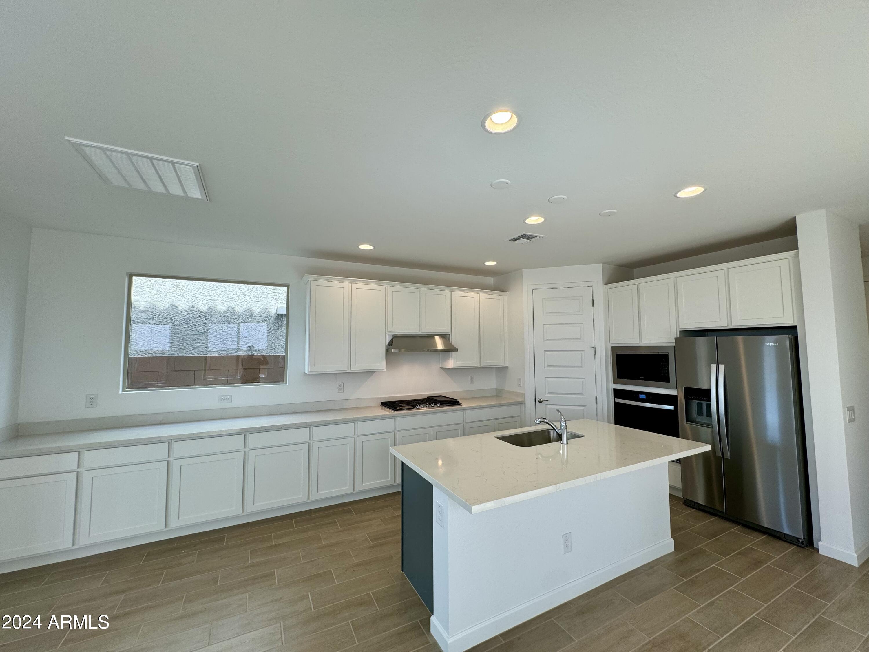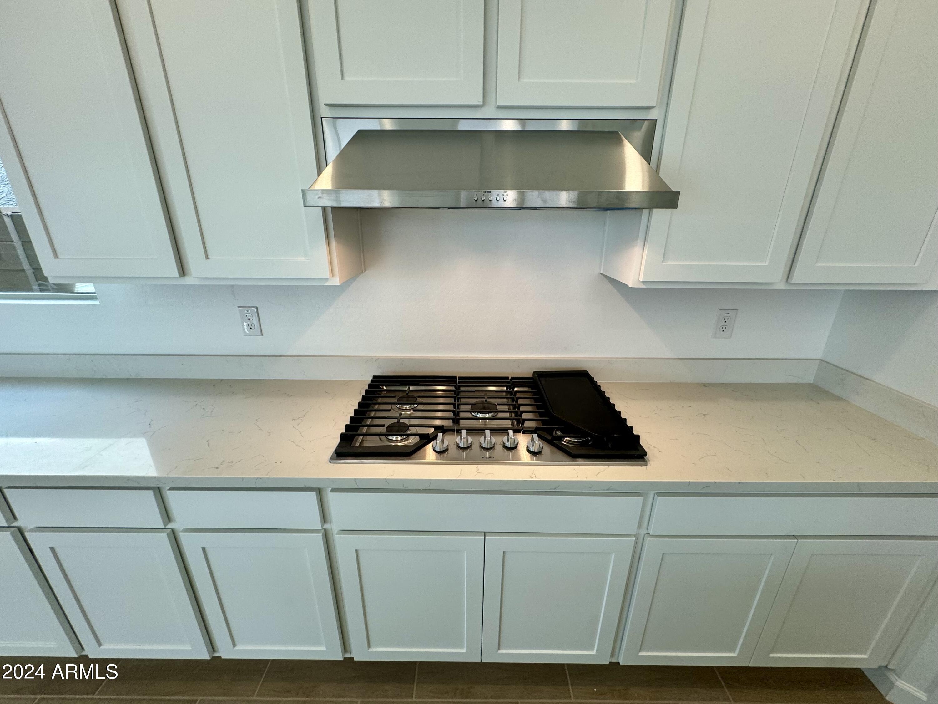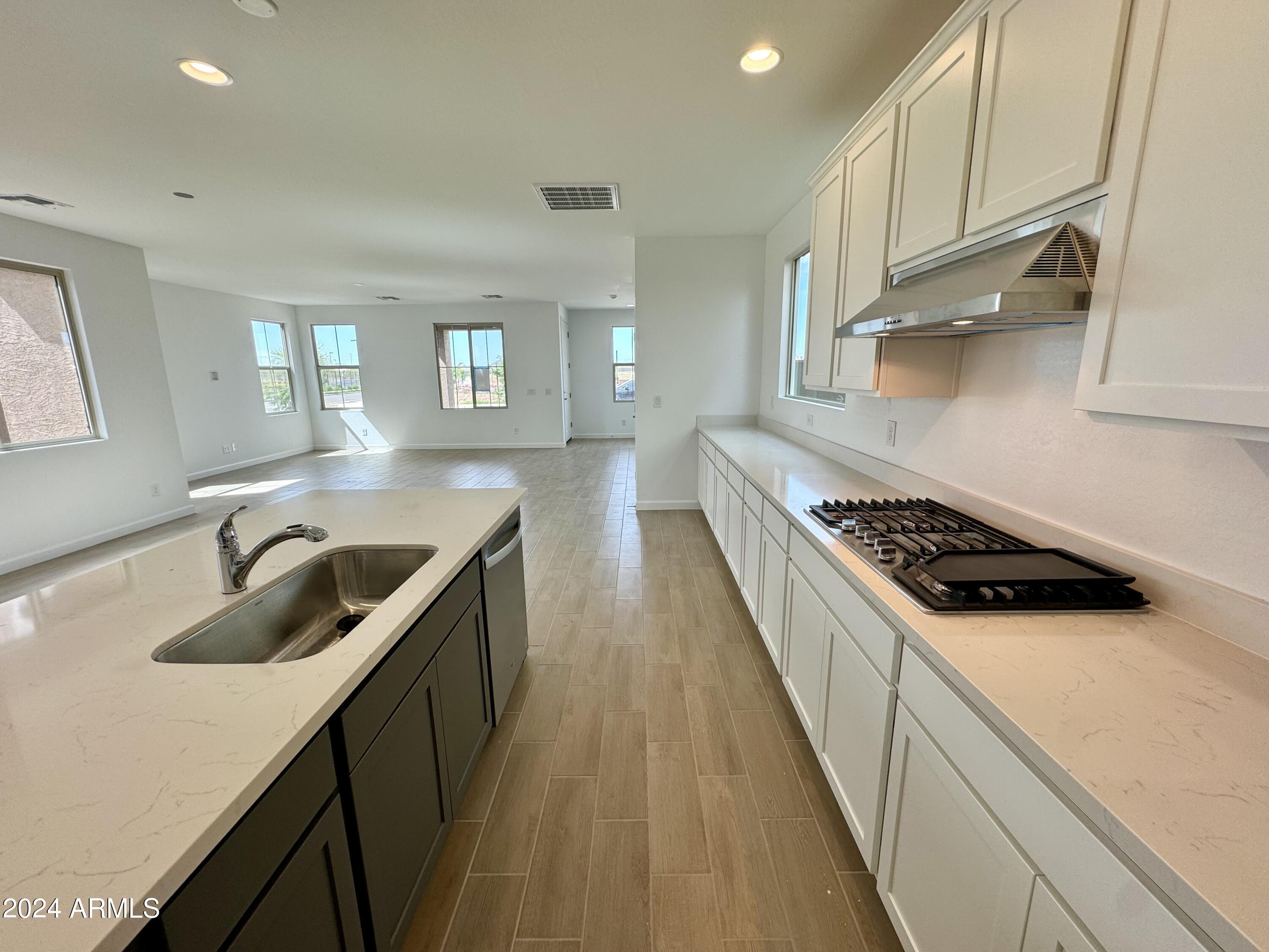 Tree-lined streets, pedestrian-friendly sidewalks and a 5,500 sf recreation center with resort style pool an kiddie pool, shaded ramadas, parks, gathering areas, pickelball courts & basketball. Close to I-10, 101 and 303. Walking distance to restaurants, movies, entertainment and shopping. 4-foot gate at front and rear of side yard. Gas stub at side yard. Pavered entry, walk and porch. Gourmet style kitchen with stainless steel gas appliances, including a cooktop, under cabinet hood, single wall oven & microwave with trim kit, and dishwasher. Shaker style cabinets painted white and shale, with several extras such as executive height vanities, a pull out trashcan in the kitchen, and an extended cabinet into the dining space. Quartz countertops at kitchen, with cultured marble at baths.