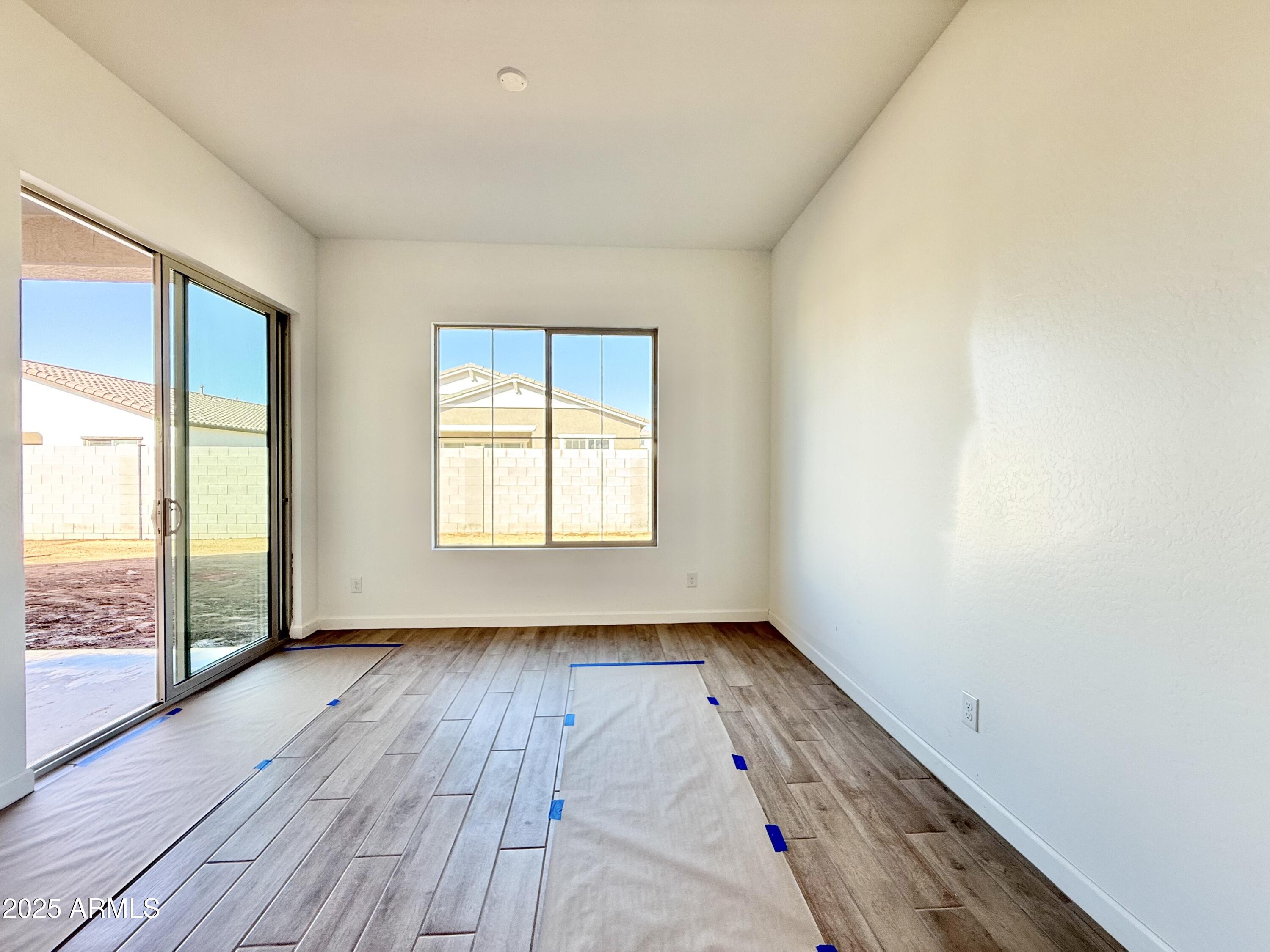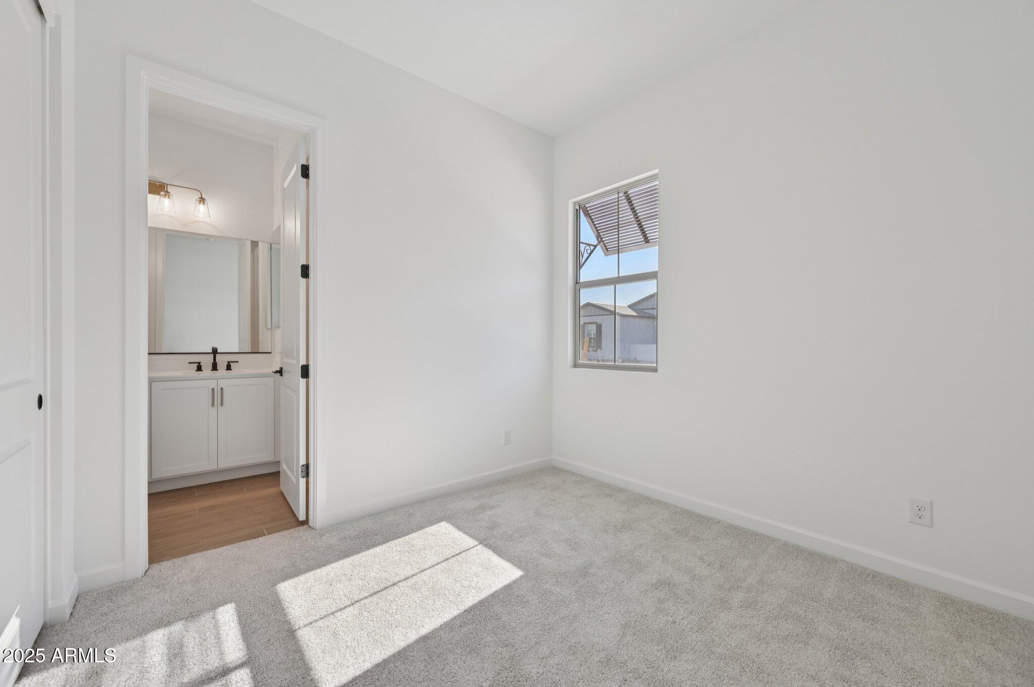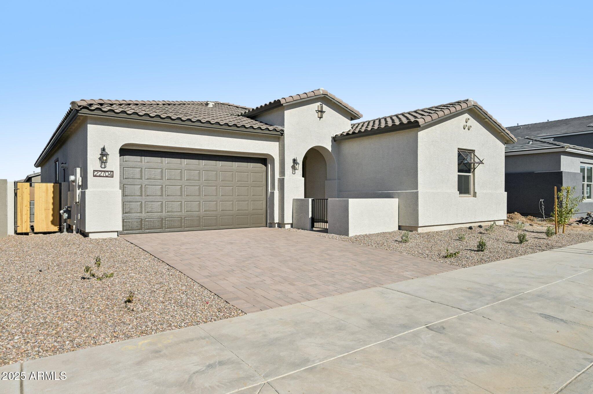 Welcome to this beautifully designed Jade floor plan offering 2,802 sq. ft. of refined living space on a desirable south-facing front homesite in Madera at Queen Creek. This spacious home features 4 bedrooms, 3.5 bathrooms, a versatile den, a formal dining room with a butler's pantry, and a 2-car garage. The exterior showcases timeless Spanish-style architecture, while the interior is finished in the warm, earthy Harmony designer palette with elevated touches such as matte black cabinet and door hardware, champagne bronze bath vanity lighting, and bronze interior door hardware. The gourmet kitchen is the heart of the home, complete with white cabinetry, a deco-wrapped island, Hana Sky quartz countertops, a 5-burner GE Profile gas cooktop, built-in oven and microwave, chimney-style hood, and a textured tile backsplash. The great room, den, and dining room are light-filled and open, featuring 6" x 36" Hill House Natural tile flooring throughout, with upgraded carpet in the bedrooms for comfort. The 4-panel sliding glass door leads to a north-facing backyardready to be personalized with a pool, garden, or outdoor kitchen. The primary suite is a private retreat with an enlarged walk-in shower tiled partway up the walls, dual sinks, quartz countertops, and Melrose champagne bronze vanity lighting. A tankless water heater adds comfort and efficiency, while a covered patio, double side gate, and garage service door enhance functionality. Conveniently located near the community's heated pool and spa, pickleball and basketball courts, playgrounds, walking trails, and community firepit, this home is just minutes from Frontier Family Park, top-rated schools, and Queen Creek's best shopping and dining.