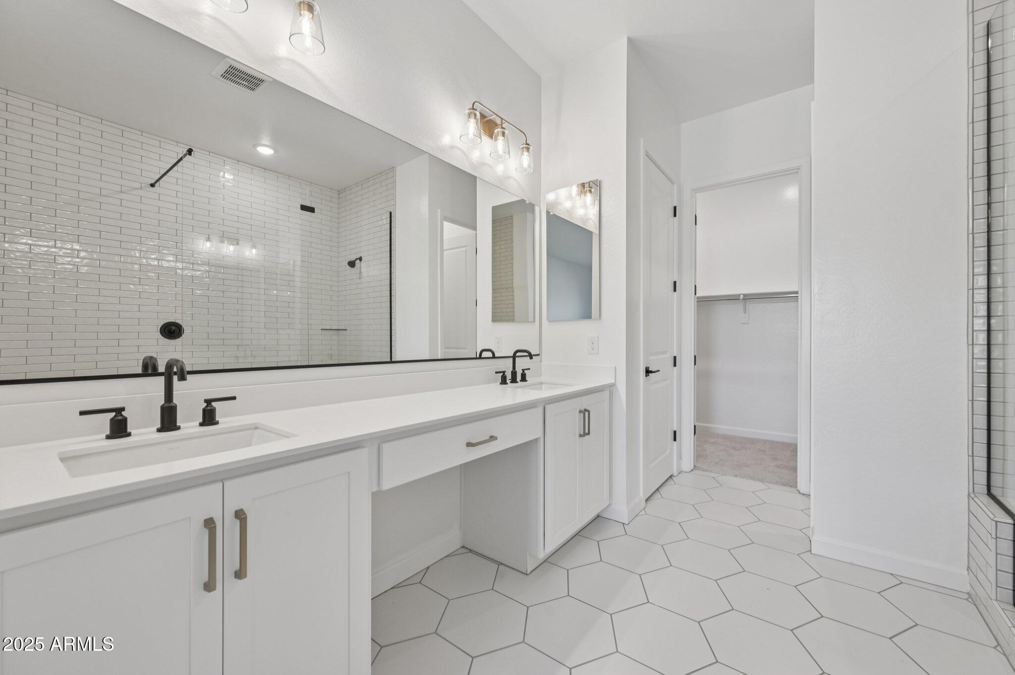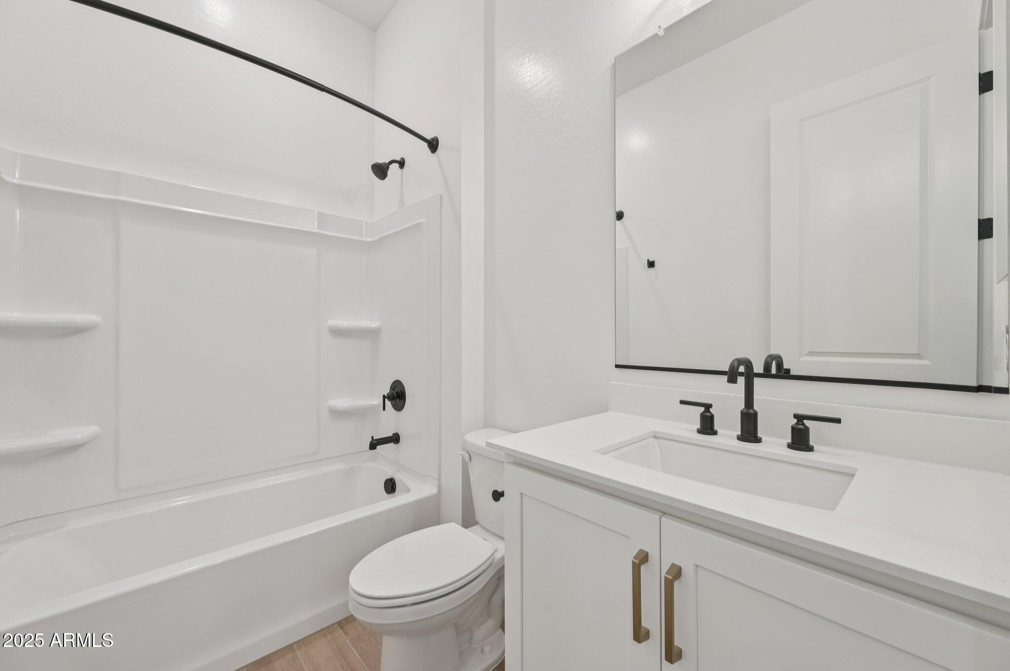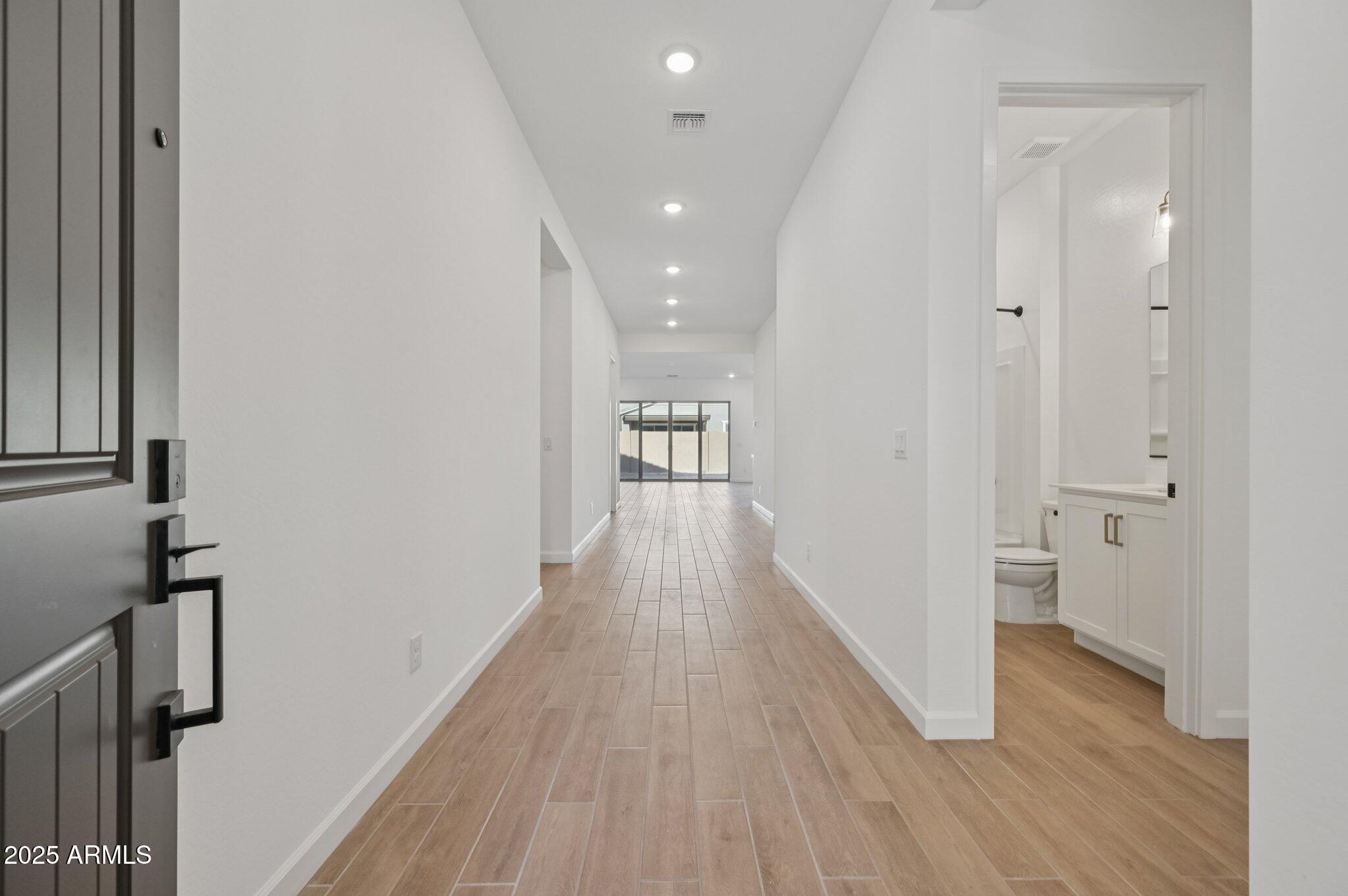 Welcome to this beautifully designed Jade floor plan offering 2,802 sq. ft. of refined living space on a desirable south-facing front homesite in Madera at Queen Creek. This spacious home features 4 bedrooms, 3.5 bathrooms, a versatile den, a formal dining room with a butler's pantry, and a 2-car garage. The exterior showcases timeless Spanish-style architecture, while the interior is finished in the warm, earthy Harmony designer palette with elevated touches such as matte black cabinet and door hardware, champagne bronze bath vanity lighting, and bronze interior door hardware. The gourmet kitchen is the heart of the home, complete with white cabinetry, a deco-wrapped island, Hana Sky quartz countertops, a 5-burner GE Profile gas cooktop, built-in oven and microwave, chimney-style hood, and a textured tile backsplash. The great room, den, and dining room are light-filled and open, featuring 6" x 36" Hill House Natural tile flooring throughout, with upgraded carpet in the bedrooms for comfort. The 4-panel sliding glass door leads to a north-facing backyardready to be personalized with a pool, garden, or outdoor kitchen. The primary suite is a private retreat with an enlarged walk-in shower tiled partway up the walls, dual sinks, quartz countertops, and Melrose champagne bronze vanity lighting. A tankless water heater adds comfort and efficiency, while a covered patio, double side gate, and garage service door enhance functionality. Conveniently located near the community's heated pool and spa, pickleball and basketball courts, playgrounds, walking trails, and community firepit, this home is just minutes from Frontier Family Park, top-rated schools, and Queen Creek's best shopping and dining.