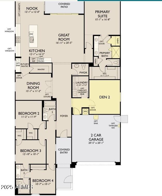 Durable and stylish wood-look tile flooring runs throughout the main living areas, with plush upgraded carpet in the bedrooms. A tankless water heater adds energy efficiency, and the home includes a 2-car garage with additional storage potential.