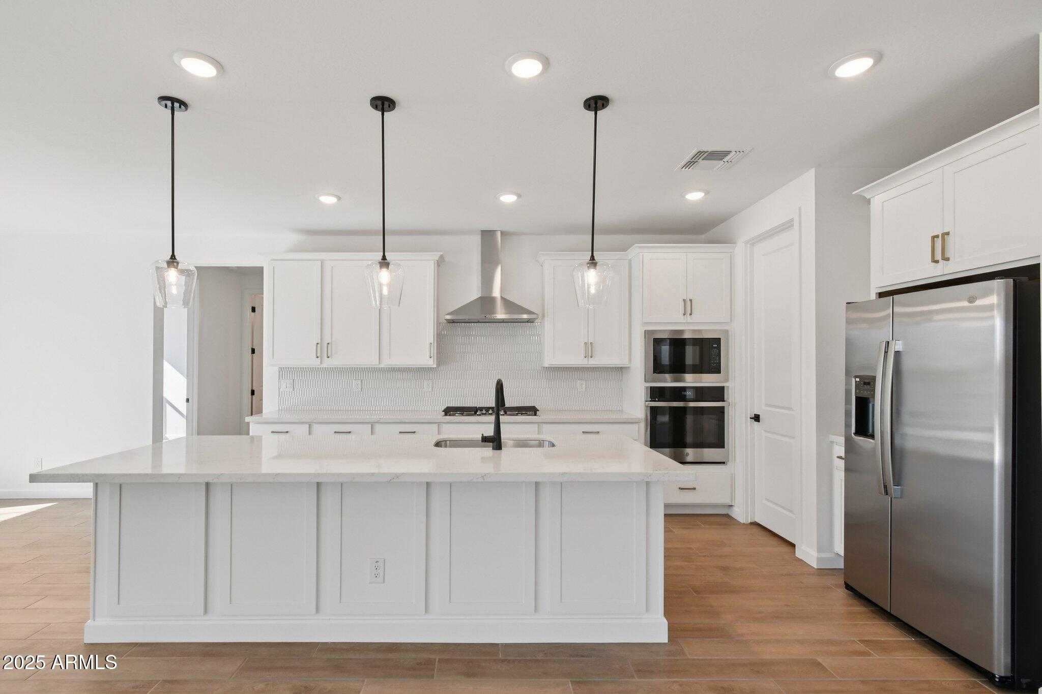 The gourmet kitchen includes white 42'' shaker cabinets, Hana Sky quartz countertops, a 5-burner GE Profile gas cooktop, built-in oven and microwave, chimney-style hood, and a textured tile backsplash. A deco-wrapped island and designer pendant lights over the island and breakfast nook complete the look.