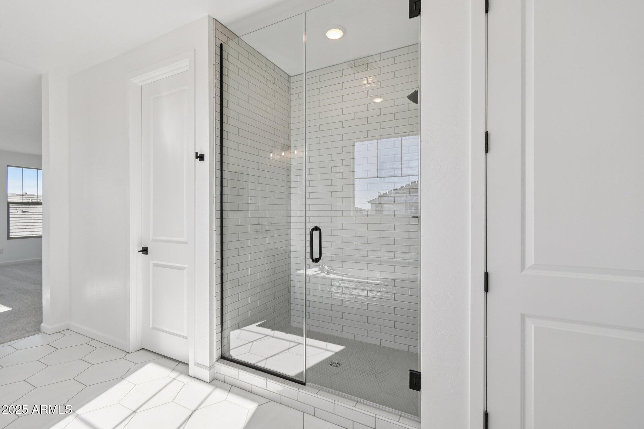 The primary suite upstairs features a large walk-in tile shower, quartz countertops, dual undermount sinks, and custom Meridian natural brass vanity lighting. Secondary bedrooms are generously sized; one includes a private en-suite, and others share hallway baths.