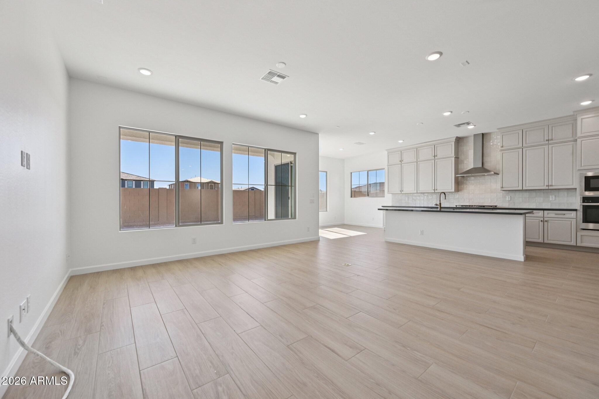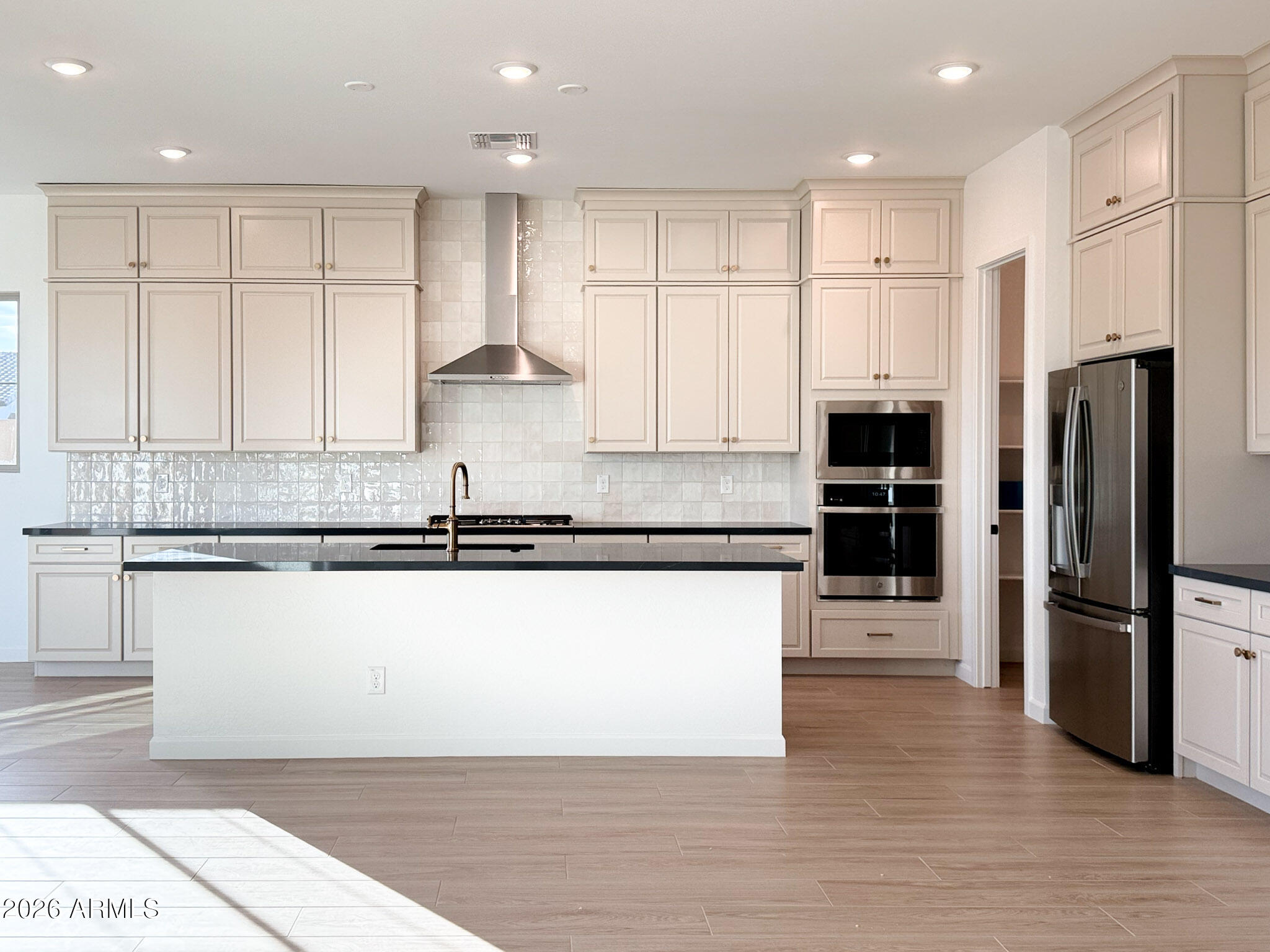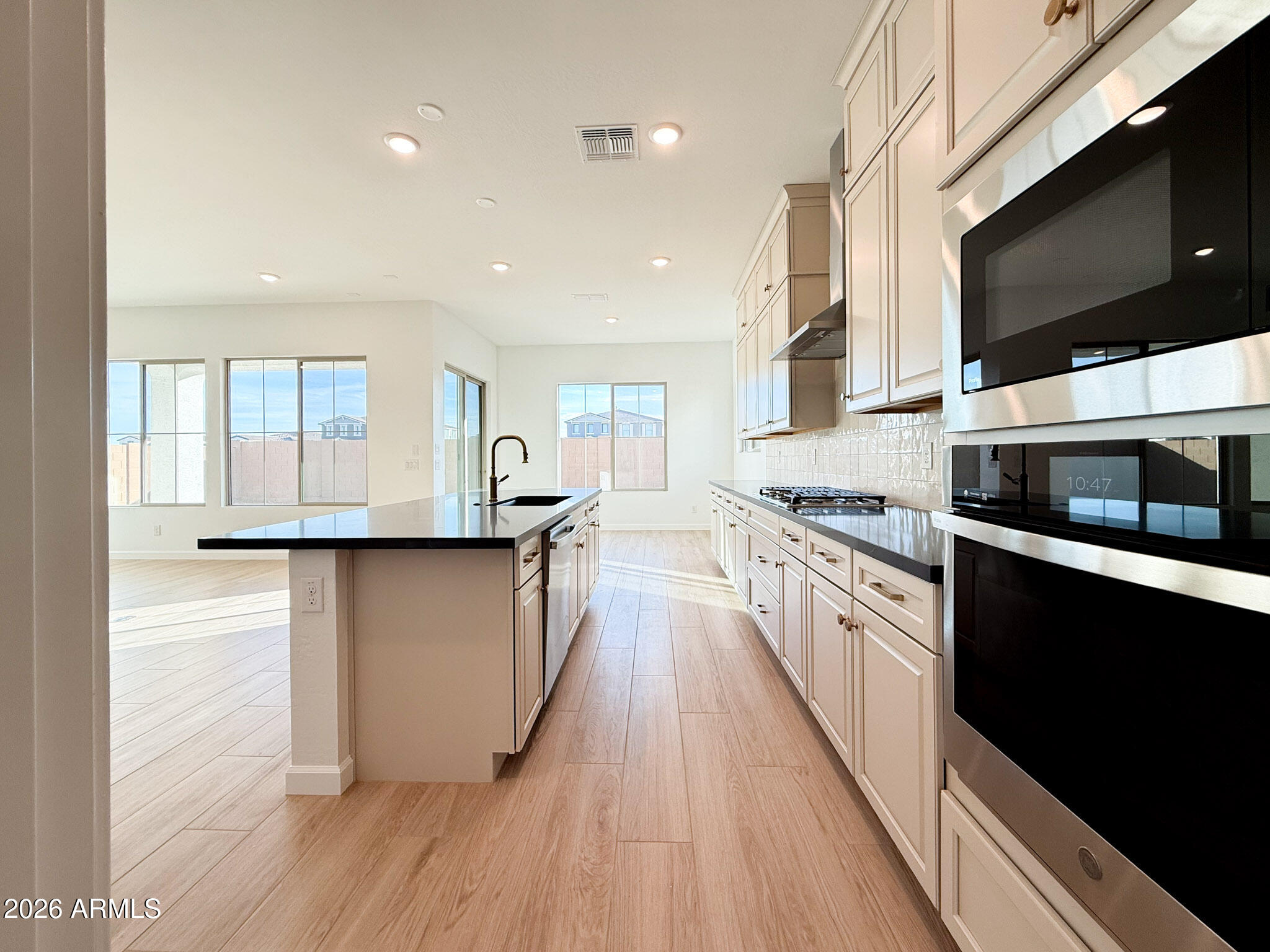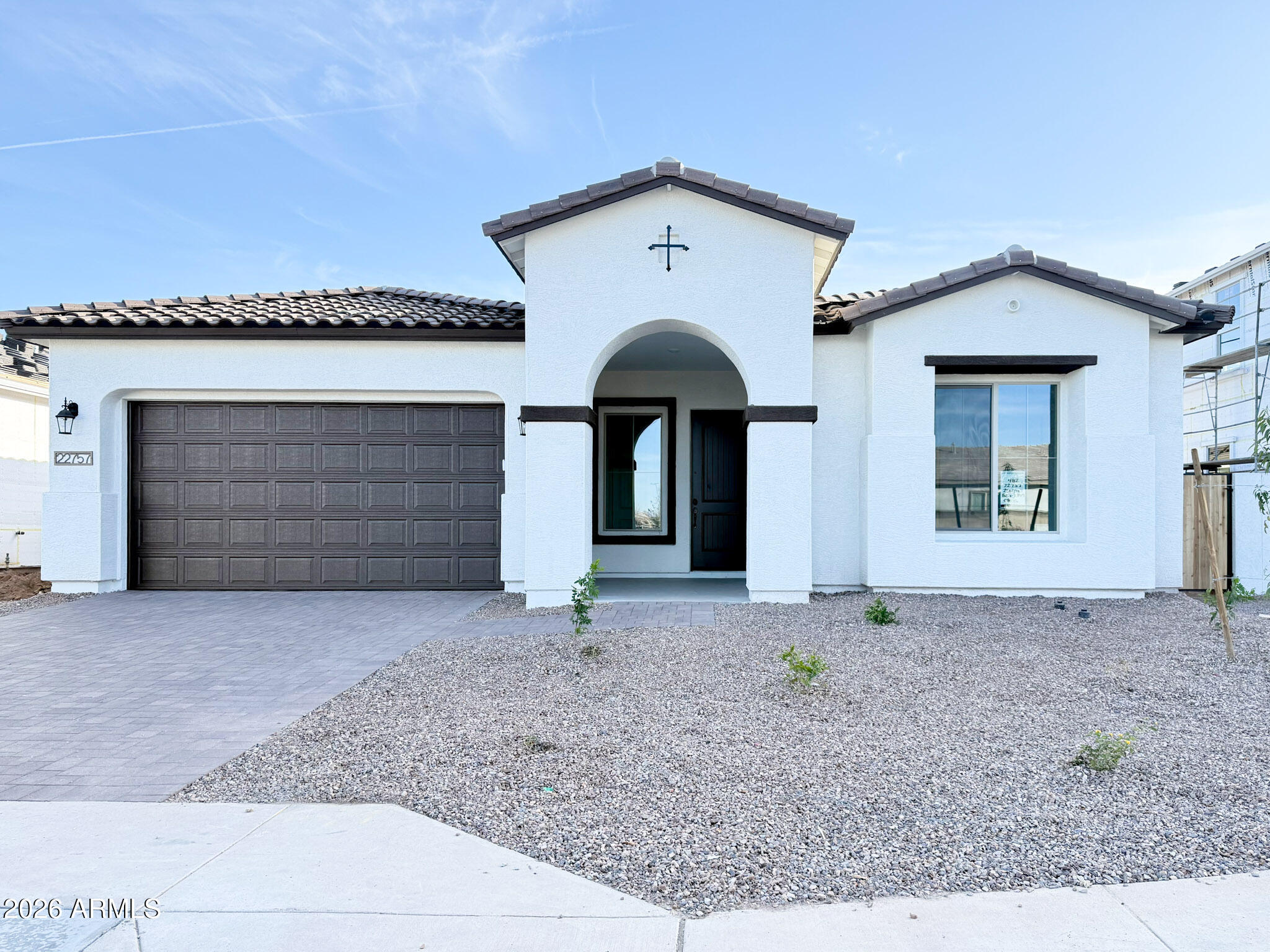 This Spanish Mission Topaz offers three bedrooms, two-and-a-half baths, a teen room, a den, and an open kitchen within 2,700 sq ft of warm, grounded living. The kitchen, colored in nourishing hues, features a dark soil-rich quartz countertop, Marcona cabinets soft as sun-lit riverstone, a stacked Flash Ivory backsplash, and a GE Profile appliance suite with a five-burner gas cooktop and built-in microwave and oven. Wide wood-plank tile floors, 10' ceilings, and large picture windows make the great room feel light and airy. The primary suite includes an enlarged shower, freestanding tub, and dual sinks. Located right across from the park in Madera.
