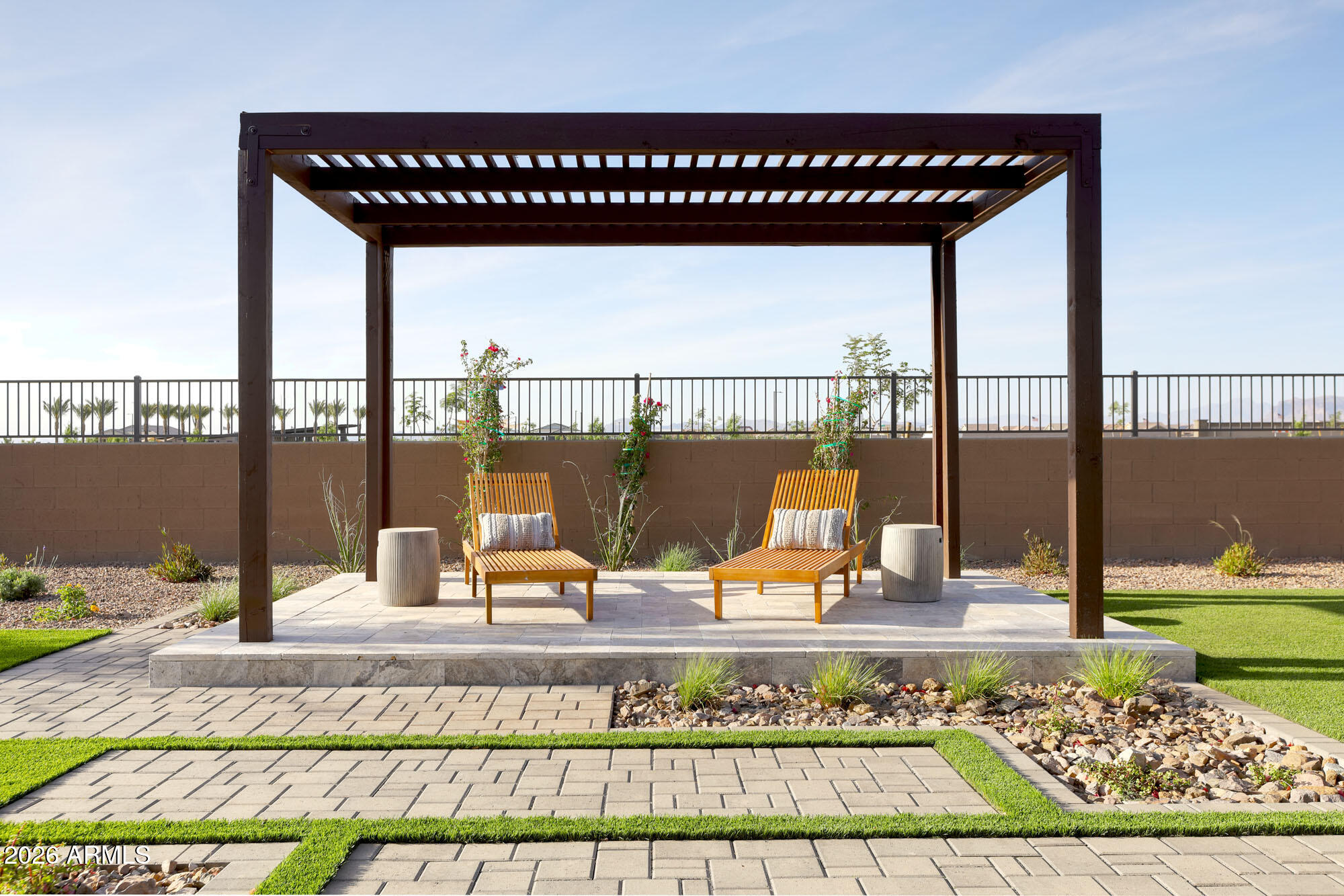 Beyond the interiors, the property is truly distinguished by its view-fenced lot overlooking the majestic mountains, providing both privacy and a picture-perfect backdrop. The backyard experience is equally remarkable: a custom pergola shades a space ideal for entertaining, while low-maintenance faux grass ensures a lush, polished look year-round. Every element of this homefrom the soaring ceilings to the custom palette, from the spa-like bath to the entertainer's backyardhas been thoughtfully considered to provide a lifestyle that feels curated, sophisticated, and utterly unforgettable.