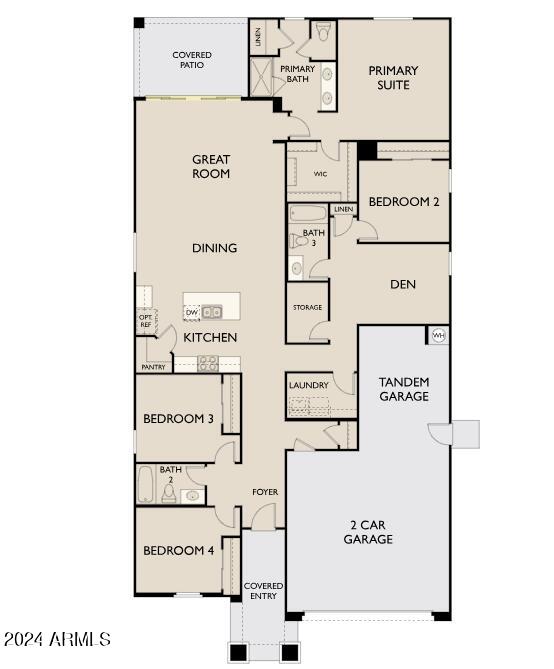 Embrace the elegance of our Harmony Palette, featuring 6 x 36 plank tile floors in the main living areas, plush carpeting in the bedrooms, stylish white 42"" shaker upper cabinets with cabinet hardware, and stunning Carrara Breeze quartz kitchen countertops paired with a complimentary tile backsplash. Included are SS appliances with gas range, 8' doors throughout, a 4-panel slider in the Greatroom as well as pre-wire for pendent lighting in the kitchen. The home is complete with a 3 -car tandem garage. Blinds, refrigerator and White washer and Dryer Included.