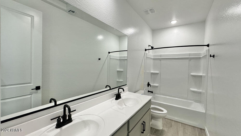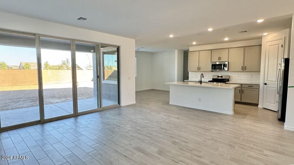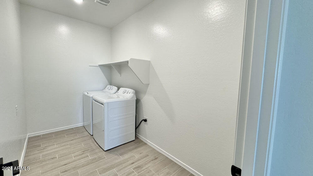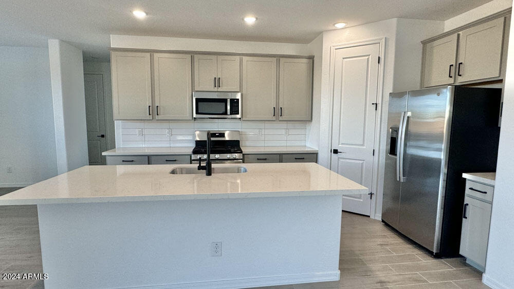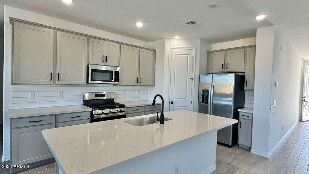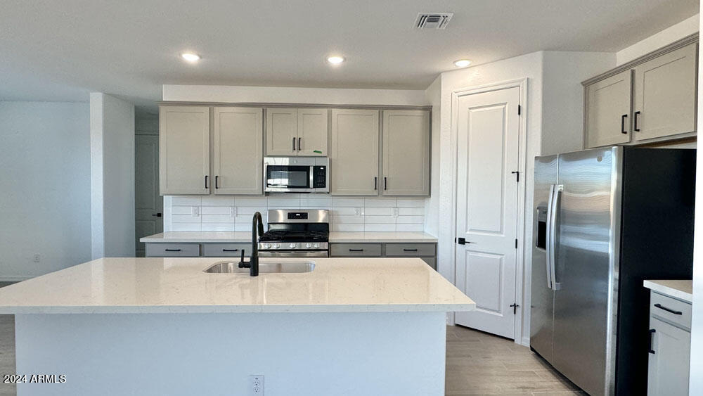 Embrace the elegance of our fine finishes, featuring 6 x 24 plank tile floors in the main living areas, plush carpeting in the bedrooms, stylish 42'''' gray shaker upper cabinets with sleek Black Bronze hardware, and stunning quartz kitchen countertops paired with a white 4 x 16 tile backsplash. The kitchen comes fully equipped with stainless steel appliances, including a gas range, microwave, dishwasher, refrigerator, and white washer and dryer. Additionally, the kitchen is pre-wired for pendant lighting, allowing for easy customization, and features a painted grade mission railing and soft water loop.