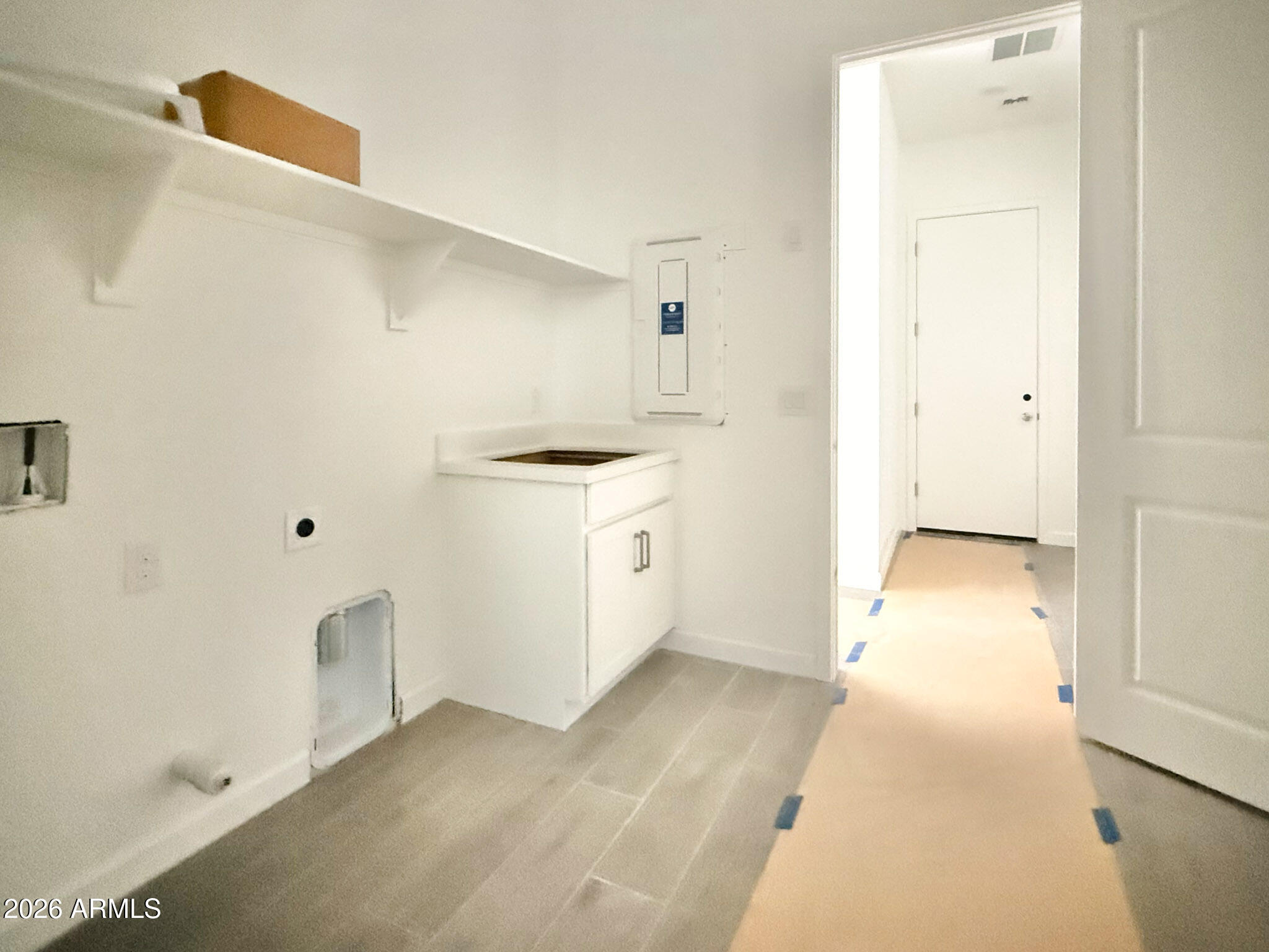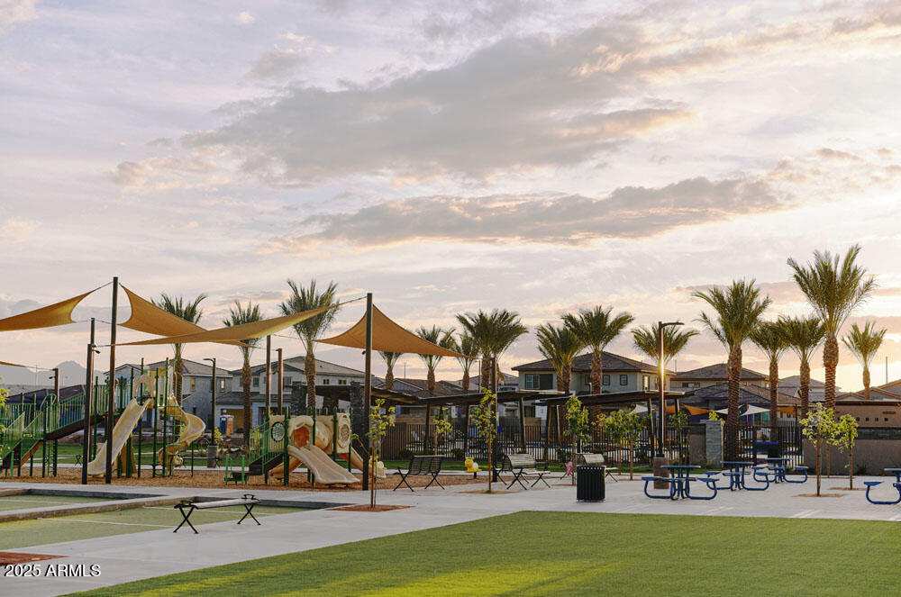 Discover the Aspen floor plan at Madera at Sultana, featuring a Modern Desert elevation and a rare 4-car super-sized garage with rear garage door access all on 9750 sqft lot. This open-concept home includes a 4-panel sliding glass door, lower nook window, double gate, gas stub, and irrigation main line to the backyard. Interior highlights include 10-foot ceilings, 8-foot doors, tray ceilings in the foyer and hallway, driftwood 8x36 tile flooring and upgraded carpet. The gourmet kitchen offers white cabinetry with a gourmet kitchen suite that includes gas cooktop and built in microwave and oven, ivory white quartz countertops, high-end backsplash, black metal drop pendants, a butler's pantry, and added cabinetry and sink in the laundry. The primary suite features an enlarged tiled shower, freestanding tub, and elegant finishes. EV charger package, LED disc lighting, floor outlet in the great room, and low-voltage wiring complete this exceptional home. All in North Queen Creek in Madera.