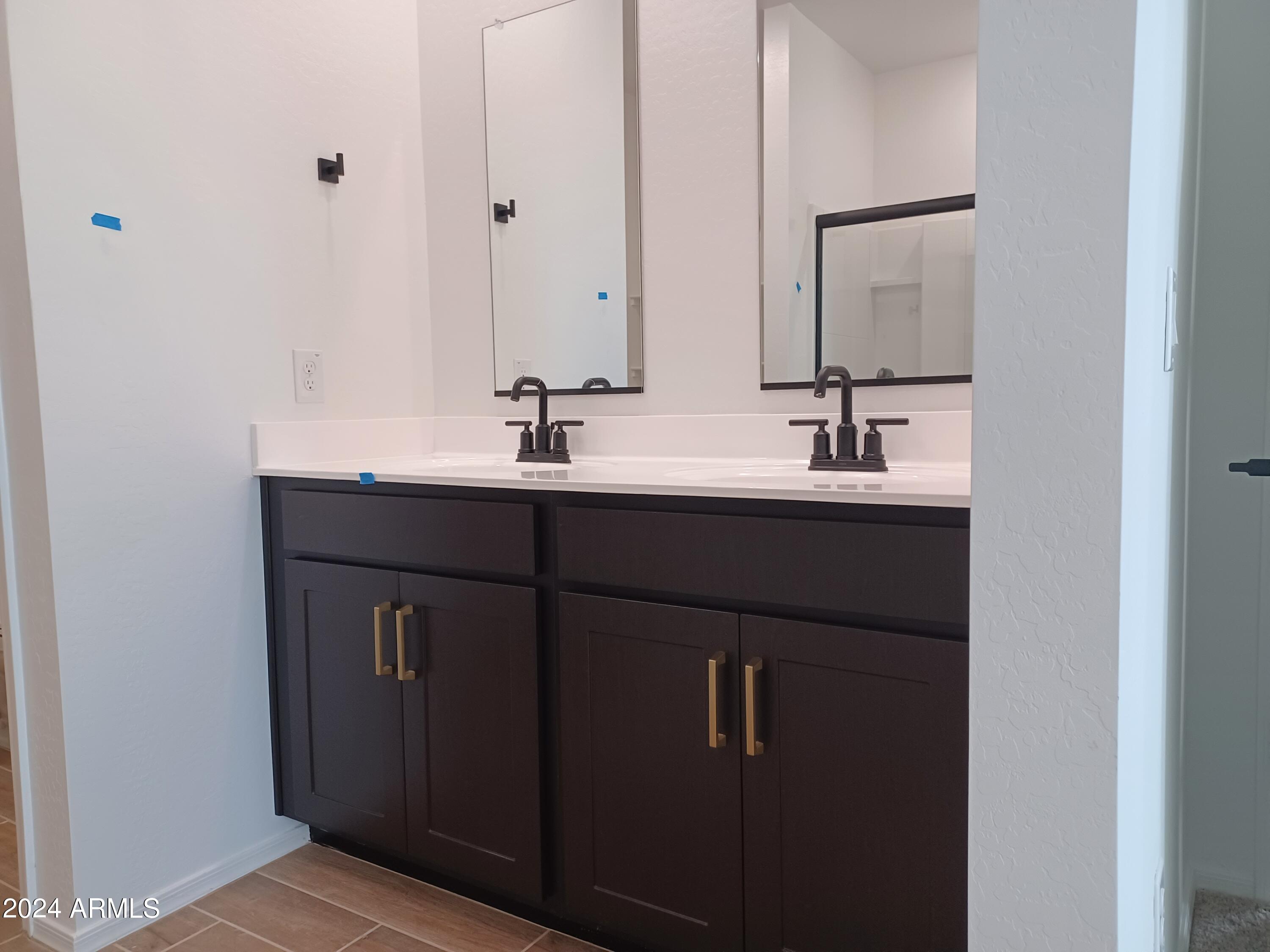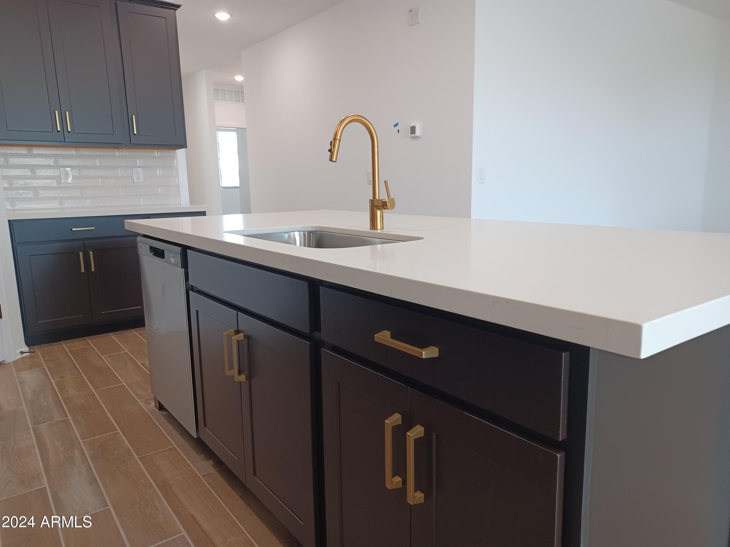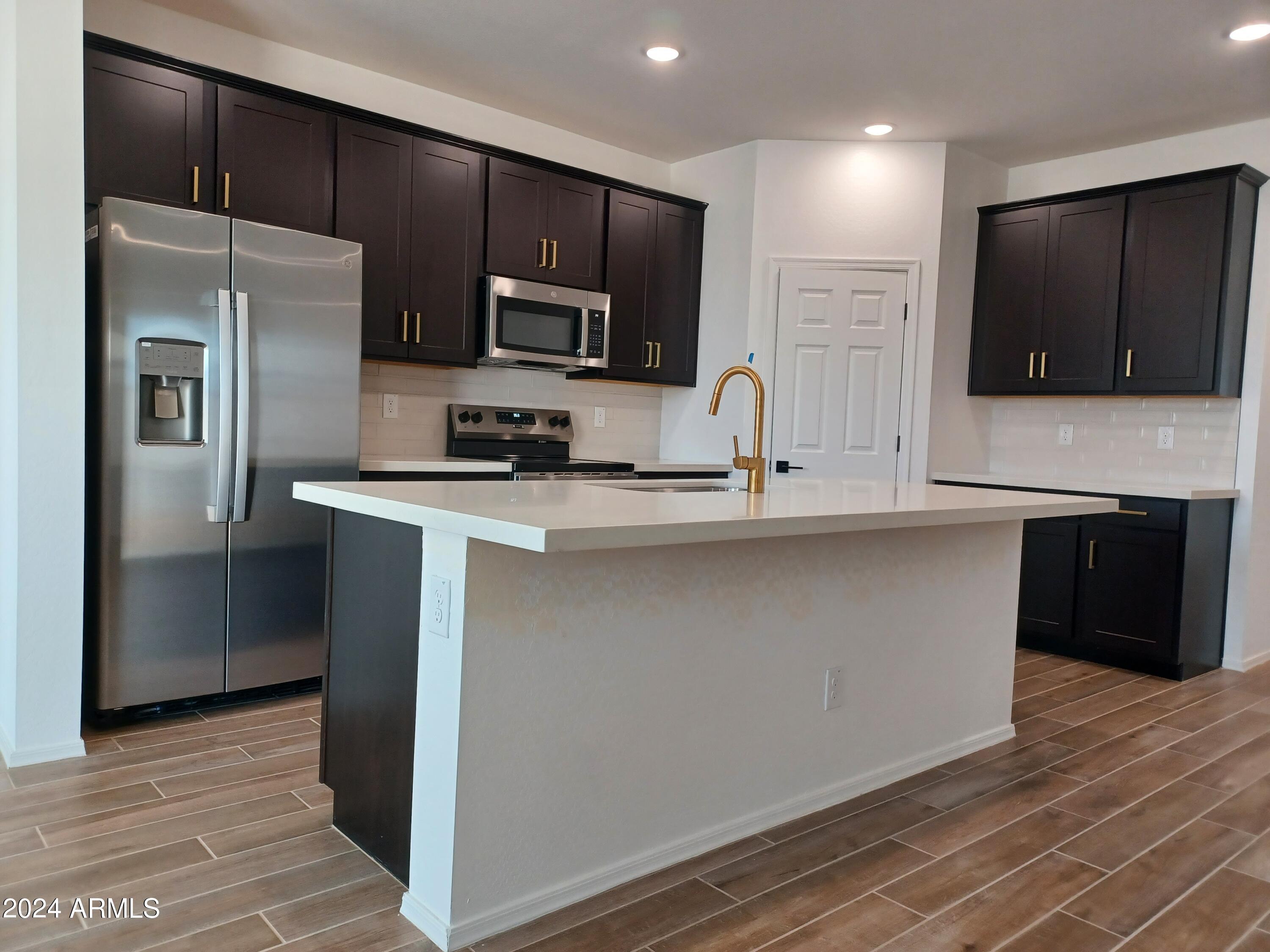 The open concept floor plan creates a seamless flow throughout the main living areas, ideal for entertaining and everyday living. The kitchen boasts 42-inch upper Fairview Sarsaparilla dark cabinets, Carrera Breeze quartz countertops, single basin undermounted sink, and subway tile backsplash. The wood-look tile flooring throughout the main areas adds warmth and style, while the cozy carpeted bedrooms ensure a soft and inviting retreat. This home is located near the walking trail and community park. "