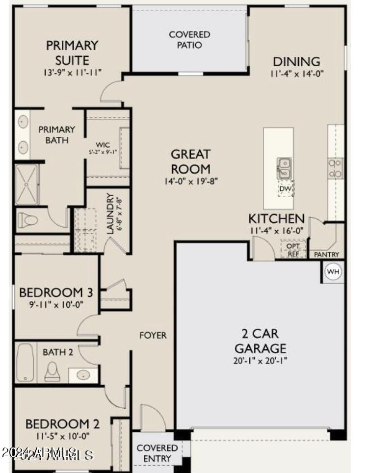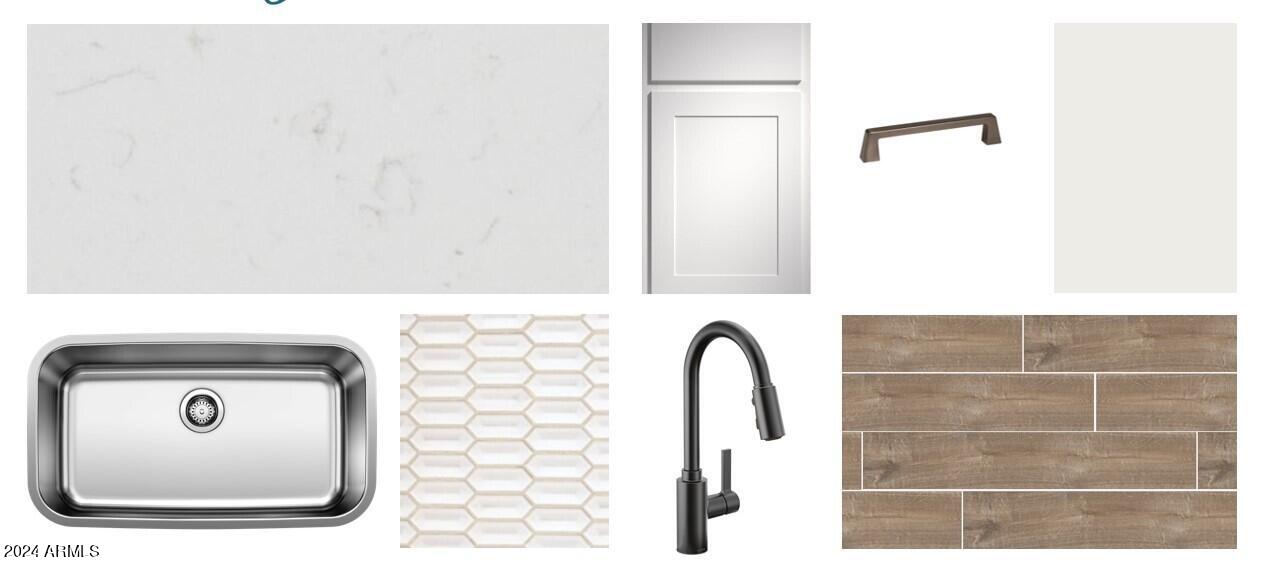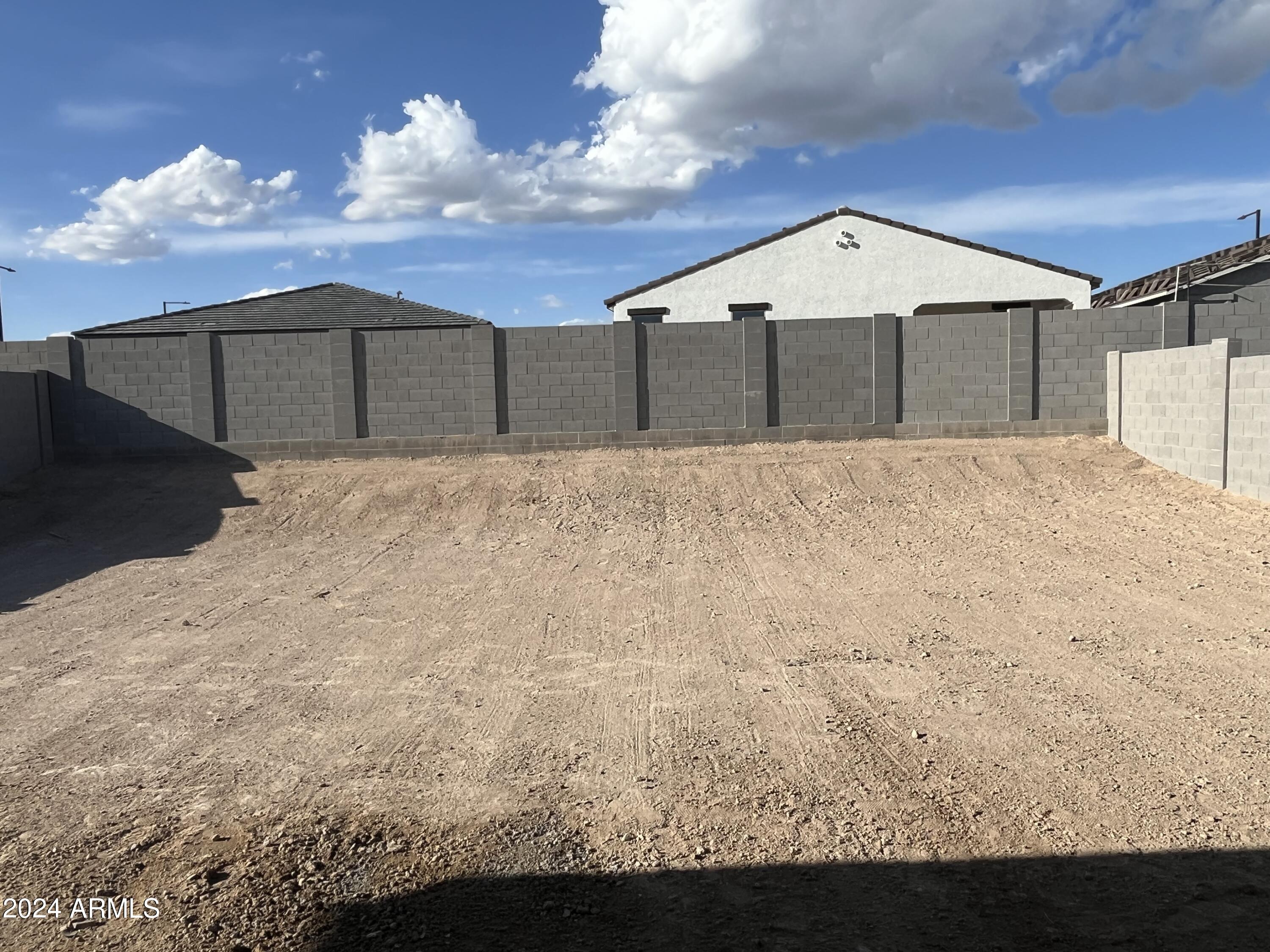 New Home under construction. Estimated completion April 2024. The home has a modern desert exterior with a desert landscape. Two secondary bedrooms and a bathroom sit in the front of the home while the primary bedroom sits in the back creating a split floorplan concept. The open concept of the kitchen and living area make this space great for entertaining and the sliding door opens up the dinning area to the back patio. The kitchen offers a walk-in pantry, white cabinets, backsplash, Island with quartz countertop, stainless steel appliances including fridge, 6x36 wood looking plan tile. In the primary suite there is a walk in shower and his and her sinks making it easier to get ready for the day. This home also includes a washer, dryer, bilnds & garage opener.