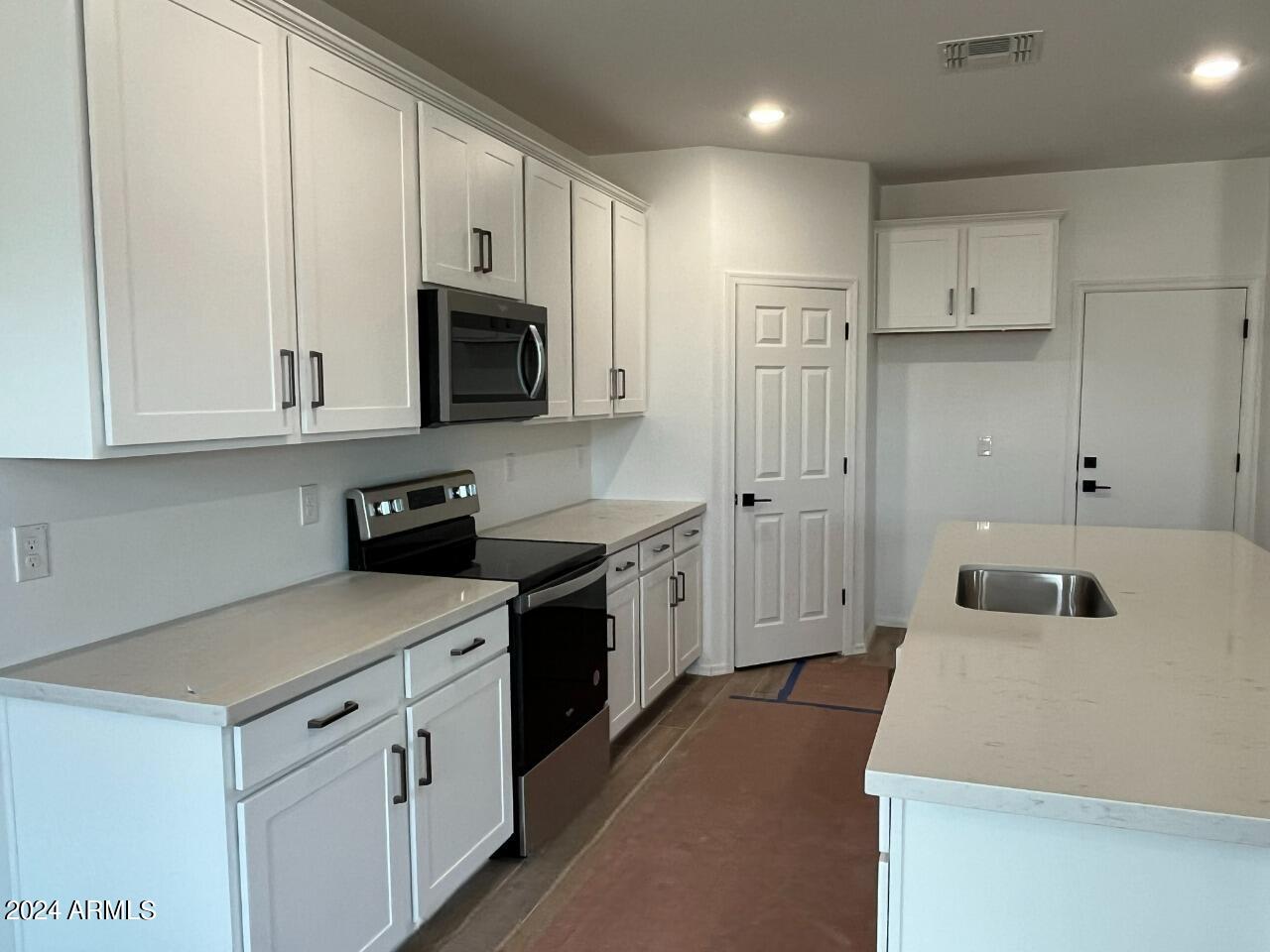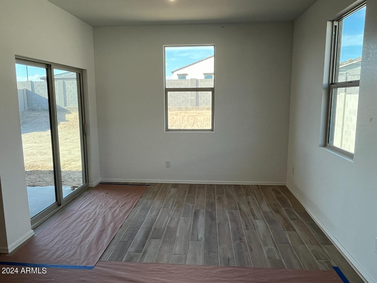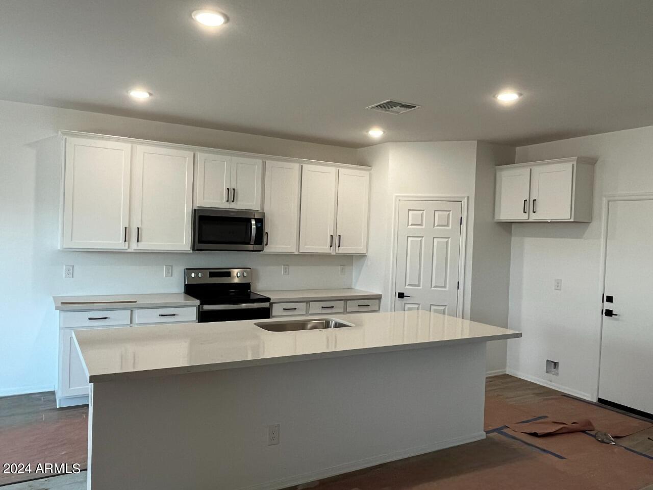 New Home under construction. Estimated completion April 2024. The home has a modern desert exterior with a desert landscape. Two secondary bedrooms and a bathroom sit in the front of the home while the primary bedroom sits in the back creating a split floorplan concept. The open concept of the kitchen and living area make this space great for entertaining and the sliding door opens up the dinning area to the back patio. The kitchen offers a walk-in pantry, white cabinets, backsplash, Island with quartz countertop, stainless steel appliances including fridge, 6x36 wood looking plan tile. In the primary suite there is a walk in shower and his and her sinks making it easier to get ready for the day. This home also includes a washer, dryer, bilnds & garage opener.