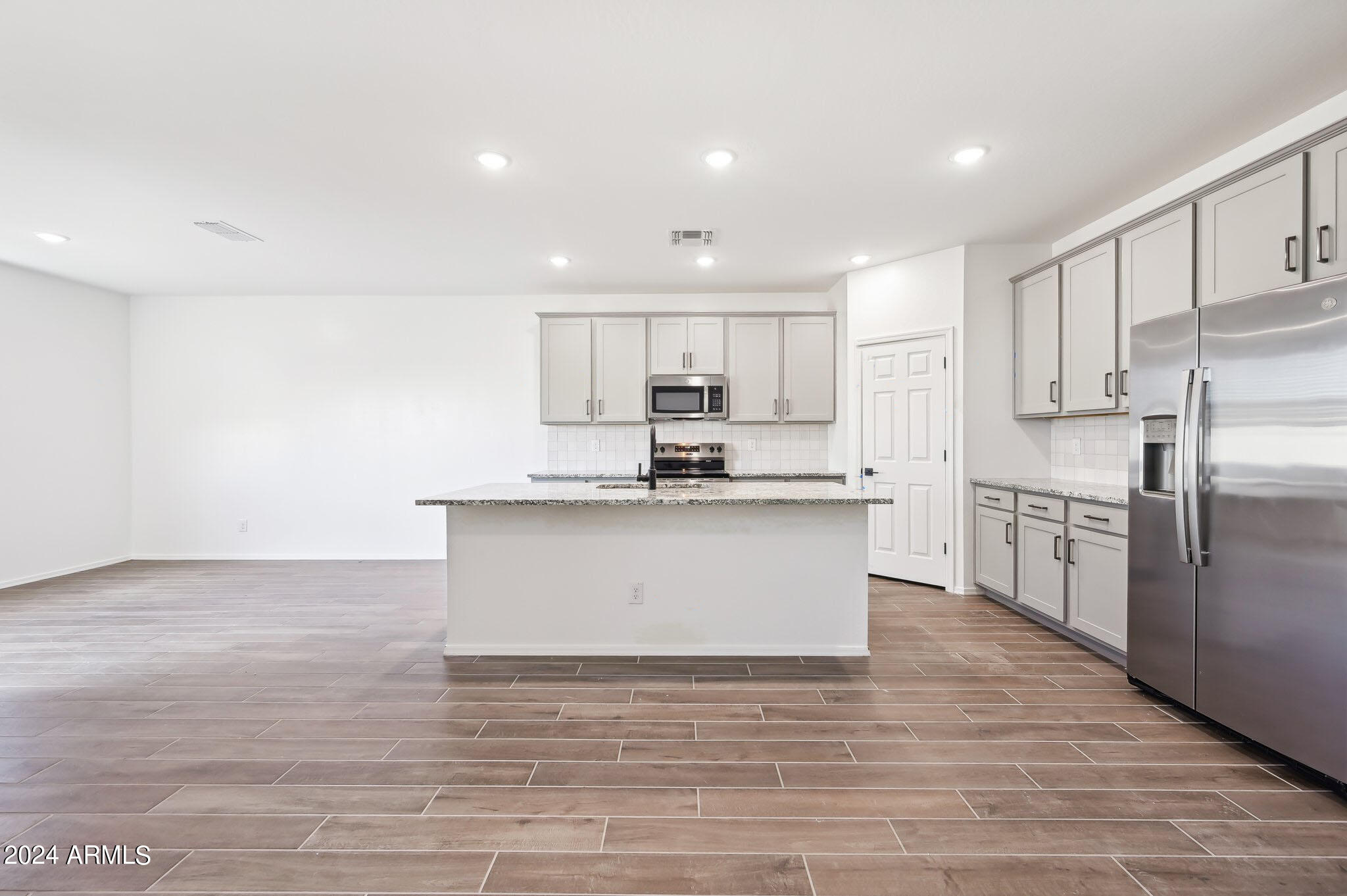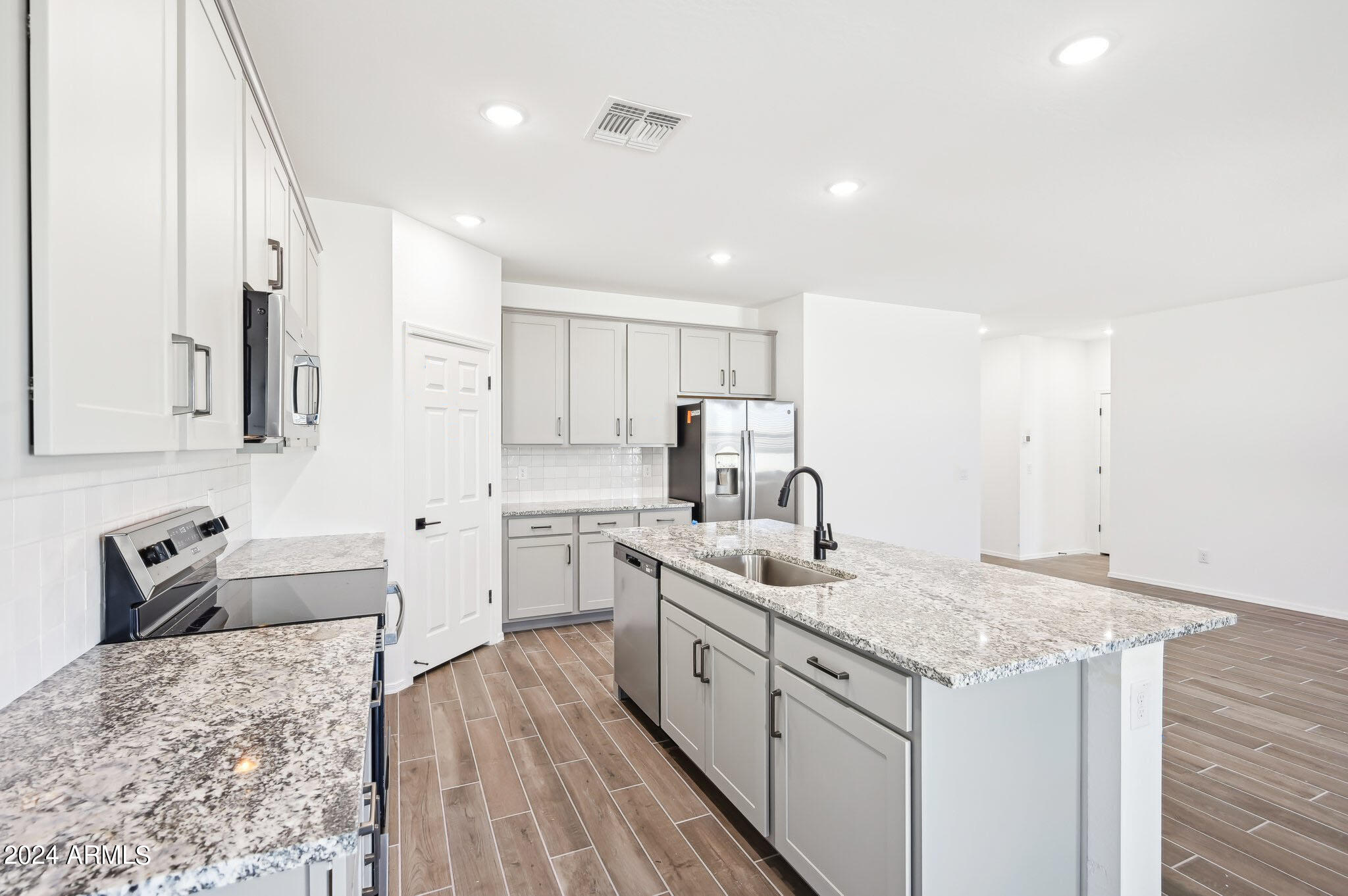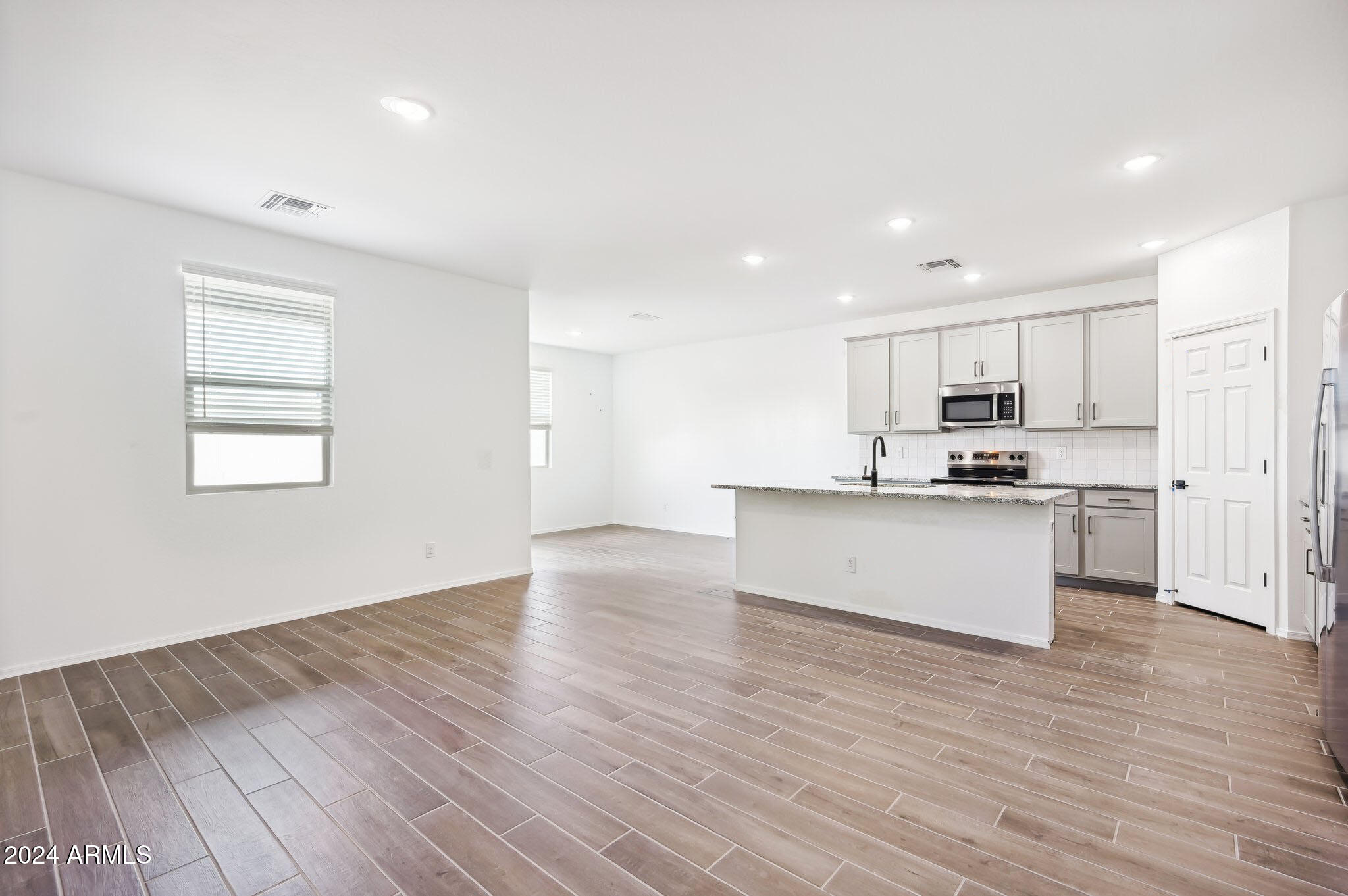 The open concept floor plan creates a seamless flow throughout the main living areas, ideal for entertaining and everyday living. The kitchen is a chef's delight boasting 42-inch upper gray cabinets with handles, large island, and granite countertops. The wood-look tile flooring throughout the main areas adds warmth and style, while the cozy carpeted bedrooms ensure a soft and inviting retreat.