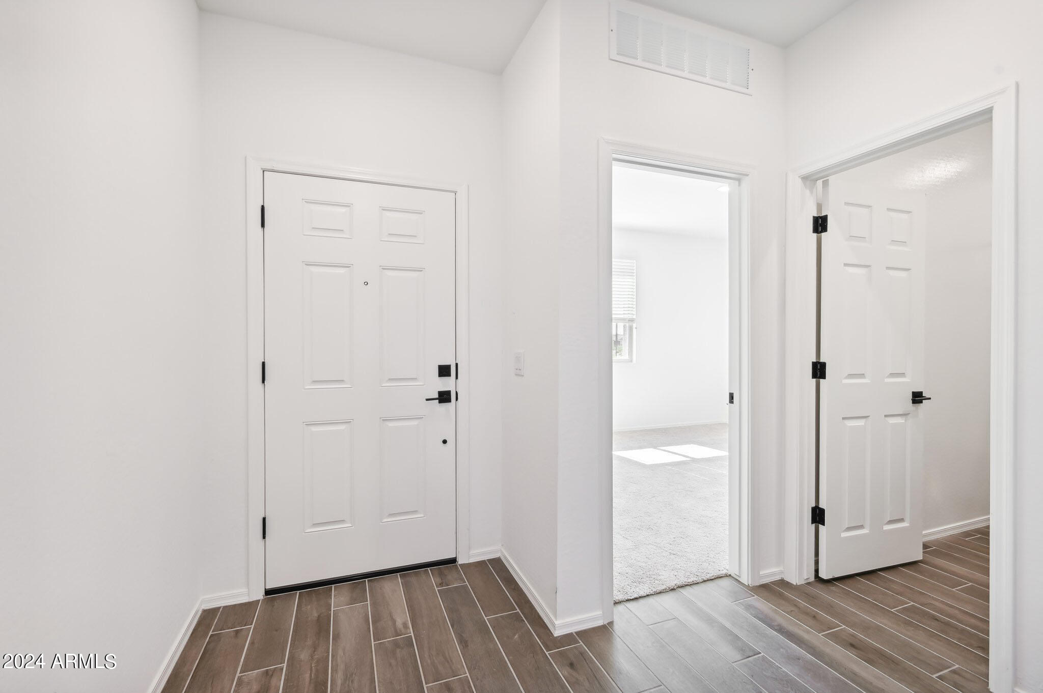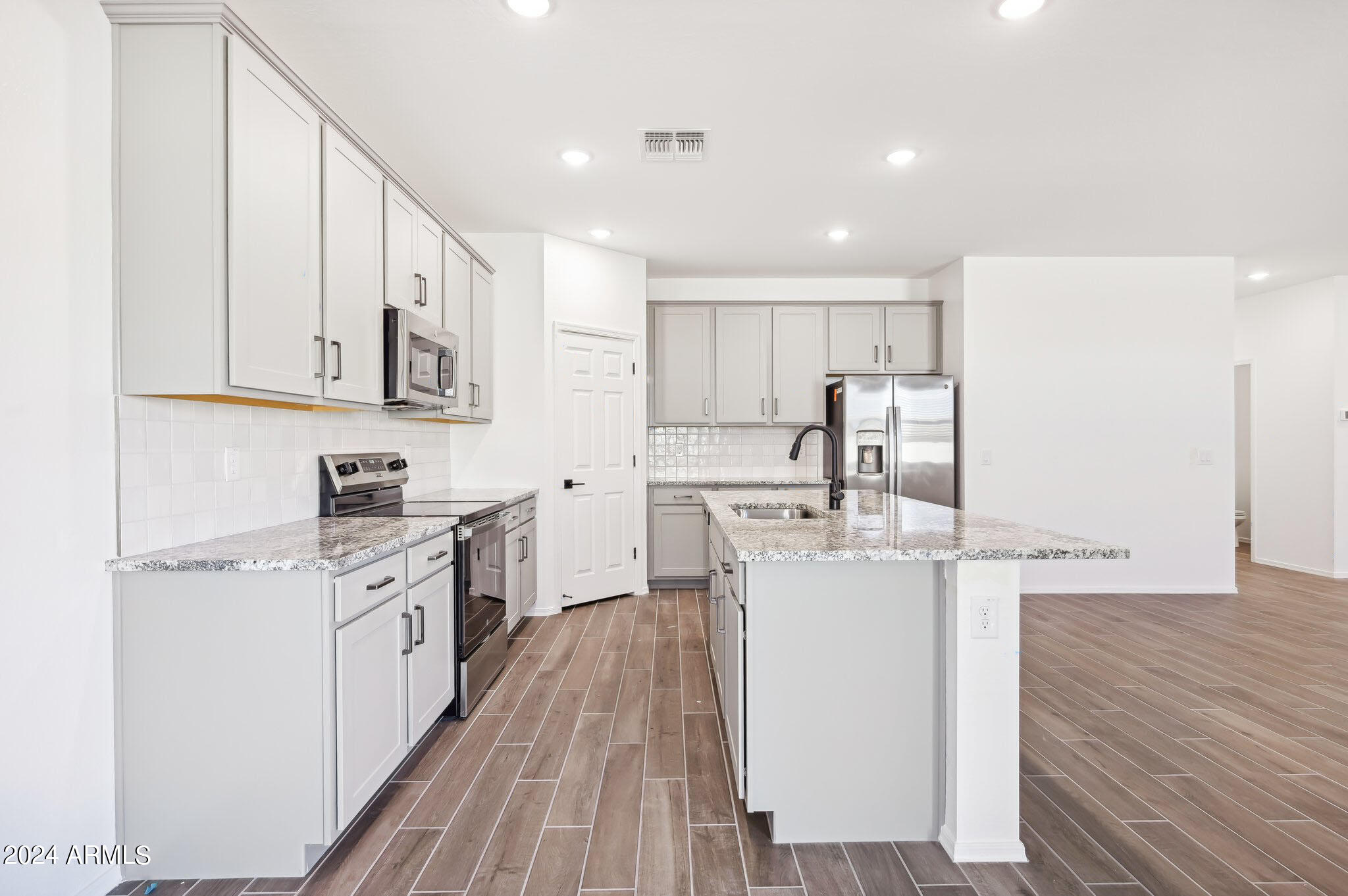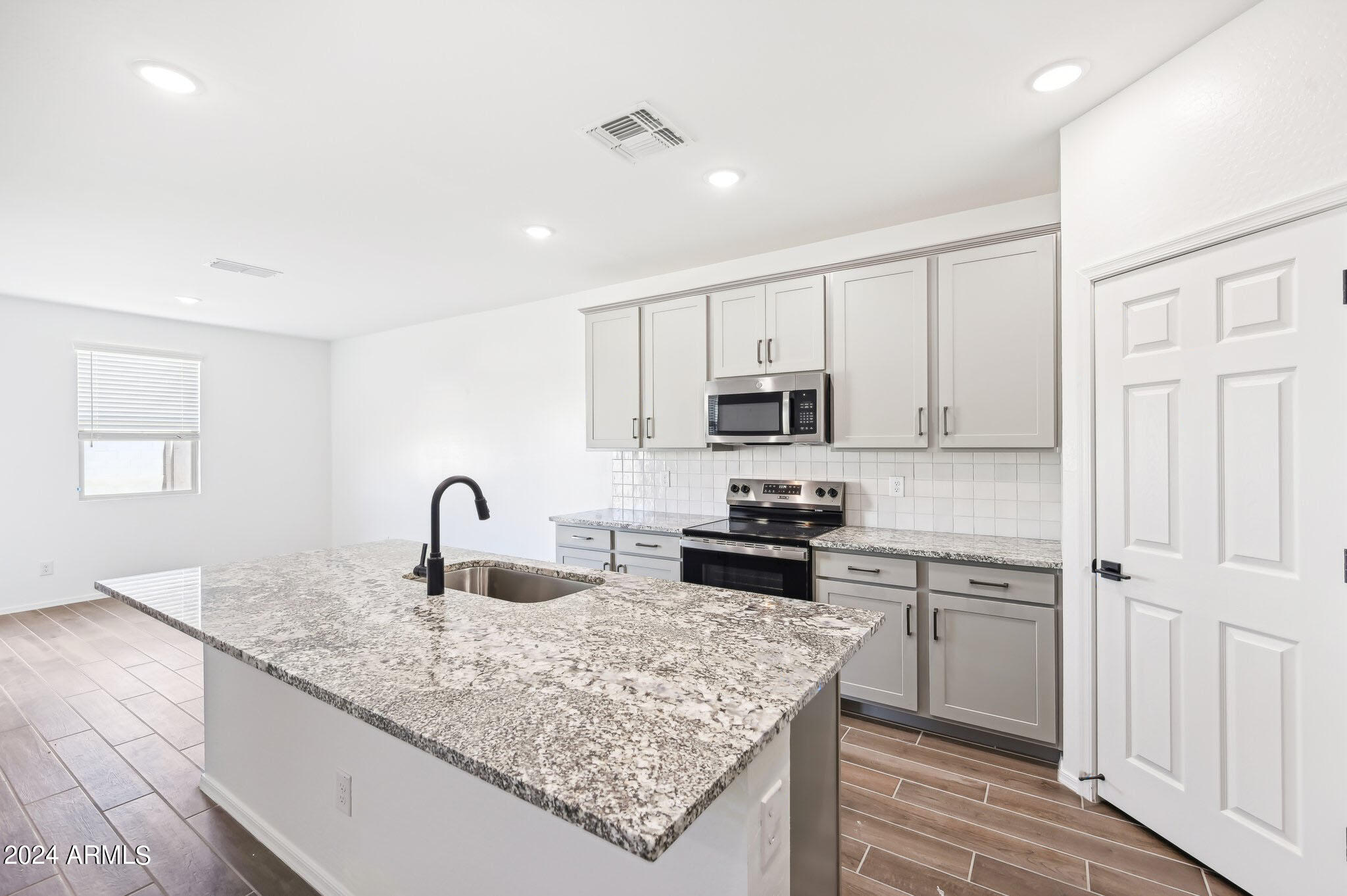 The open concept floor plan creates a seamless flow throughout the main living areas, ideal for entertaining and everyday living. The kitchen is a chef's delight boasting 42-inch upper gray cabinets with handles, large island, and granite countertops. The wood-look tile flooring throughout the main areas adds warmth and style, while the cozy carpeted bedrooms ensure a soft and inviting retreat.