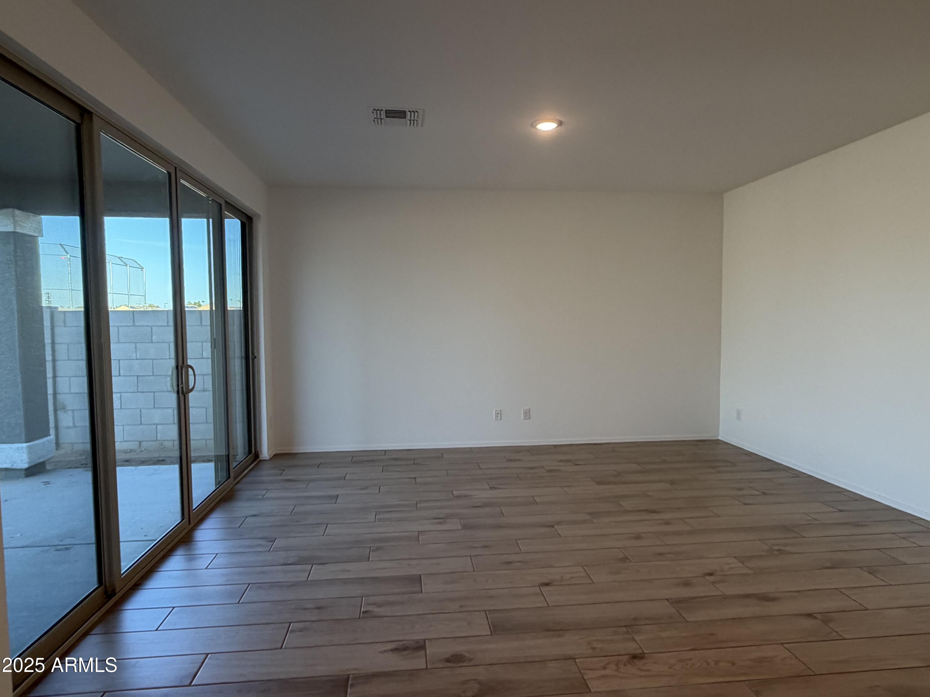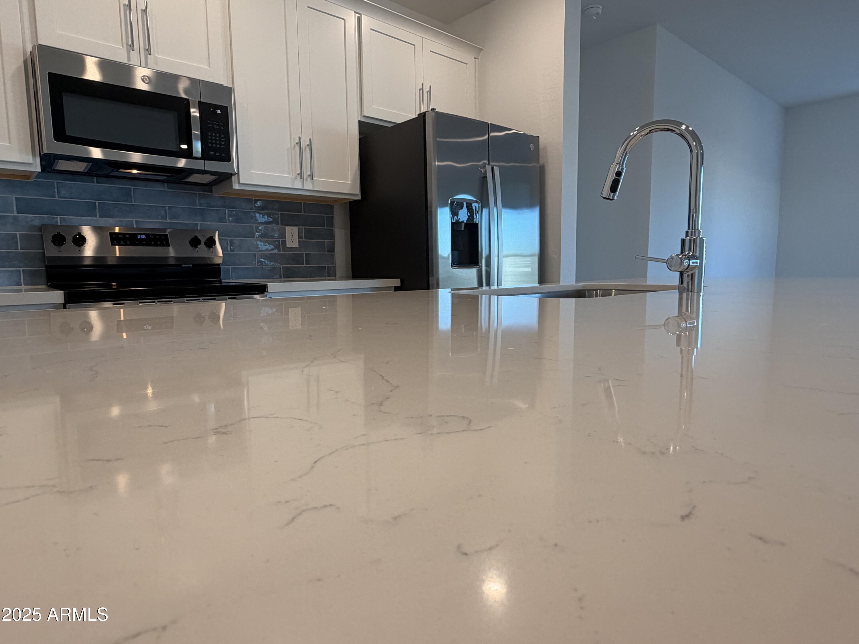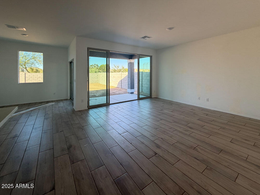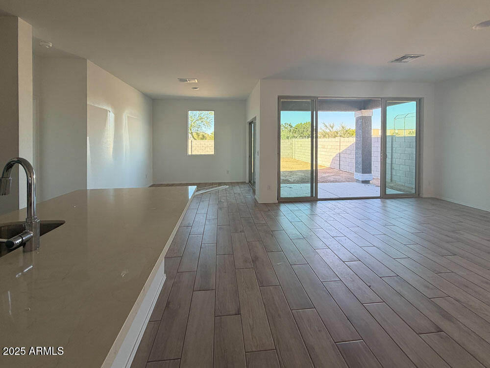 The open-concept design boasts soaring nine-foot ceilings that create a bright and welcoming atmosphere, while a four-panel center glass door seamlessly connects the living area to the backyard for effortless indoor-outdoor entertaining. The kitchen flows naturally into the dining and living spaces, making it ideal for family gatherings or casual meals. Included features such as a farm-style single kitchen sink, stainless steel refrigerator, washer, dryer, window blinds, soft water plumbing, and a garage door opener make this home truly move-in ready.