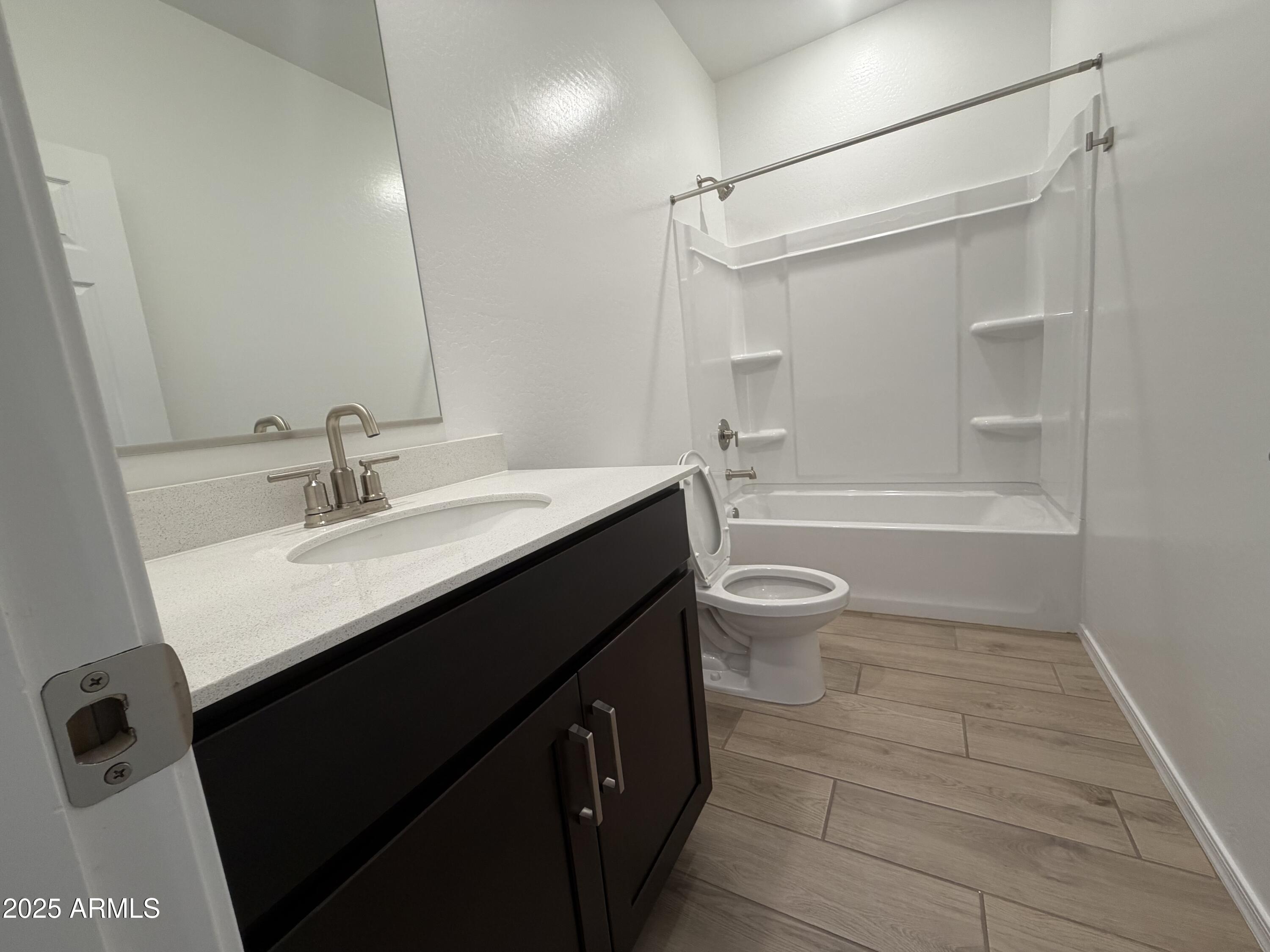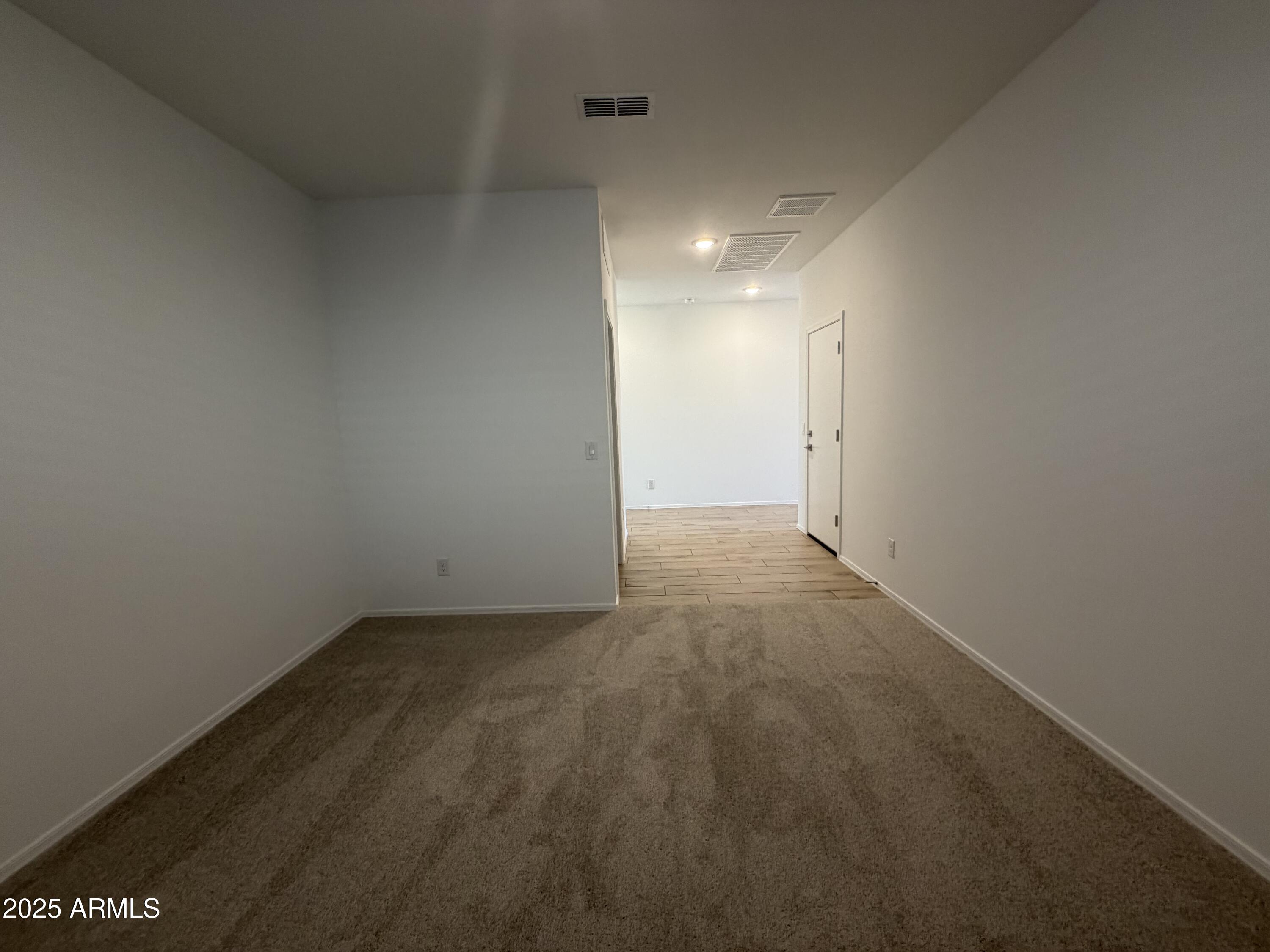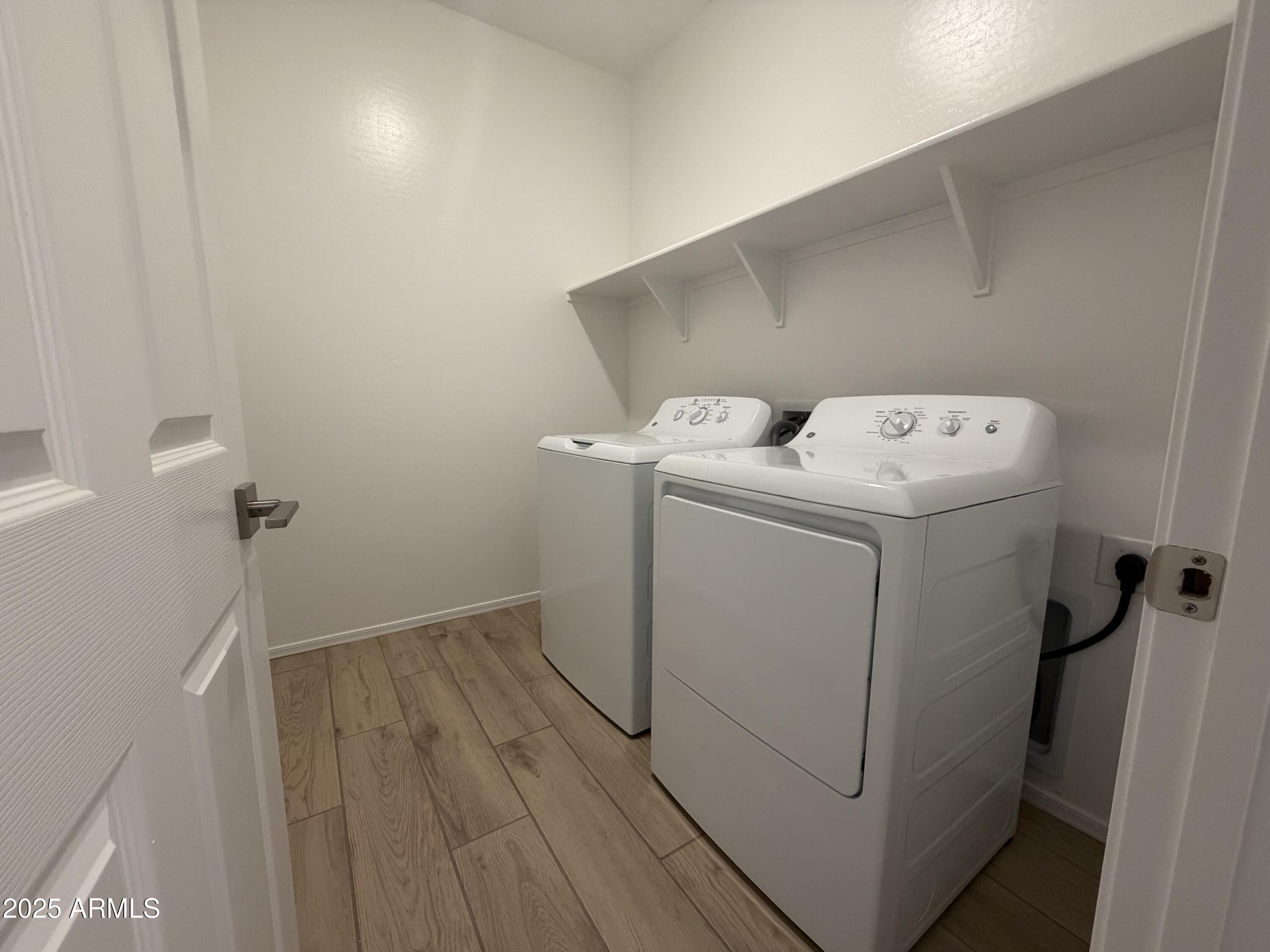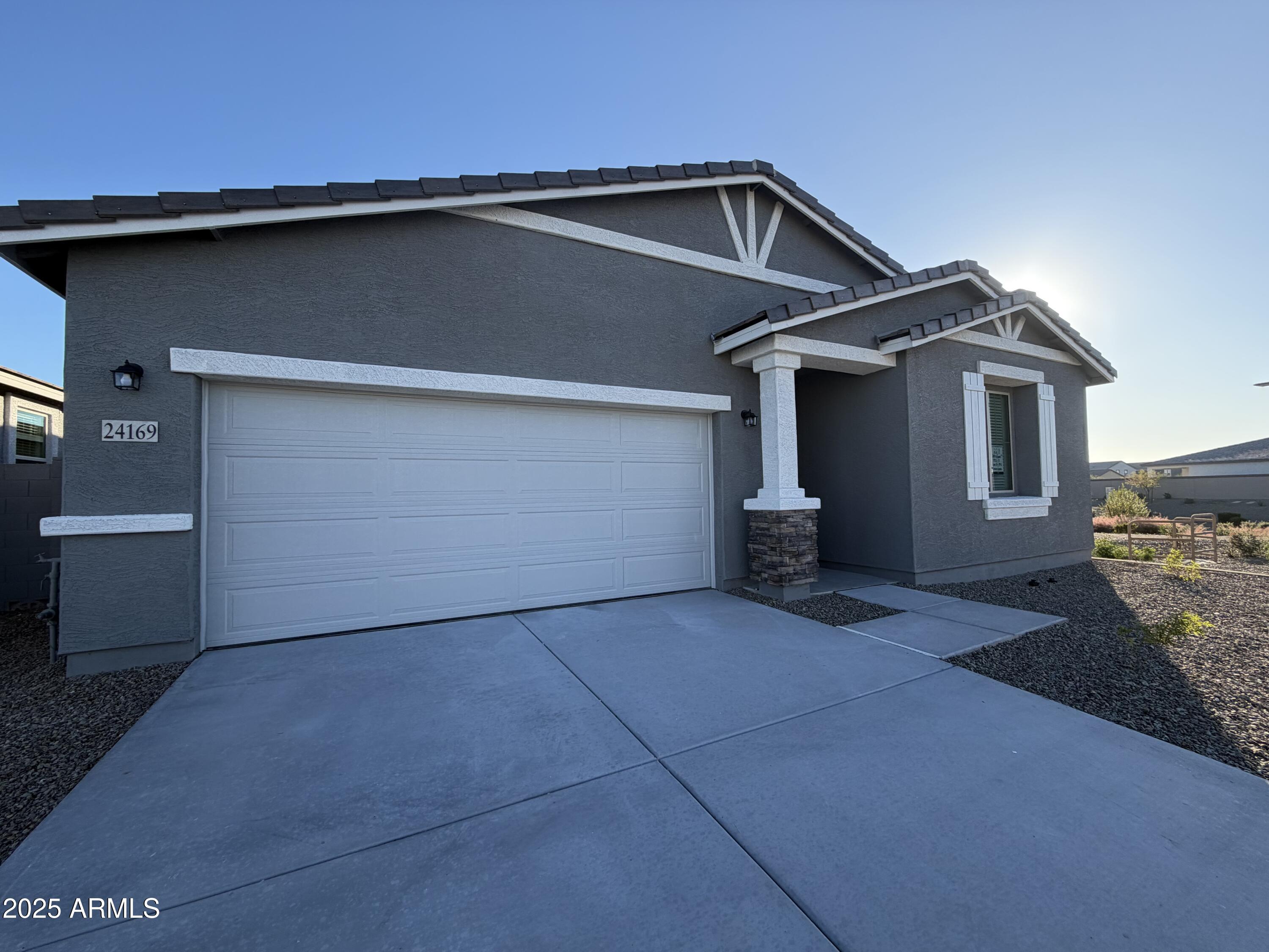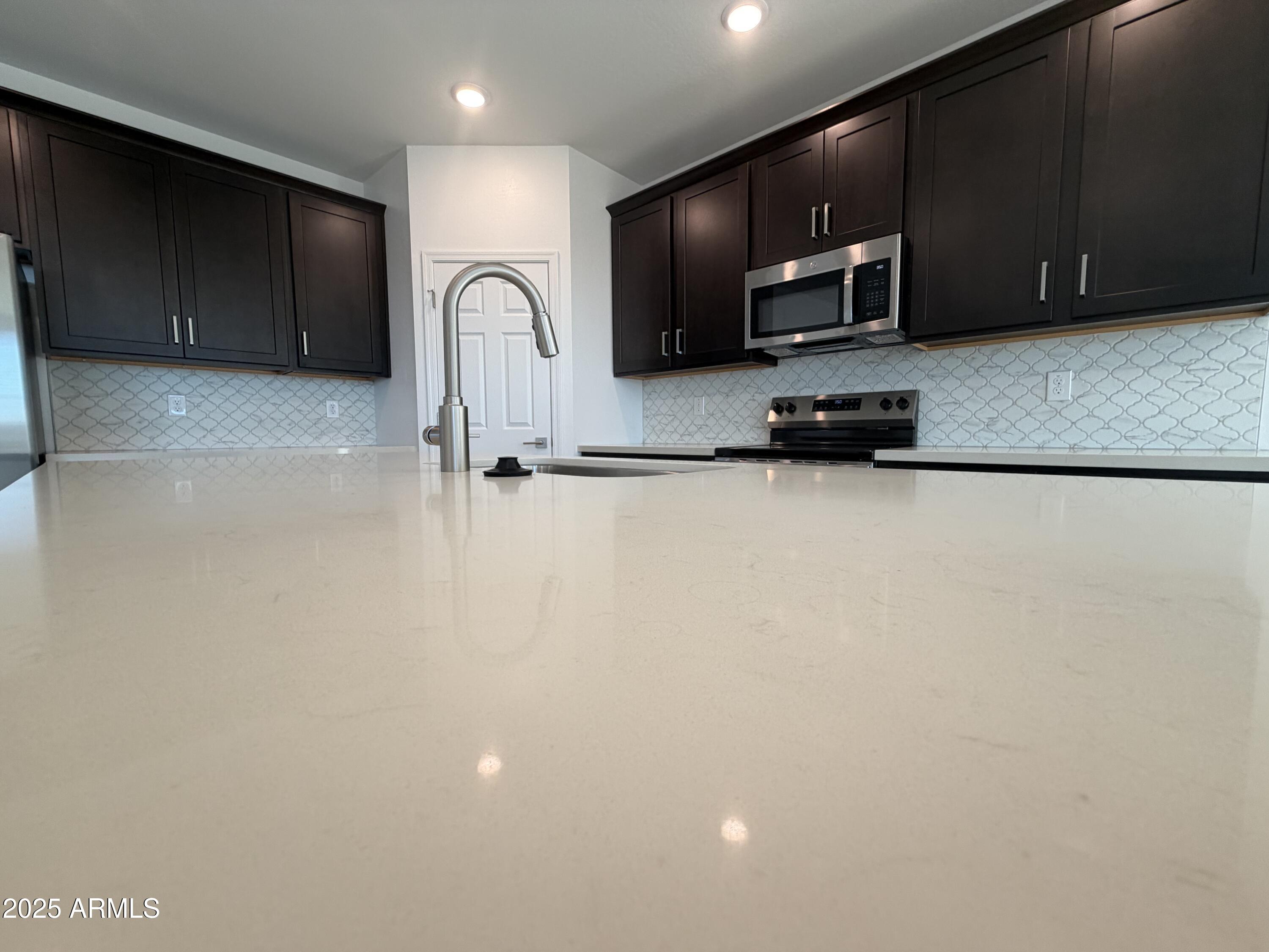 Step into refined living with this brand-new 1,953 sq. ft. residence, thoughtfully designed to blend modern style with everyday comfort. Offering 3 spacious bedrooms, 2.5 baths, and a versatile den perfect for a home office or flex space, this home embodies both functionality and elegance. The Roosevelt floor plan showcases elevated finishes throughout, including 42'' espresso cabinetry, a designer tile backsplash, and an oversized quartz island that anchors the kitchen. Stainless steel appliances, along with the refrigerator, washer, and dryer, are all included for effortless move-in convenience. Soaring 9-foot ceilings and an open-concept layout create an airy, inviting atmosphere, complemented by 8x36 wood-look tile that brings warmth and continuity through the main living areas. Plush carpet in the bedrooms offers cozy retreats, while 2" blinds throughout add privacy and polish. A 4-panel sliding glass door seamlessly connects the living space to a covered patio, ideal for relaxing evenings or weekend entertaining. With a soft water loop, 2-car garage, and carefully curated finishes, every detail has been considered to enhance daily living. Whether hosting guests, working from home, or enjoying quiet evenings in, this home delivers the perfect balance of luxury and livability.