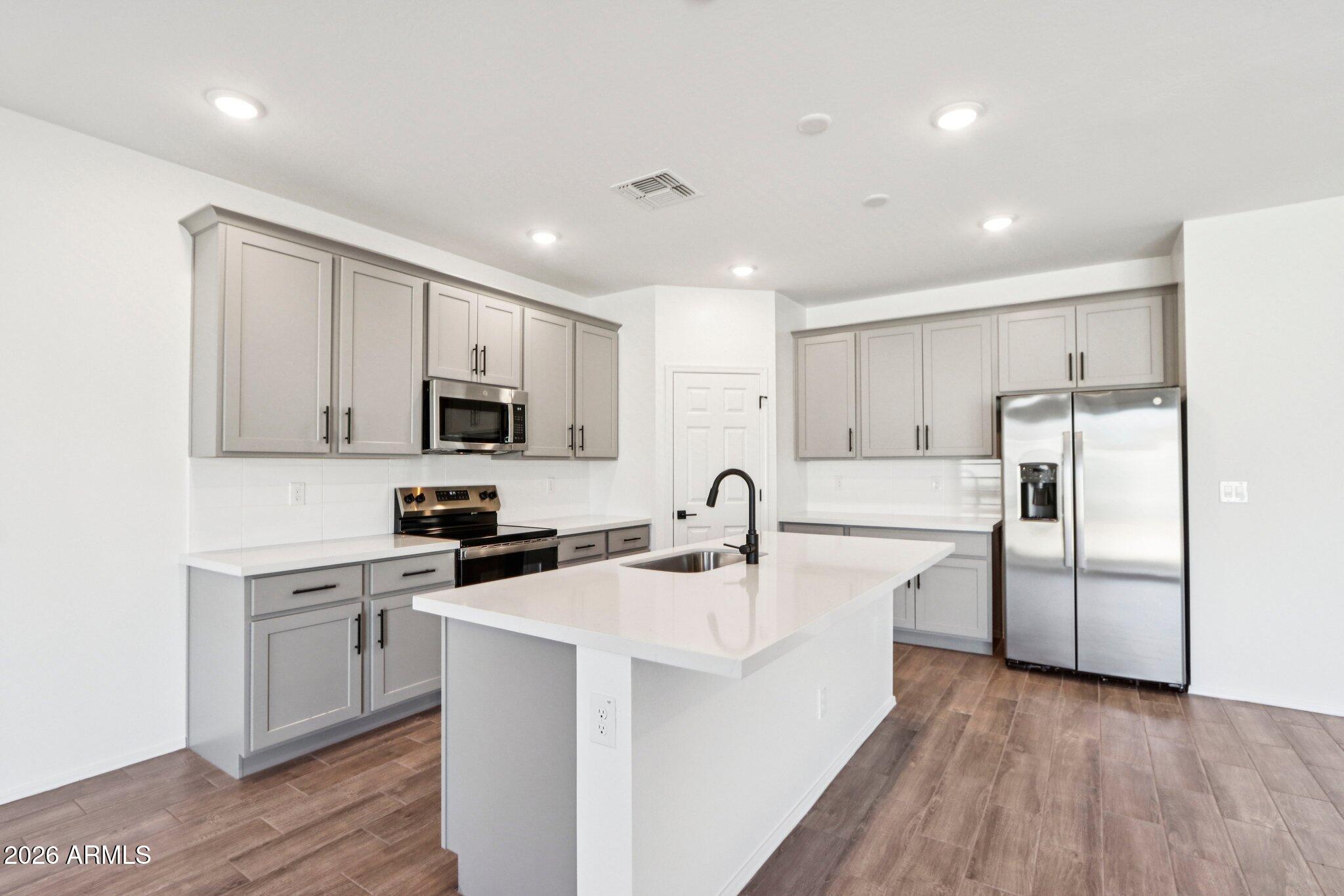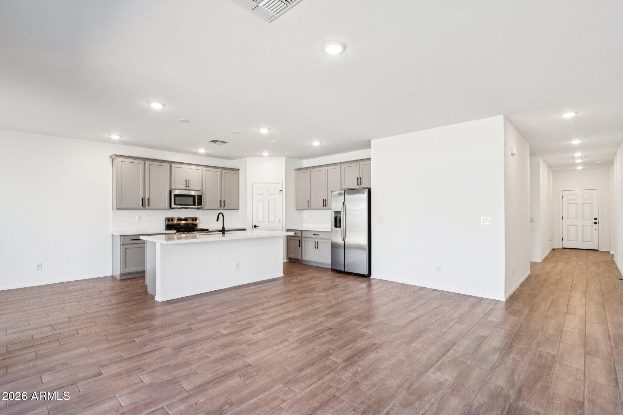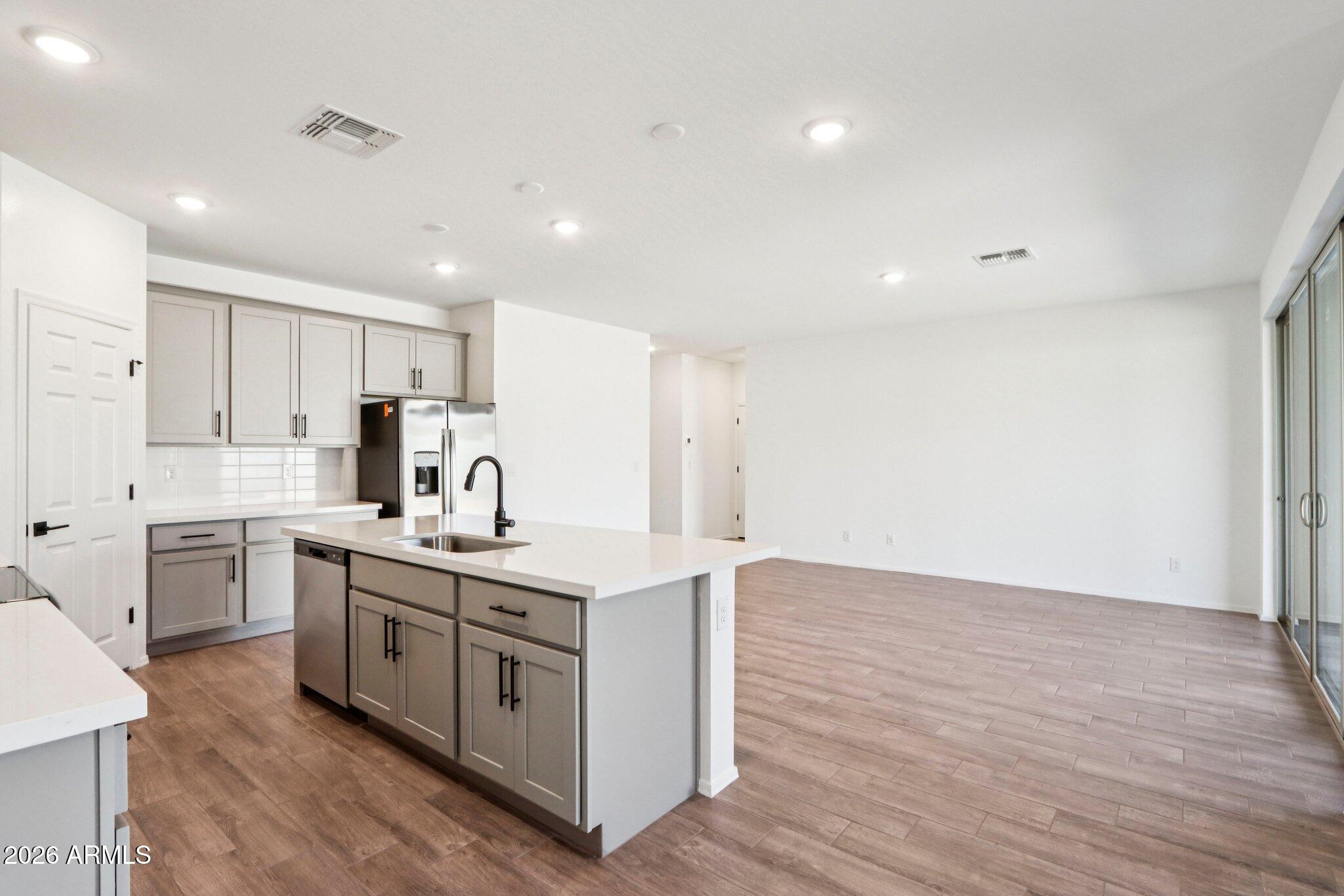 Welcome to refined living in this thoughtfully designed 1,949 sq. ft. new build featuring 3 bedrooms, 2.5 bathrooms, and a versatile den--perfect for a home office or private retreat. The kitchen is the heart of the home, showcasing our designer-selected Minimalist Collection with 42'' gray cabinetry, a stylish tile backsplash, and a large quartz island ideal for entertaining or casual meals. Stainless steel appliances, including the refrigerator, add both elegance and functionality. The open-concept layout connects seamlessly to the dining and living areas, creating an inviting space for everyday living. Elegant 8x36 wood-look tile extends through the main areas, complemented by plush carpet in the bedrooms, 2'' blinds, and 9-foot ceilings for an airy feel. A 4-panel sliding glass door opens to a covered patio, perfect for relaxing or entertaining. Complete with a washer, dryer, soft water loop, and 2-car garage, this home blends modern comfort with everyday convenience.