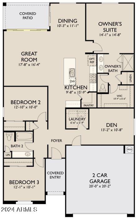 ''New Construction nestled perfectly in the sought after city of San Tan Valley! Walking into the home brings you to the first two bedrooms which share a bathroom and functional storage closet. Down the hall the large den is perfect for an extra living space. The laundry room is situated in the middle of the home and is equipeed with brand new washer and dryer! The great room, dining, and kitchen flow perfectly with plenty of sunlight coming in from the large 4-panel sliding glass door and large window. This home has been upgraded with 8 foot doors, classic white, shaker styled, 42'''' upper cabinets, white backsplash, and white quartz countertops. The wood styled cermamic tile flooring flows throughout the home with carpet in the bedrooms and den. The primary is right off the great room and offers a large bathroom with double sinks, linen closet and walk-in-closet. Besides the impressive spacious backyard, this home is upraged to inlcude a washer, dryer, fridge and blinds to make move in a breeze!