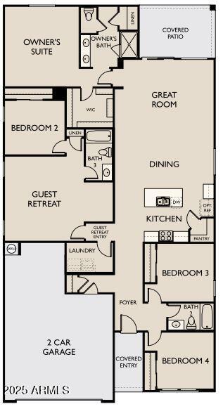 Nestled in the sought-after city of San Tan Valley, this charming 2,219 sq. ft. single-story Sunflower floor plan boasts 4 bedrooms, 3 bathrooms, a guest retreat, and a 2.5-car garage. This beautiful home features the Coastal Collection, which includes 8-foot interior doors, stainless steel appliances, quartz kitchen countertops, a stunning backsplash, and 42-inch upper white shaker-style cabinets. The 4-panel glass slider off the living room provides a lovely entry to the spacious backyard, perfect for a private pool. The primary suite is generously sized, offering a spacious bathroom and a walk-in closet. This home also comes equipped with a washer, dryer, refrigerator, garage door opener, soft water rough in, and blinds, making it move-in ready. Conveniently located near Combs Rd and Schnepf Rd, the community features a beautiful lake, bike paths, and pickleball courts.