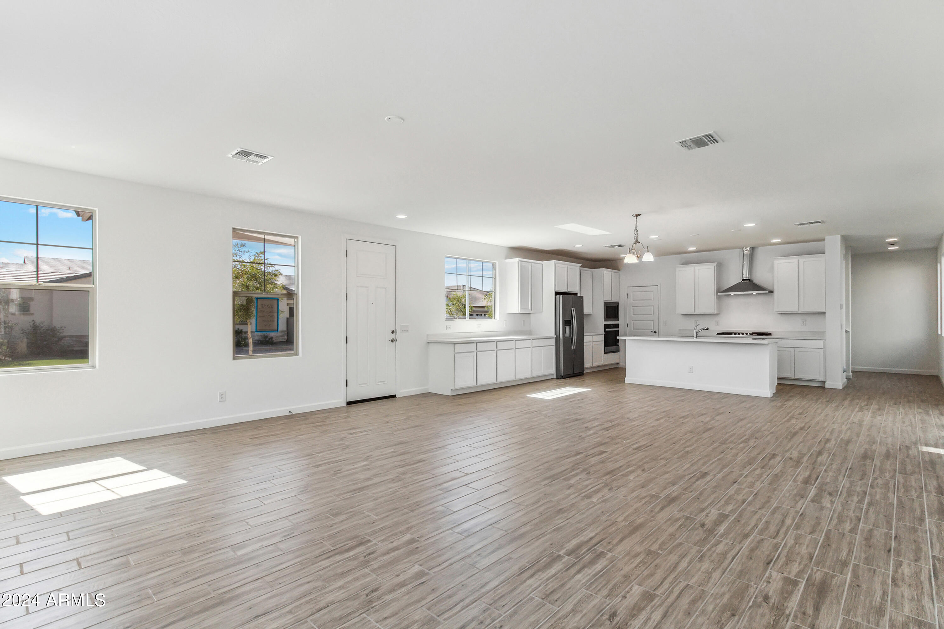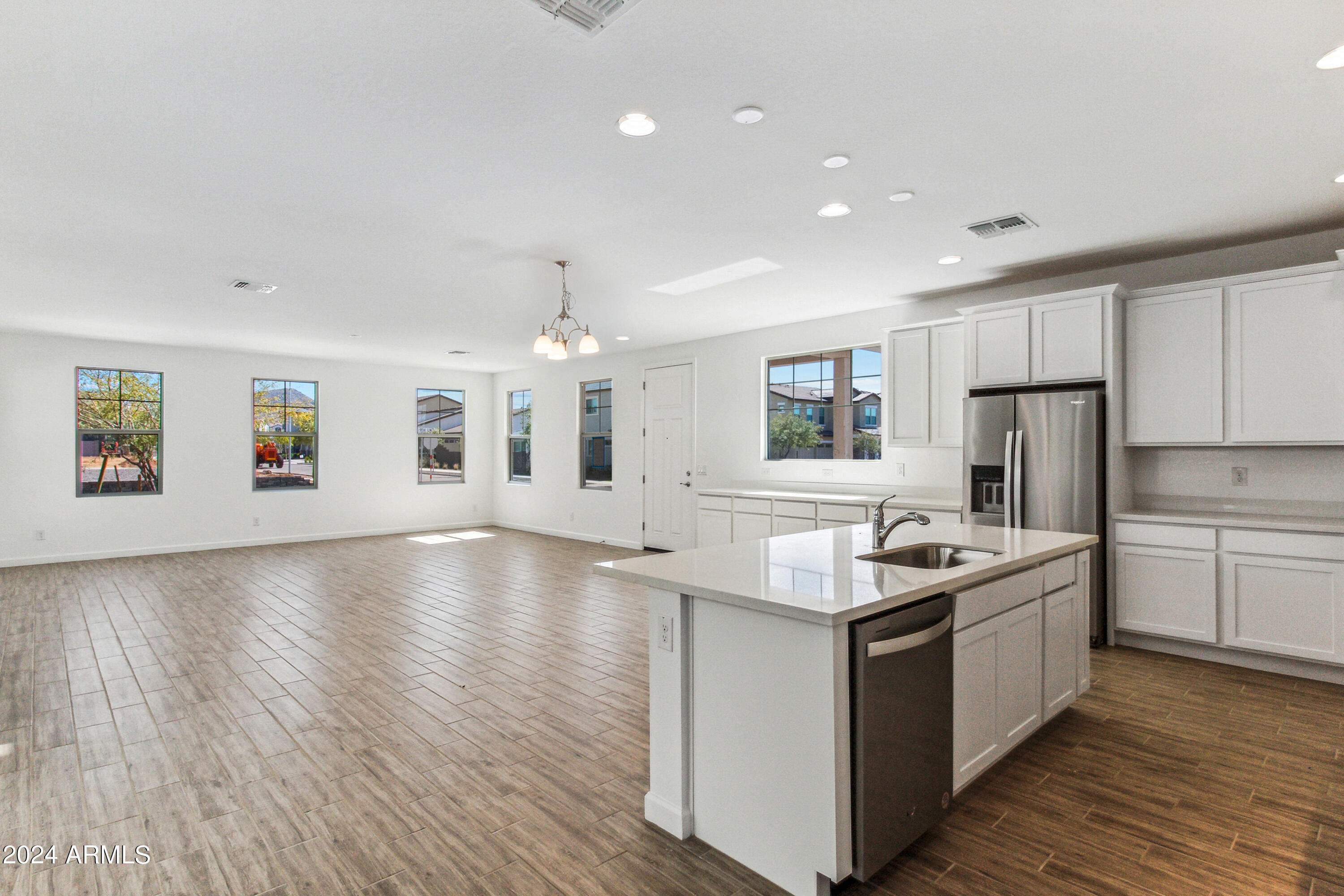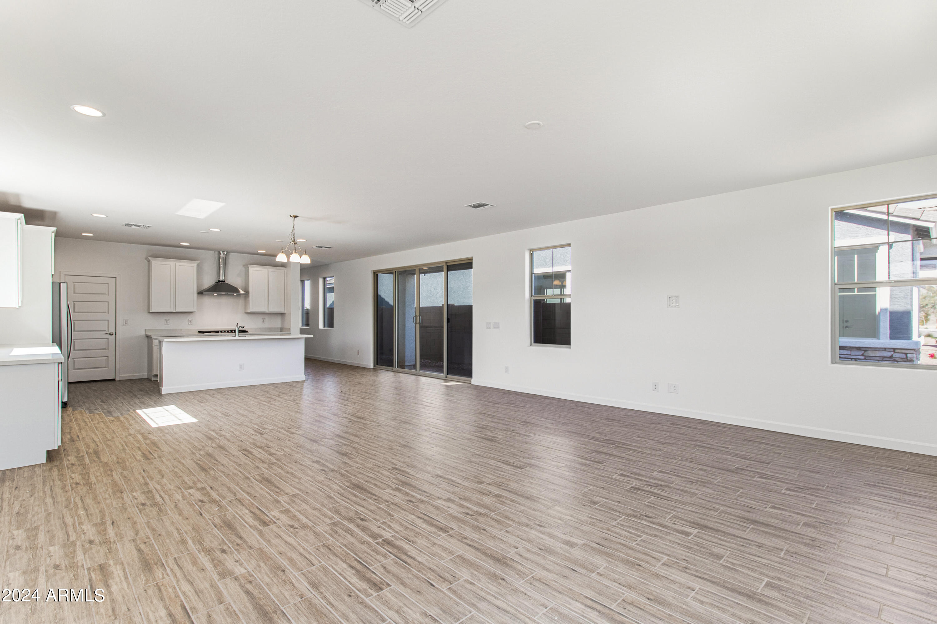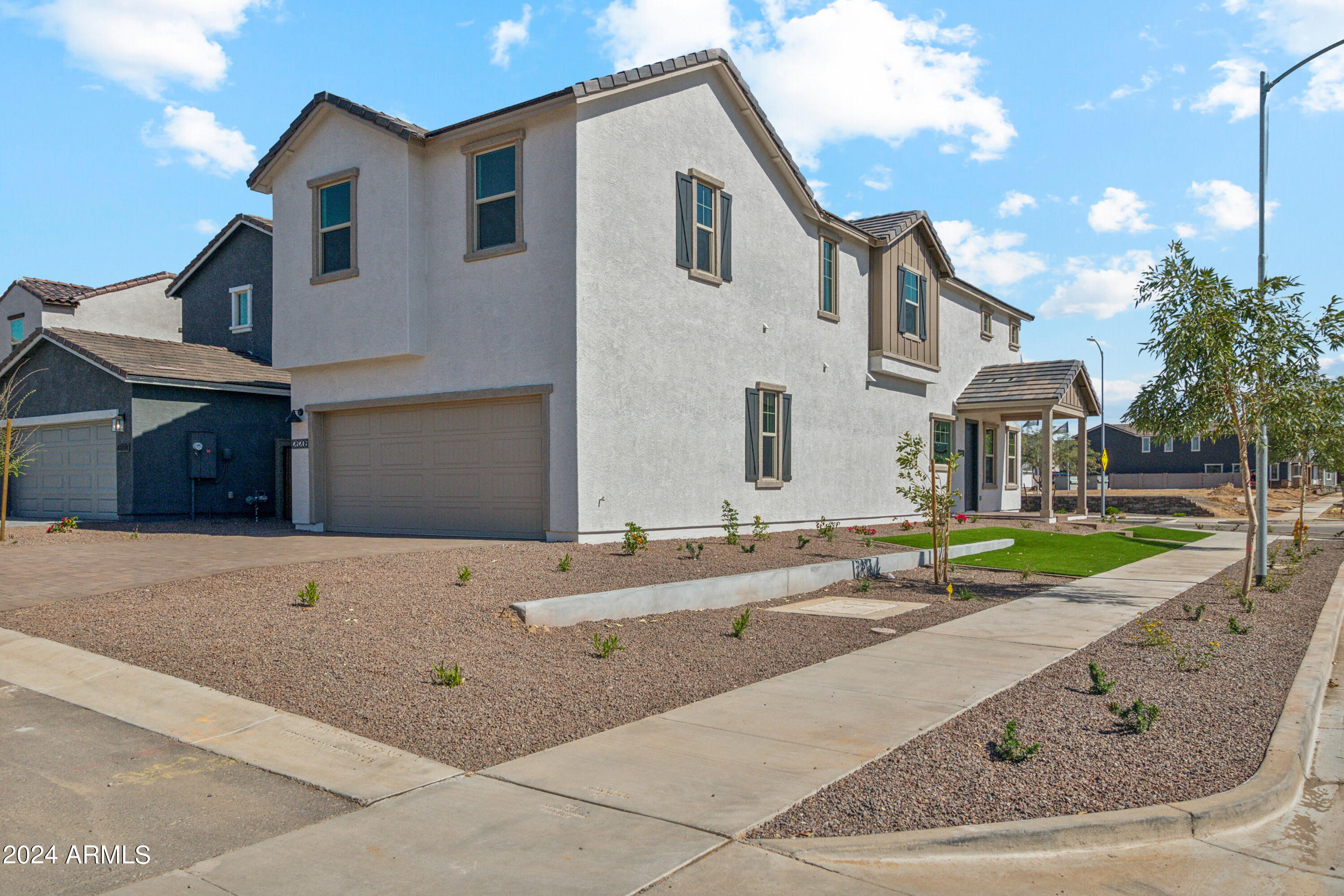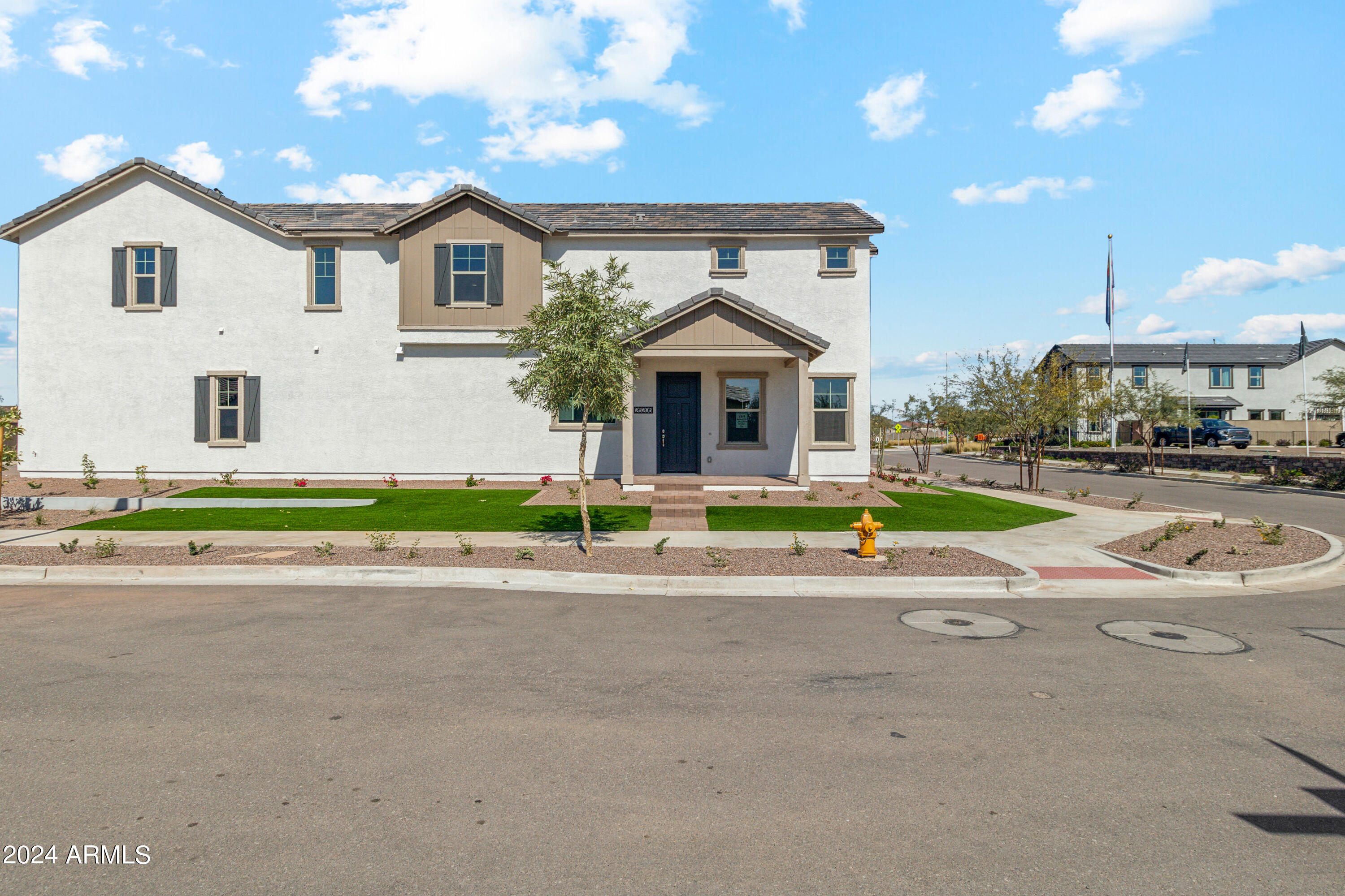 Tree-lined streets, pedestrian-friendly sidewalks and a 5,500 sf recreation center with resort style pool an kiddie pool, shaded ramadas, parks, gathering areas, pickelball courts and basketball. Close to I-10, 101 and 303. Walking distance to restaurants, movies, entertainment and shopping. This stunning two-story home is nestled on a spacious corner lot that includes a rare driveway, boasting farmhouse architecture that exudes charm and character. The professionally landscaped turf front yard and inviting pavered front porch create a warm and welcoming curb appeal. Step inside and be greeted by the open-concept living space, featuring 8' interior doors and square corner bead drywall. The great room is bathed in natural light thanks to the expansive 4-panel sliding glass door.