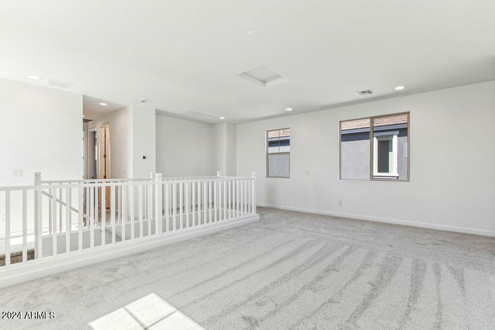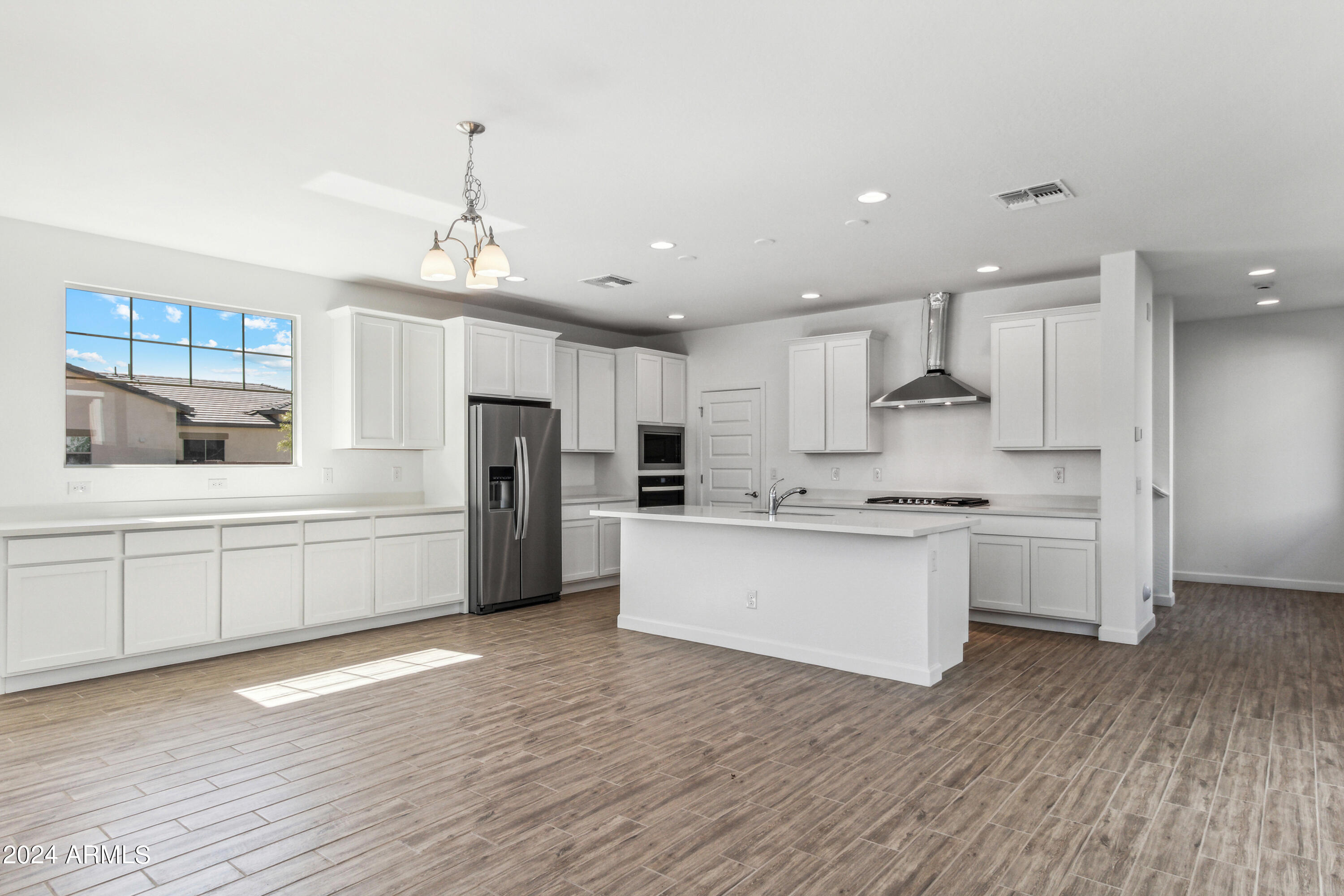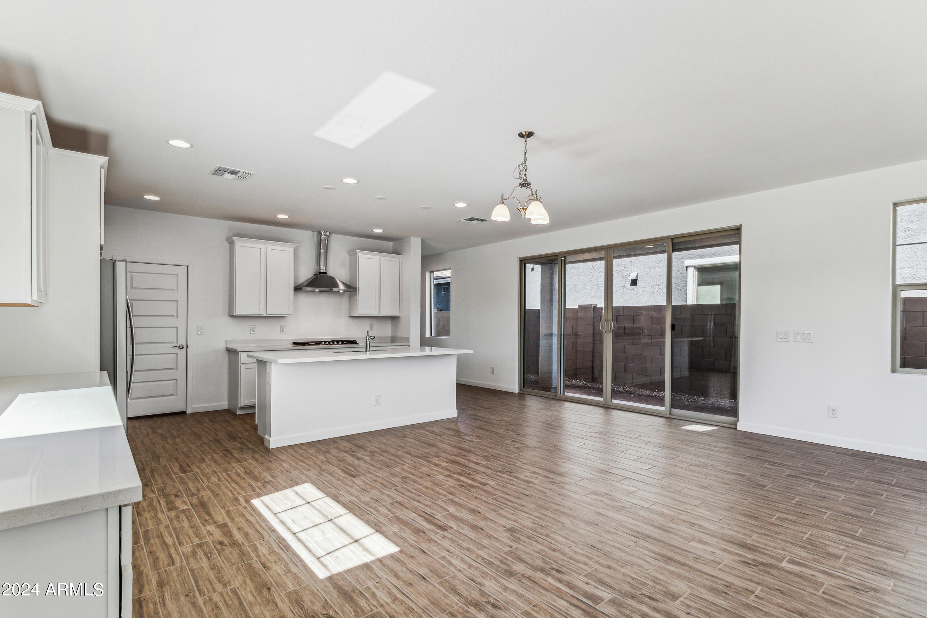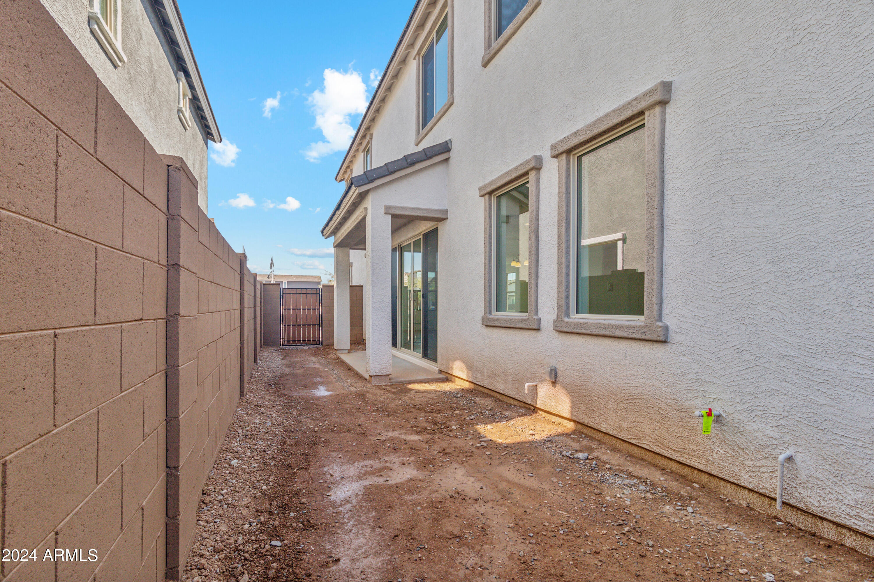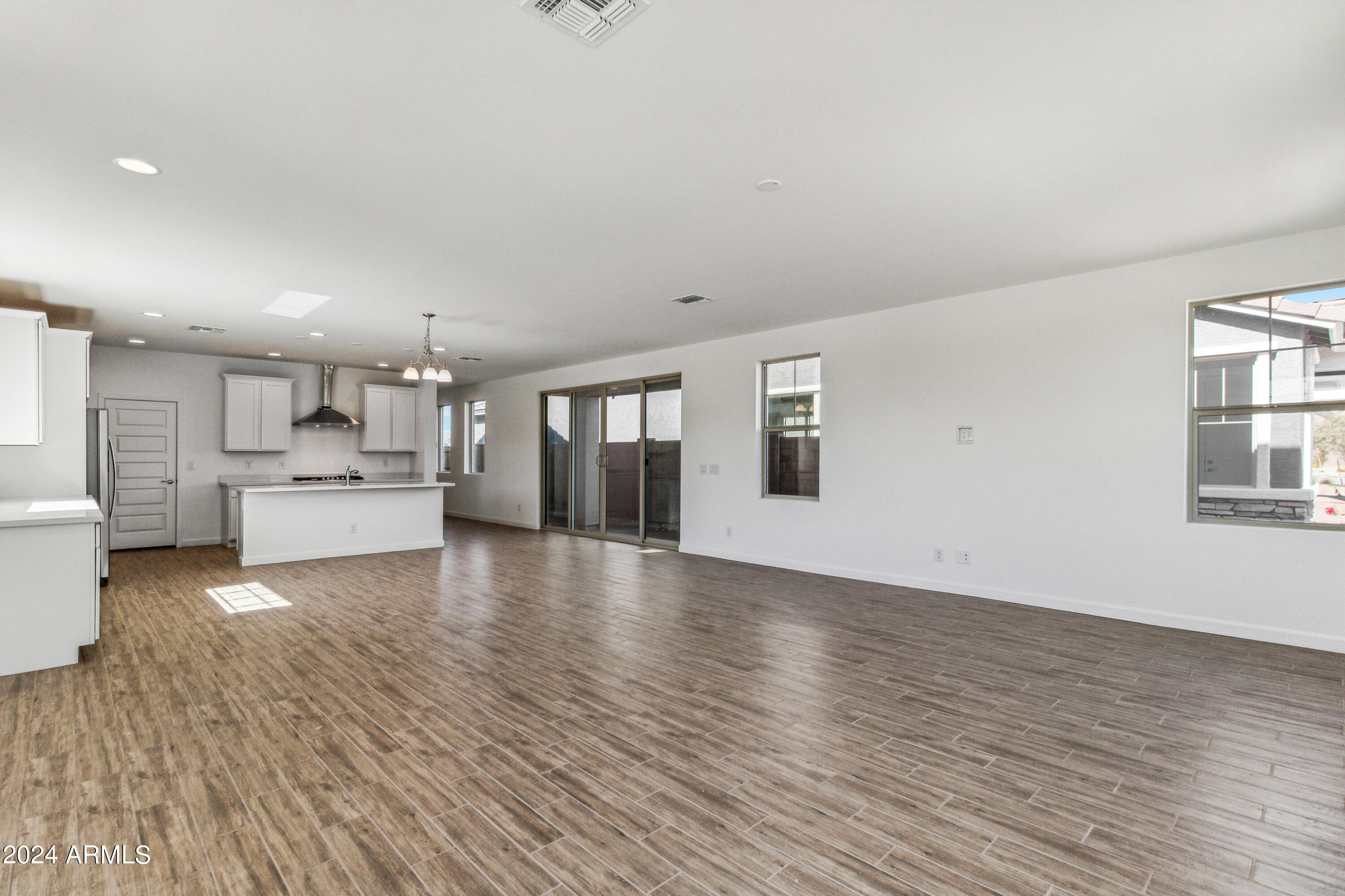 Tree-lined streets, pedestrian-friendly sidewalks and a 5,500 sf recreation center with resort style pool an kiddie pool, shaded ramadas, parks, gathering areas, pickelball courts and basketball. Close to I-10, 101 and 303. Walking distance to restaurants, movies, entertainment and shopping. This stunning two-story home is nestled on a spacious corner lot that includes a rare driveway, boasting farmhouse architecture that exudes charm and character. The professionally landscaped turf front yard and inviting pavered front porch create a warm and welcoming curb appeal. Step inside and be greeted by the open-concept living space, featuring 8' interior doors and square corner bead drywall. The great room is bathed in natural light thanks to the expansive 4-panel sliding glass door.