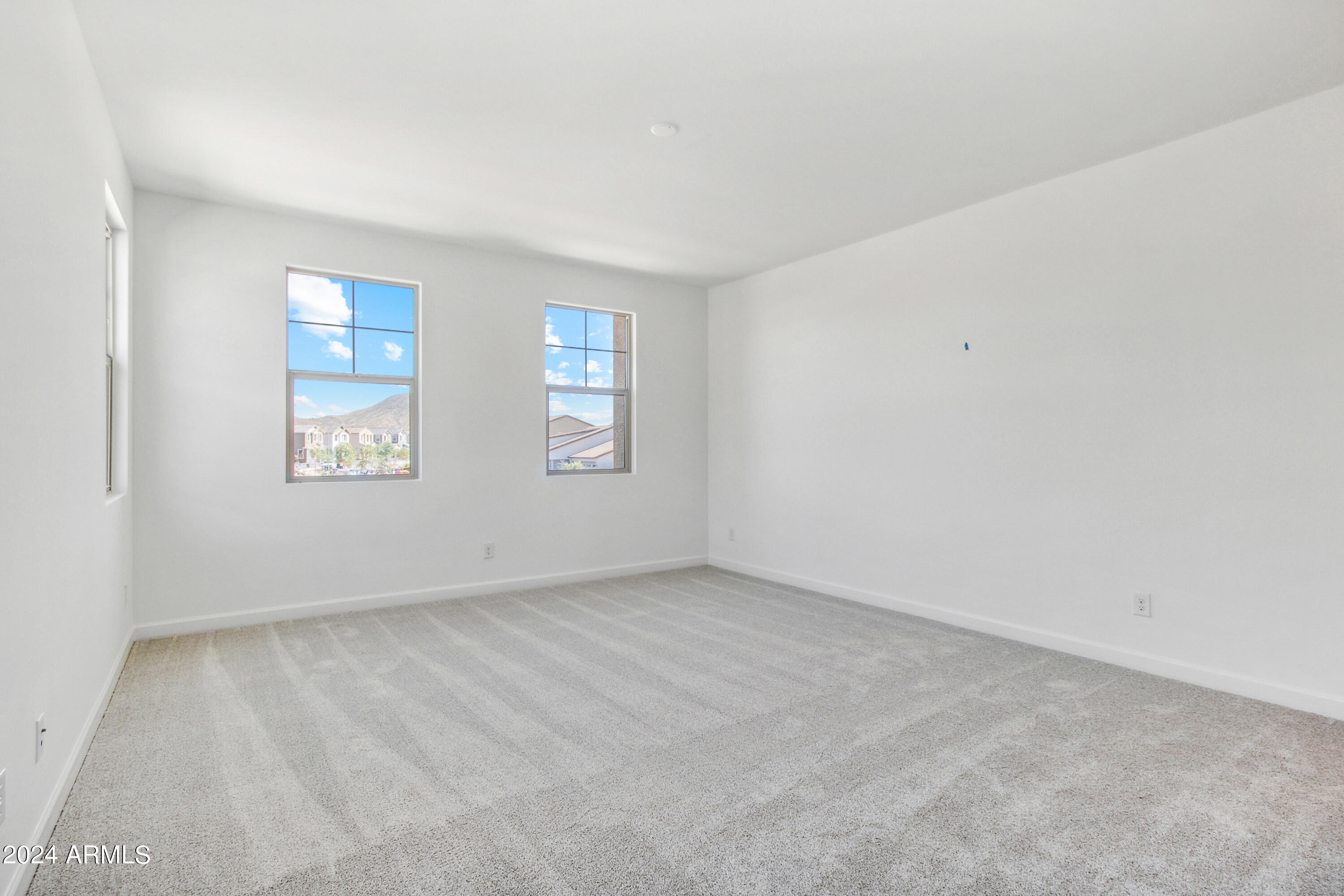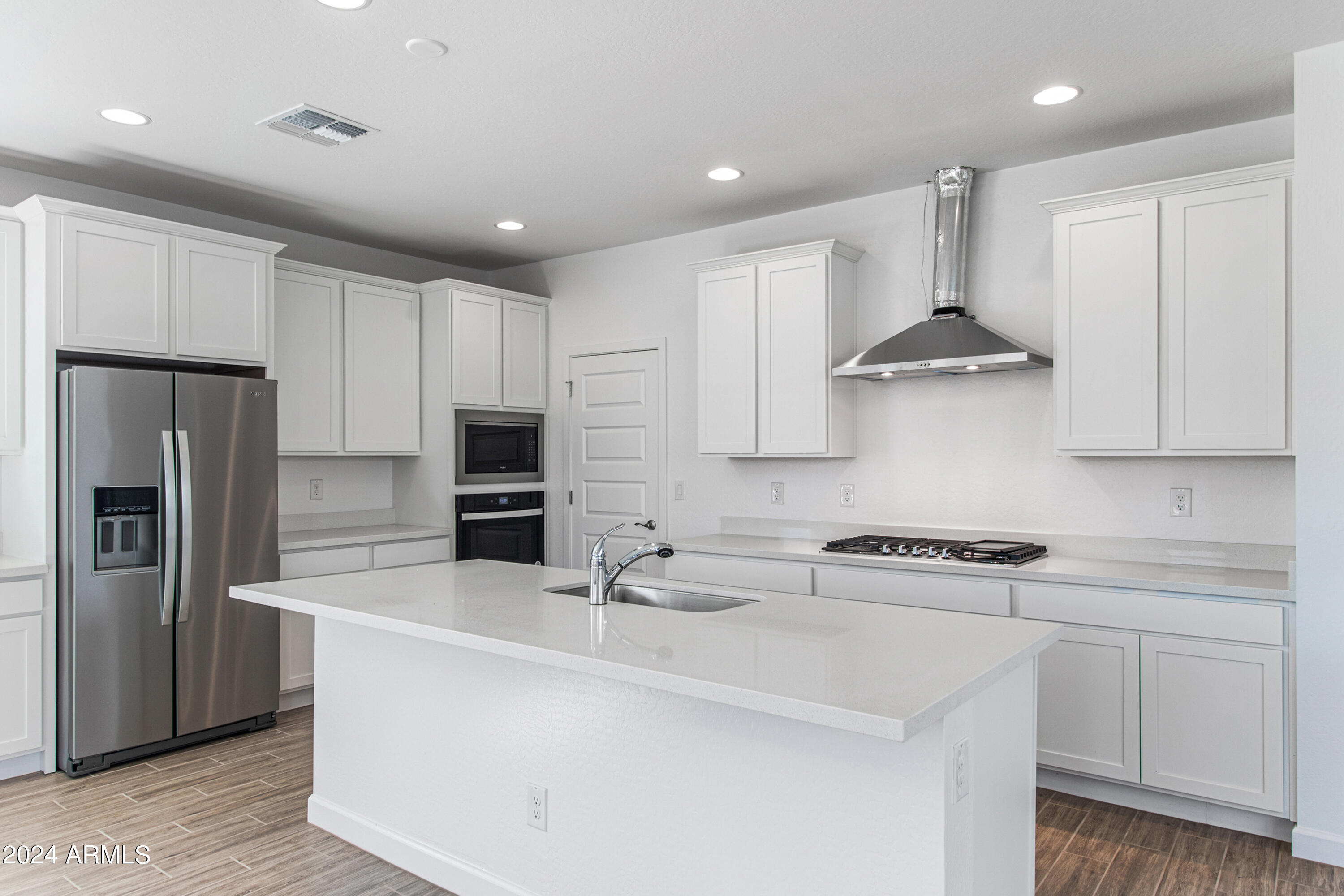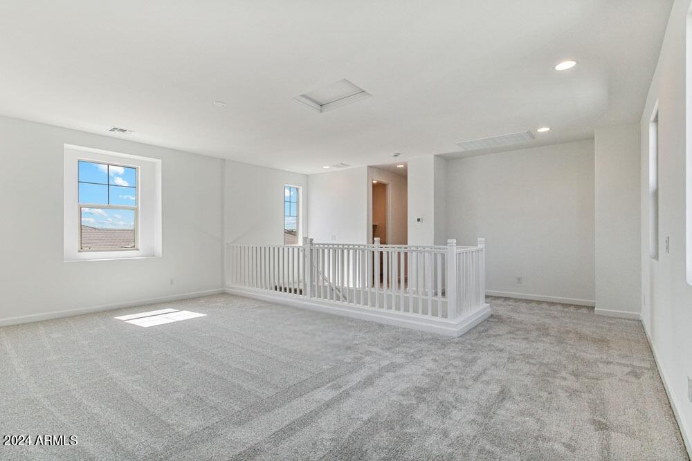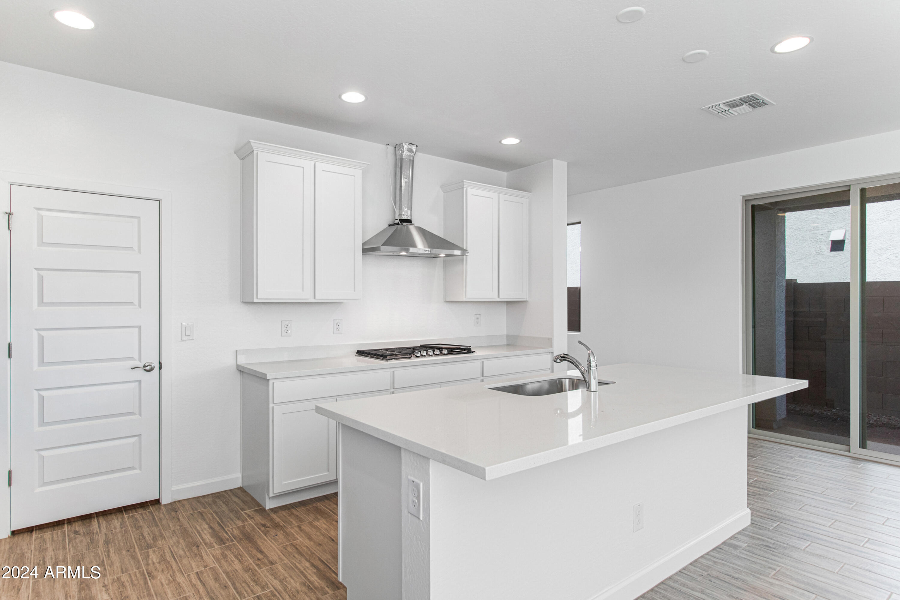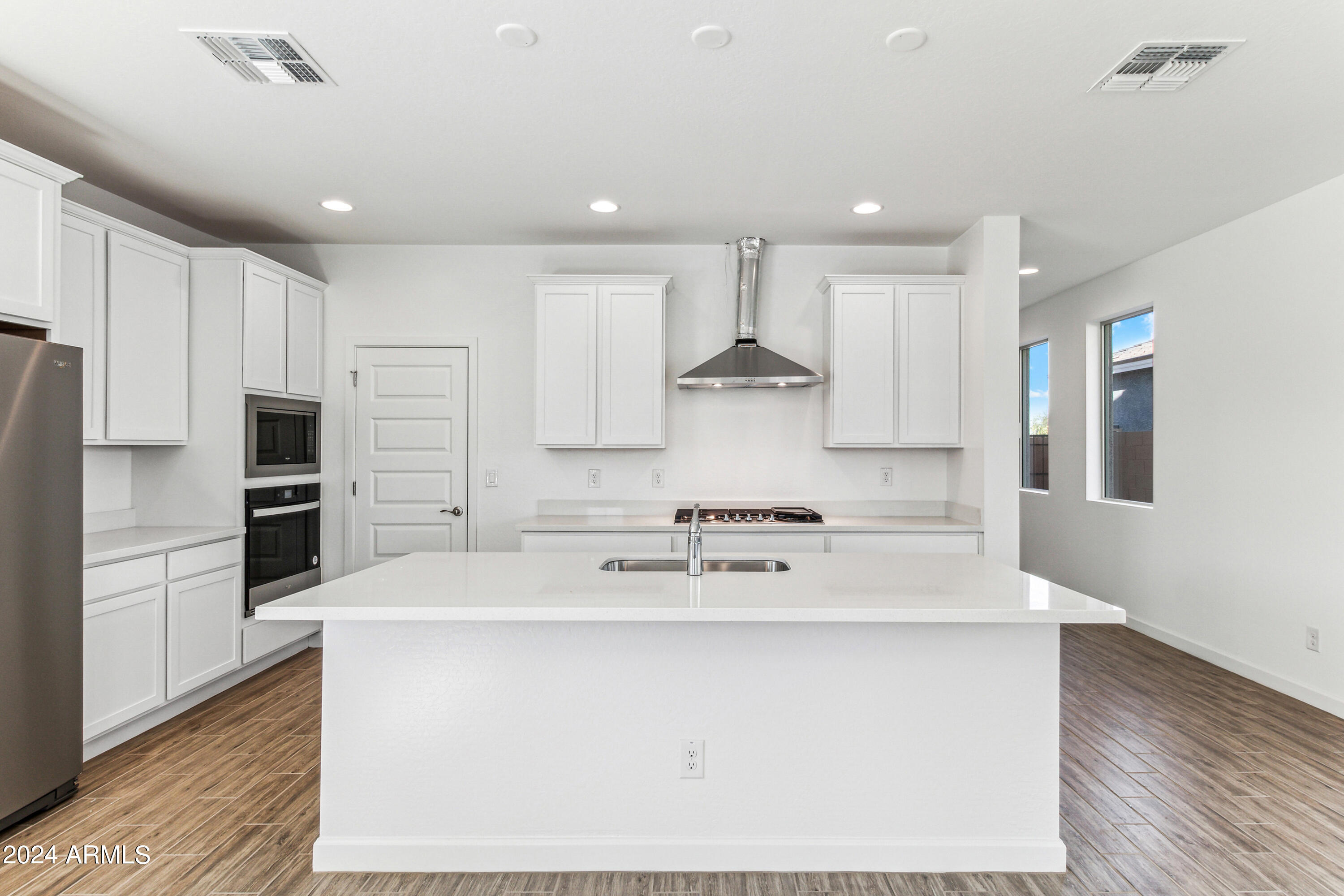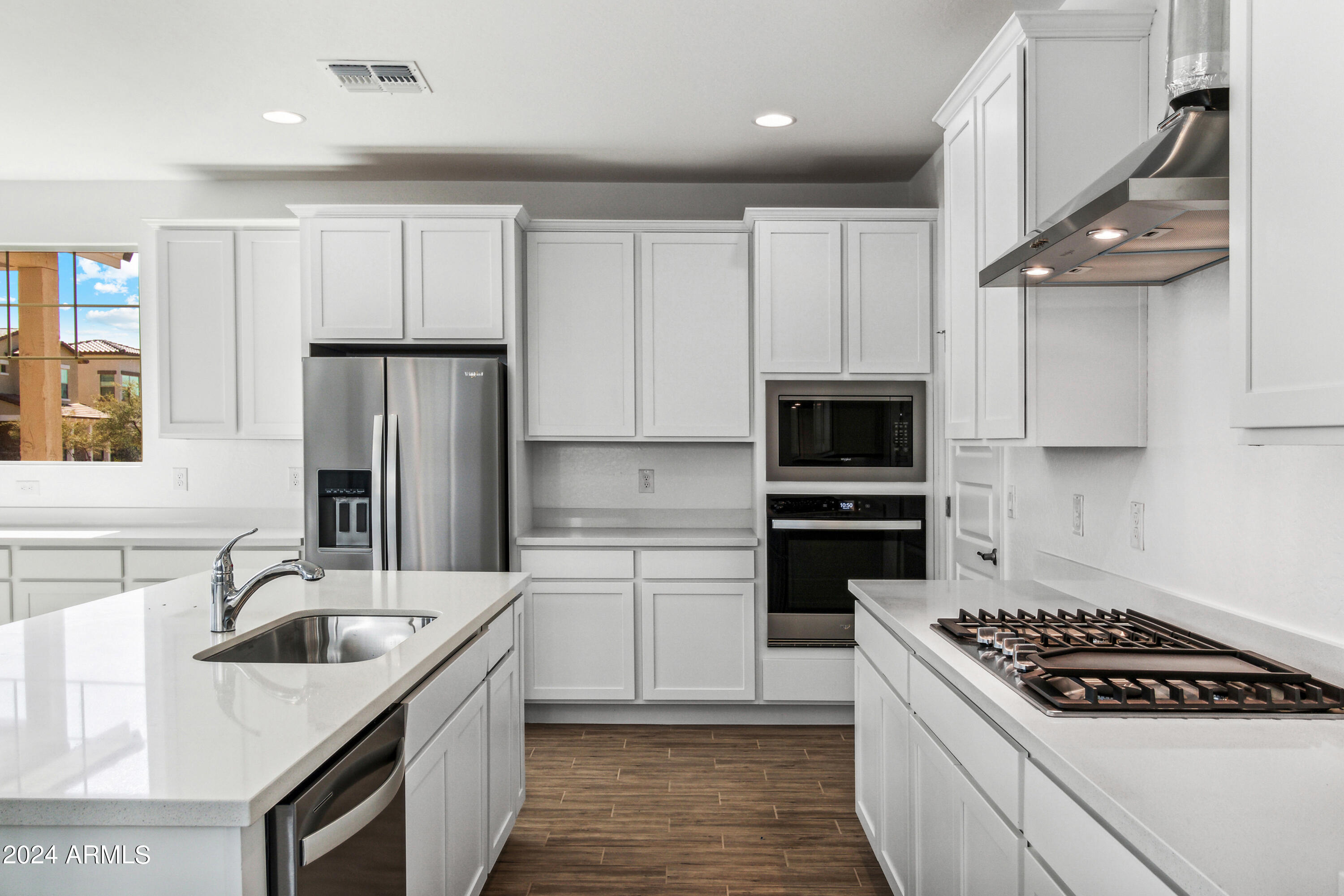 Tree-lined streets, pedestrian-friendly sidewalks and a 5,500 sf recreation center with resort style pool an kiddie pool, shaded ramadas, parks, gathering areas, pickelball courts and basketball. Close to I-10, 101 and 303. Walking distance to restaurants, movies, entertainment and shopping. This stunning two-story home is nestled on a spacious corner lot that includes a rare driveway, boasting farmhouse architecture that exudes charm and character. The professionally landscaped turf front yard and inviting pavered front porch create a warm and welcoming curb appeal. Step inside and be greeted by the open-concept living space, featuring 8' interior doors and square corner bead drywall. The great room is bathed in natural light thanks to the expansive 4-panel sliding glass door.