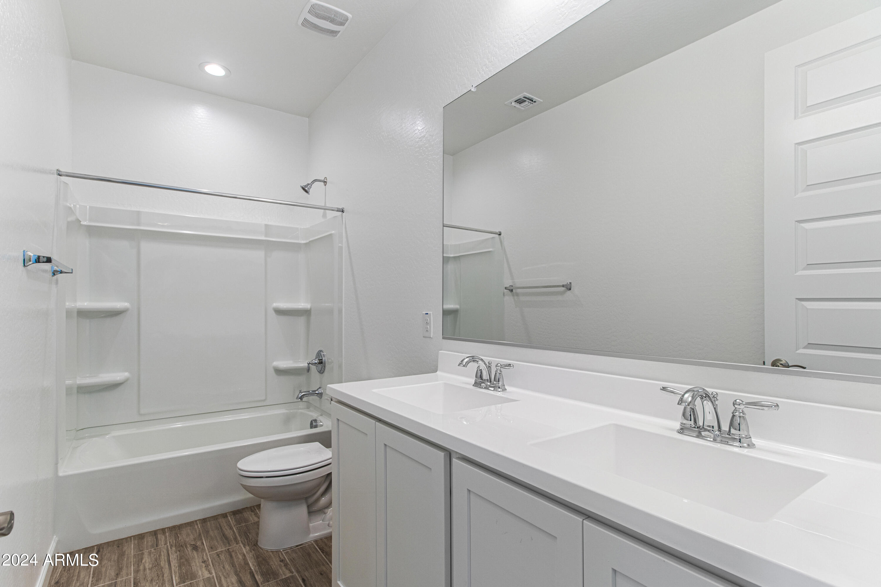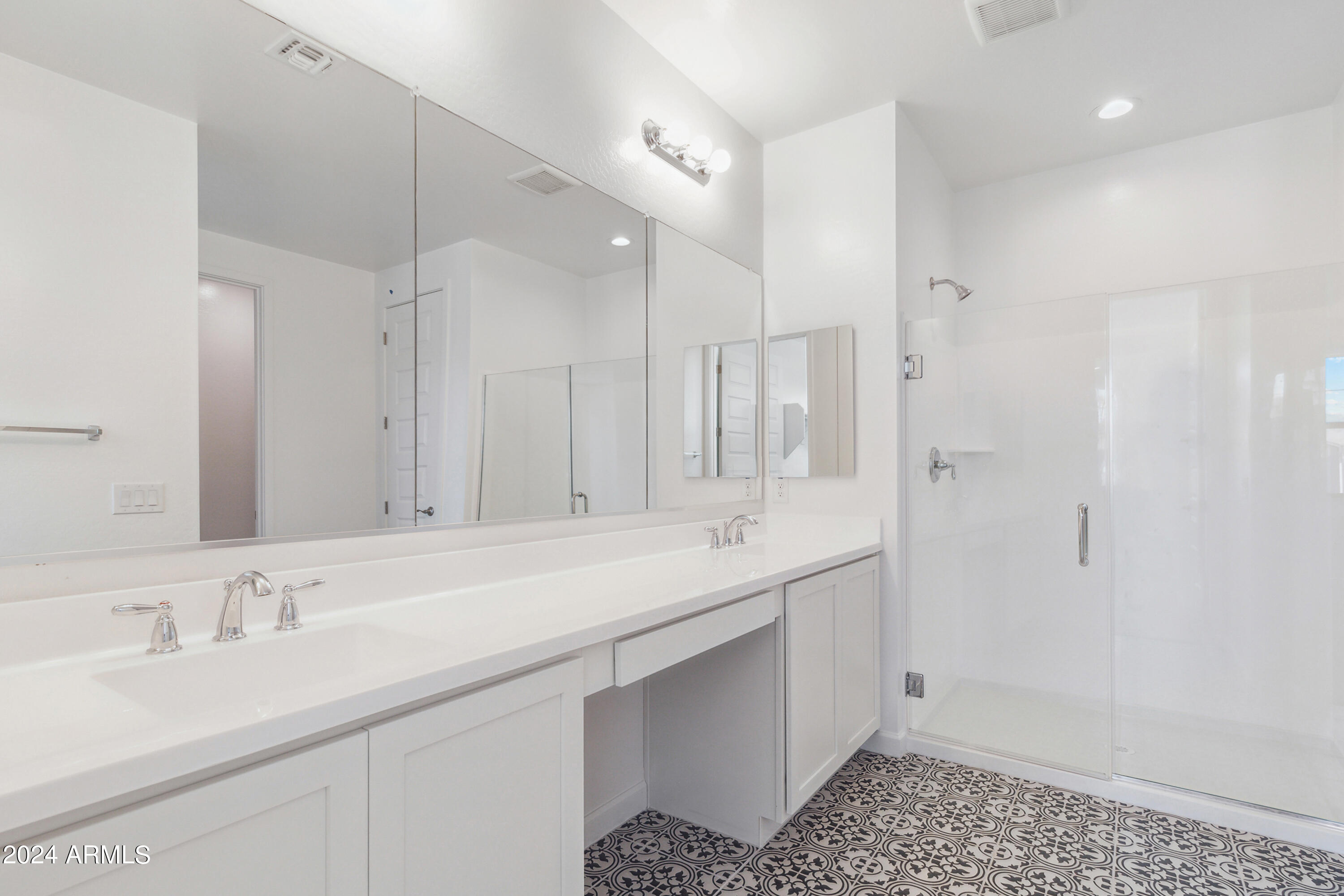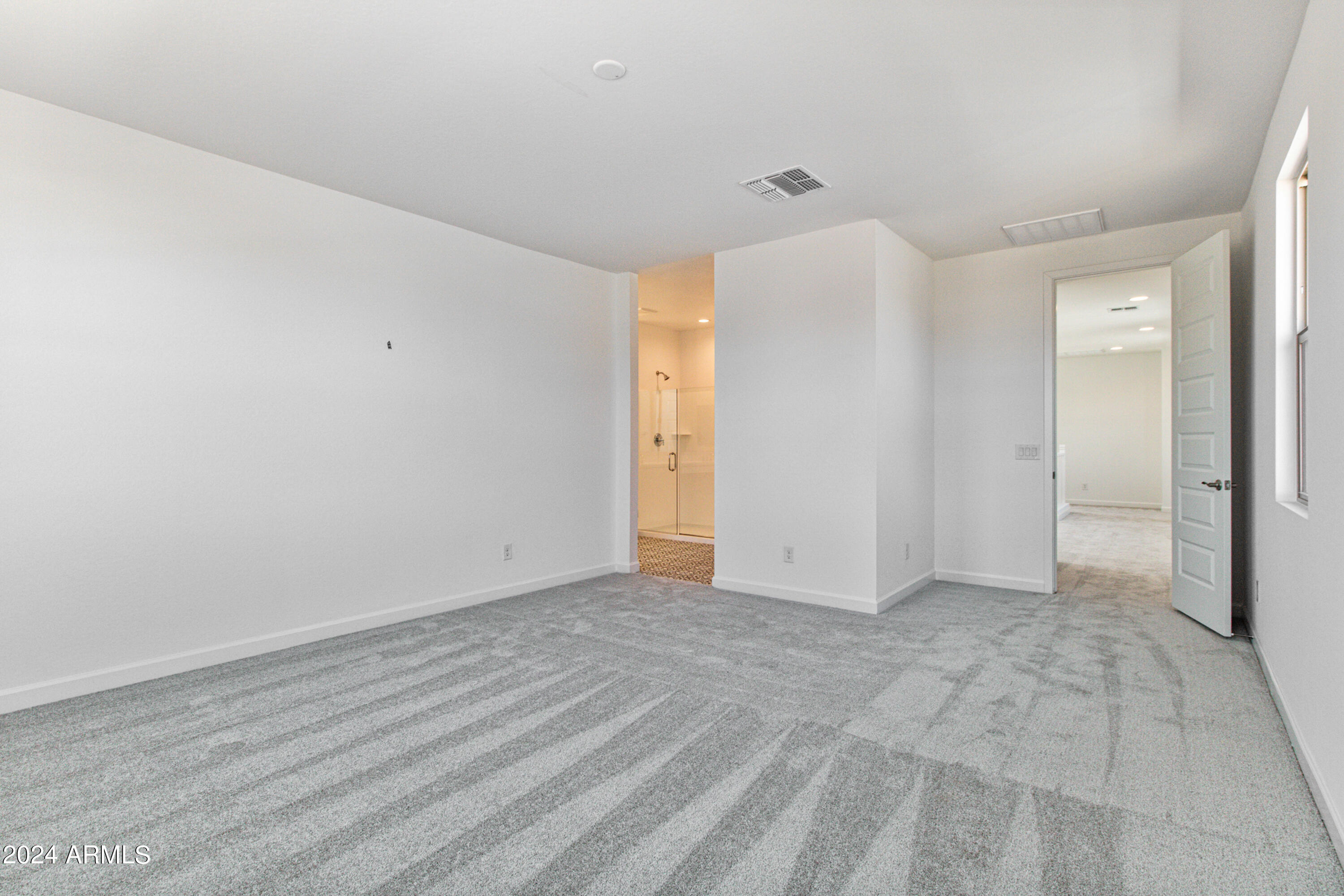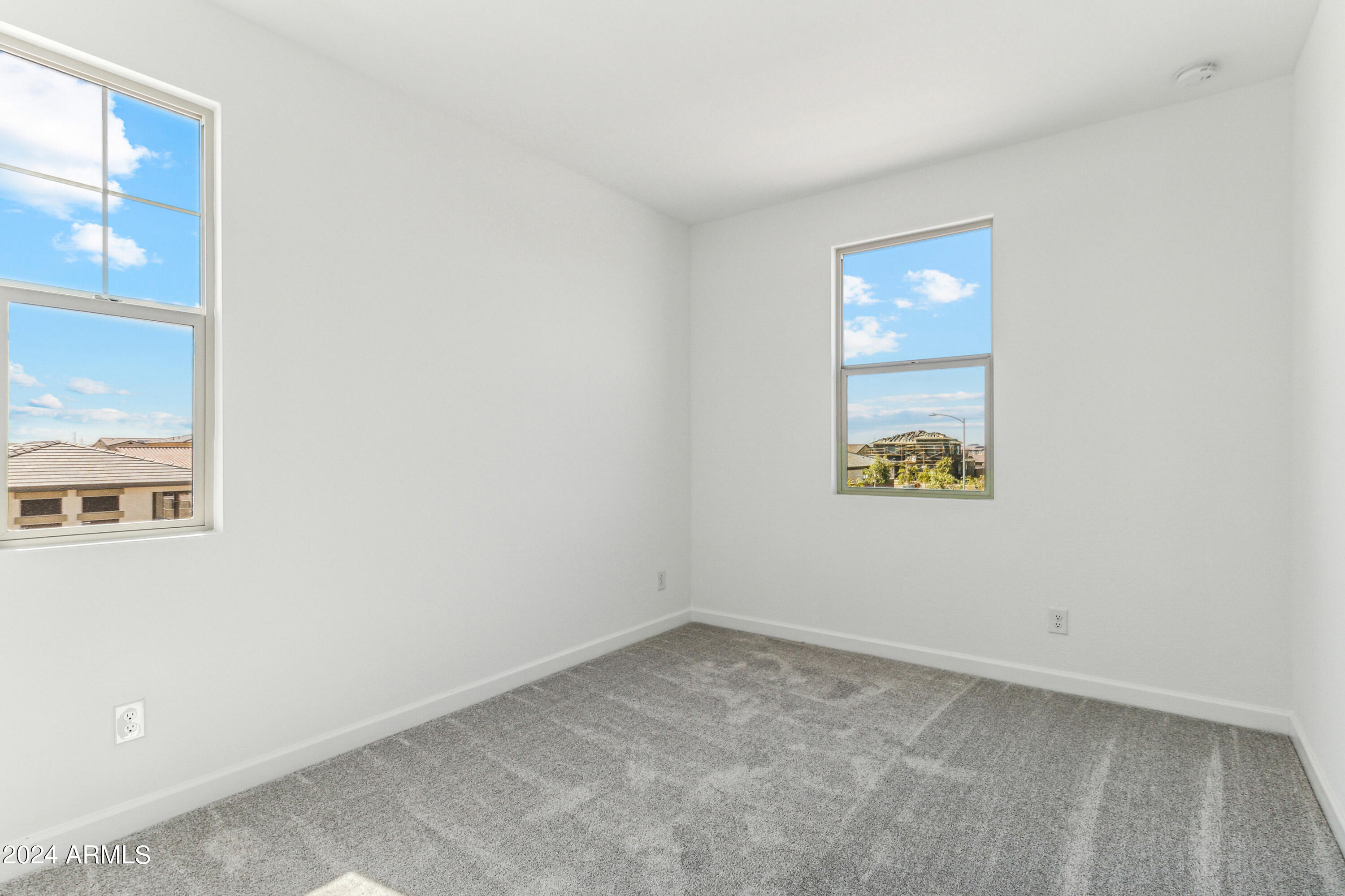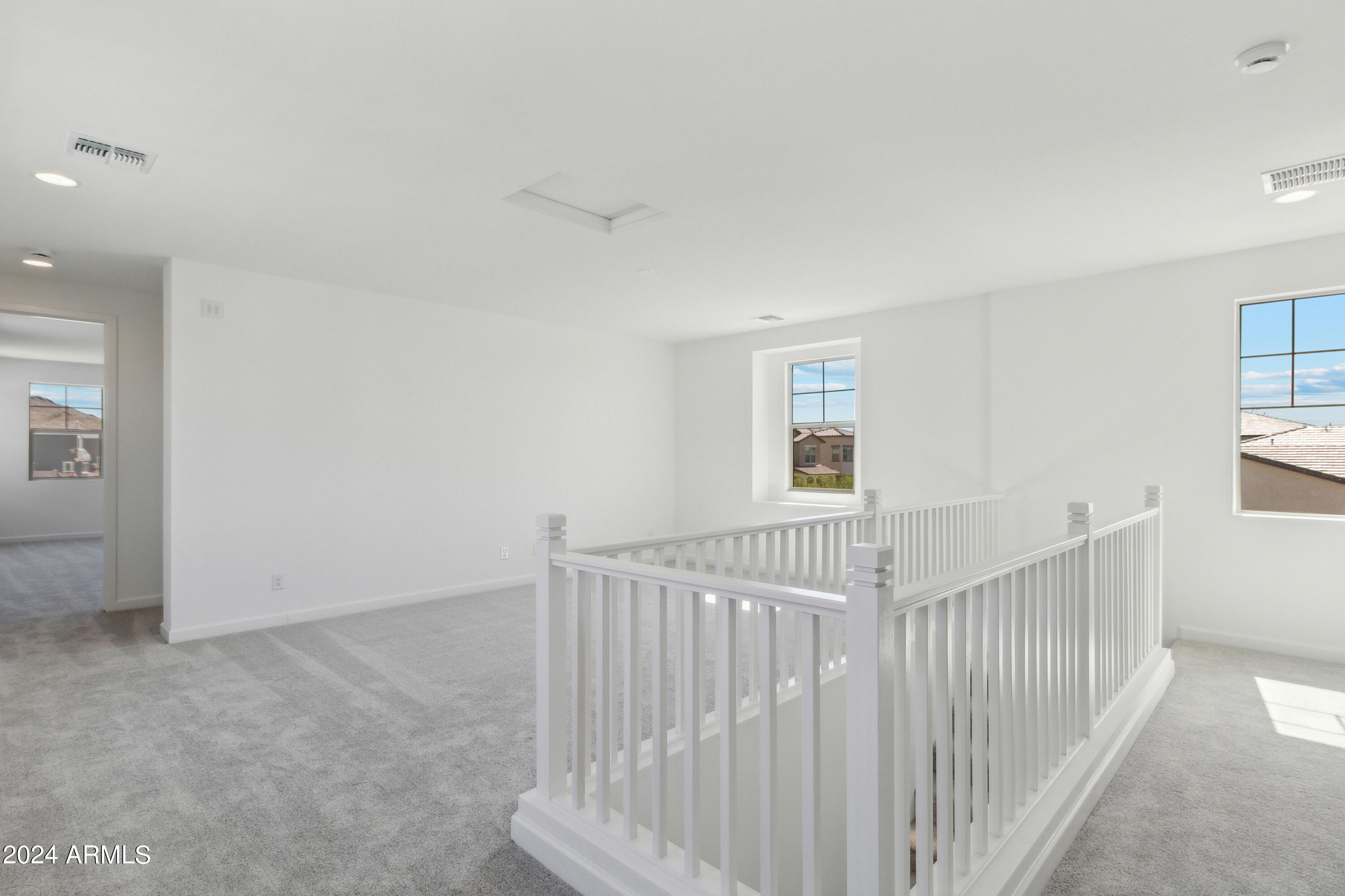 Tree-lined streets, pedestrian-friendly sidewalks and a 5,500 sf recreation center with resort style pool an kiddie pool, shaded ramadas, parks, gathering areas, pickelball courts and basketball. Close to I-10, 101 and 303. Walking distance to restaurants, movies, entertainment and shopping. This stunning two-story home is nestled on a spacious corner lot that includes a rare driveway, boasting farmhouse architecture that exudes charm and character. The professionally landscaped turf front yard and inviting pavered front porch create a warm and welcoming curb appeal. Step inside and be greeted by the open-concept living space, featuring 8' interior doors and square corner bead drywall. The great room is bathed in natural light thanks to the expansive 4-panel sliding glass door.