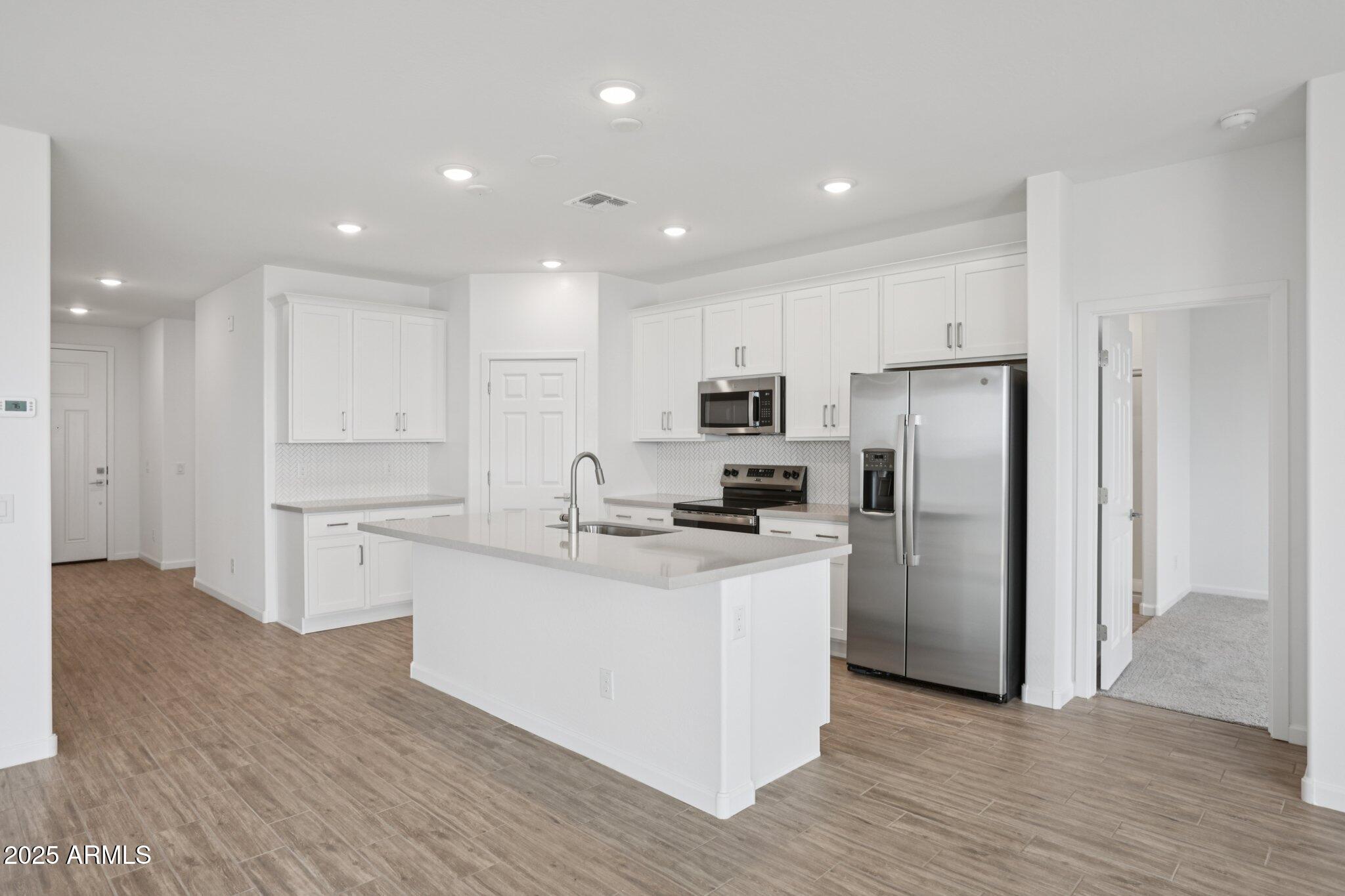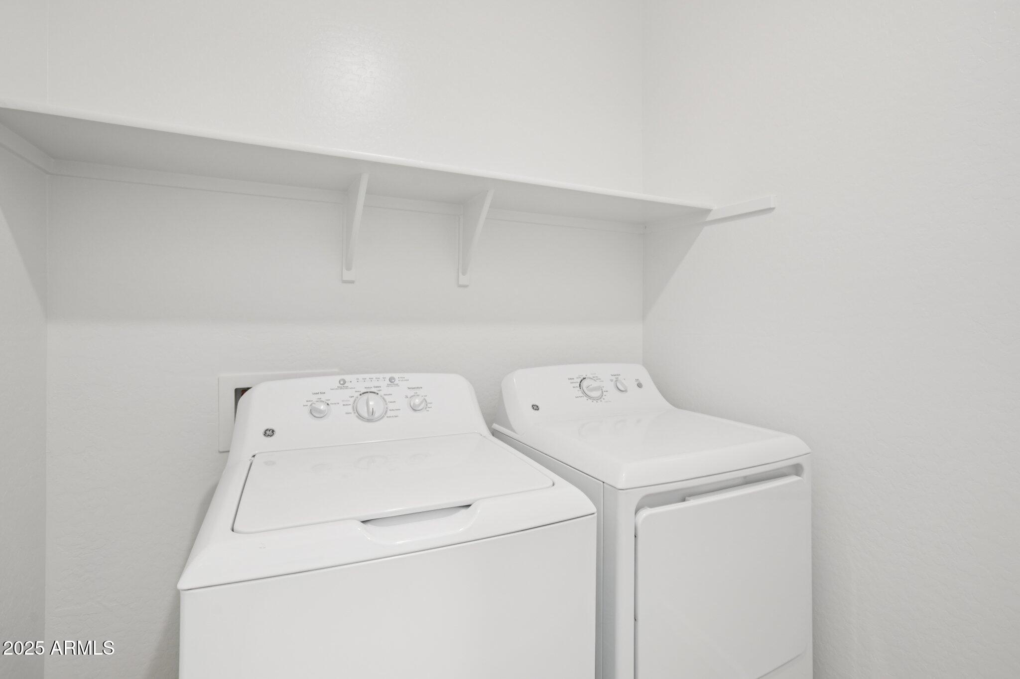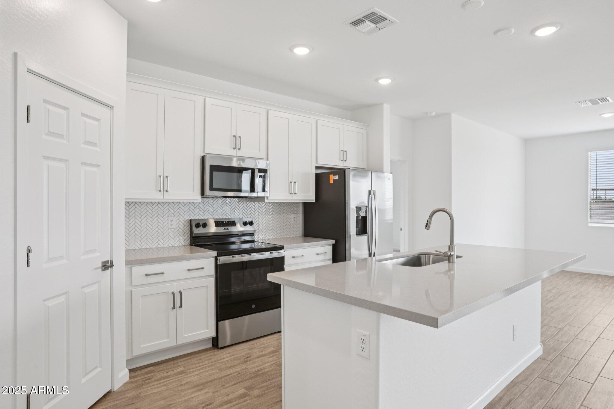 This stunning Marigold floor plan offers 1,777 square feet of living space with 3 bedrooms, 2 baths, a den, and a 2-car garage with a garage door opener. The home features our popular Modern exterior. The kitchen showcases an Timeless 2.0 interior collection with a beautiful mosaic herringbone set tile backsplash, white 42-inch upper cabinets, stainless steel appliances, and eye catching quartz countertops. The home also includes 6x24 wood-look plank tile flooring, white sand quartz and oval sinks in the bathrooms, and light gray carpeting in the bedrooms. Enjoy a 4-panel center sliding glass door, 2-inch white horizontal faux-wood blinds, a water softener loop system. Additional conveniences include an electric washer and dryer and pre-wiring for pendant lights in the kitchen.