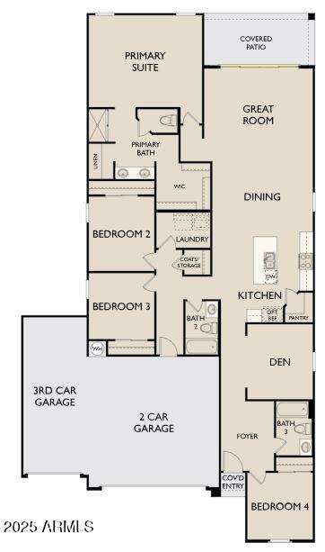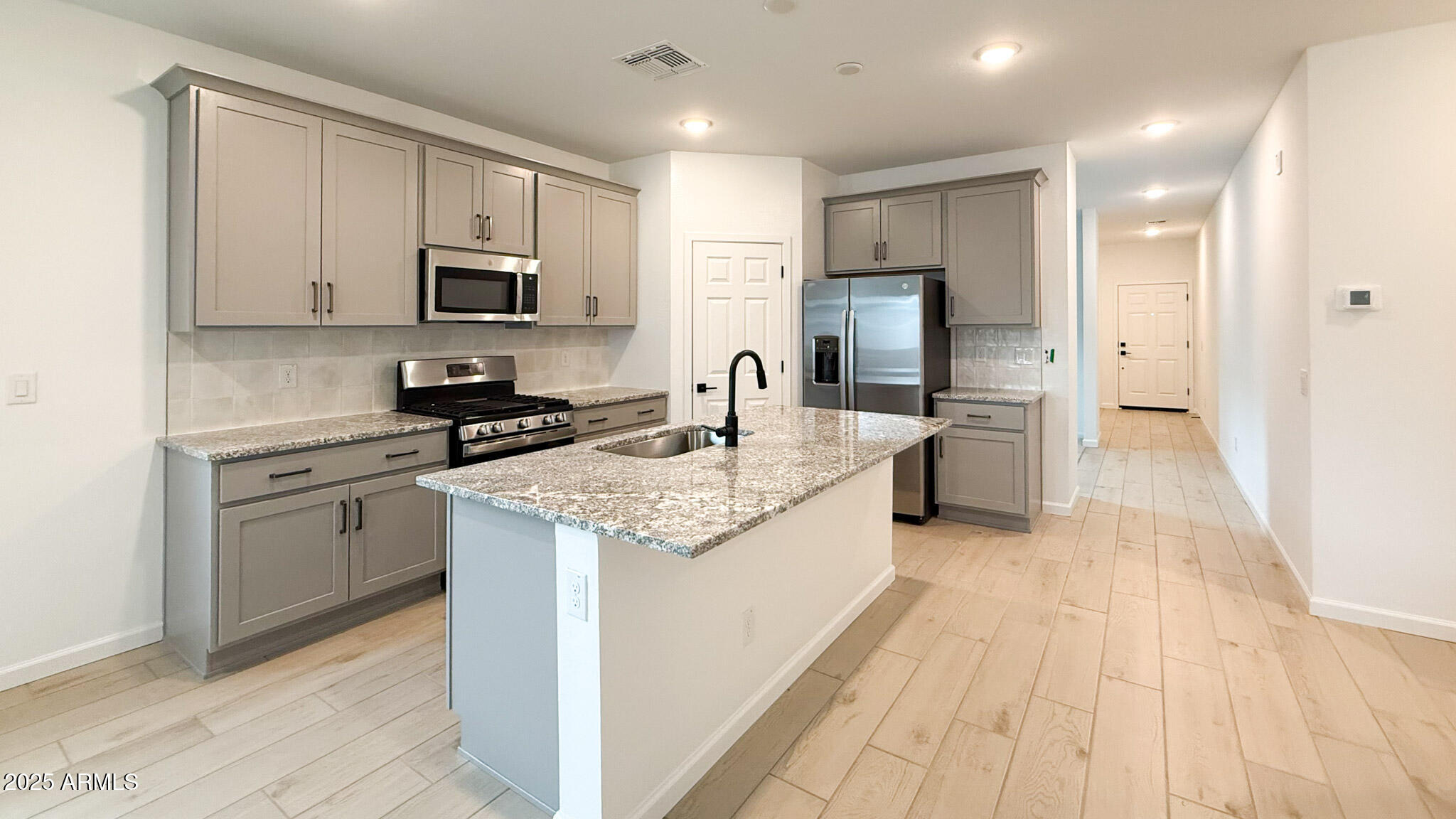 Welcome to the Poppy! Boasting 2,072 sq ft, 4 bedrooms + Den, 3 baths; this home offers a versatile floor plan perfect for any buyer. Enjoy 9 ft ceilings, wood-look tile in main areas, carpet in bedrooms, and 3 car garage. The spacious kitchen features the Artisan Collection with 42'' upper grey cabinets, quartz countertops, tiled backsplash, and hardware. The great room has a 4-panel glass slider that opens to a covered patio. The Den can be a office, play room, or additional living area. GE washer/dryer, fridge, and blinds also included! The Amarillo Creek community offers parks, pickleball court, basketball, and is conveniently located near Route 347 for easy commuting to Phoenix. Minutes from dining, shopping, and all the entertainment that Maricopa has to offer.