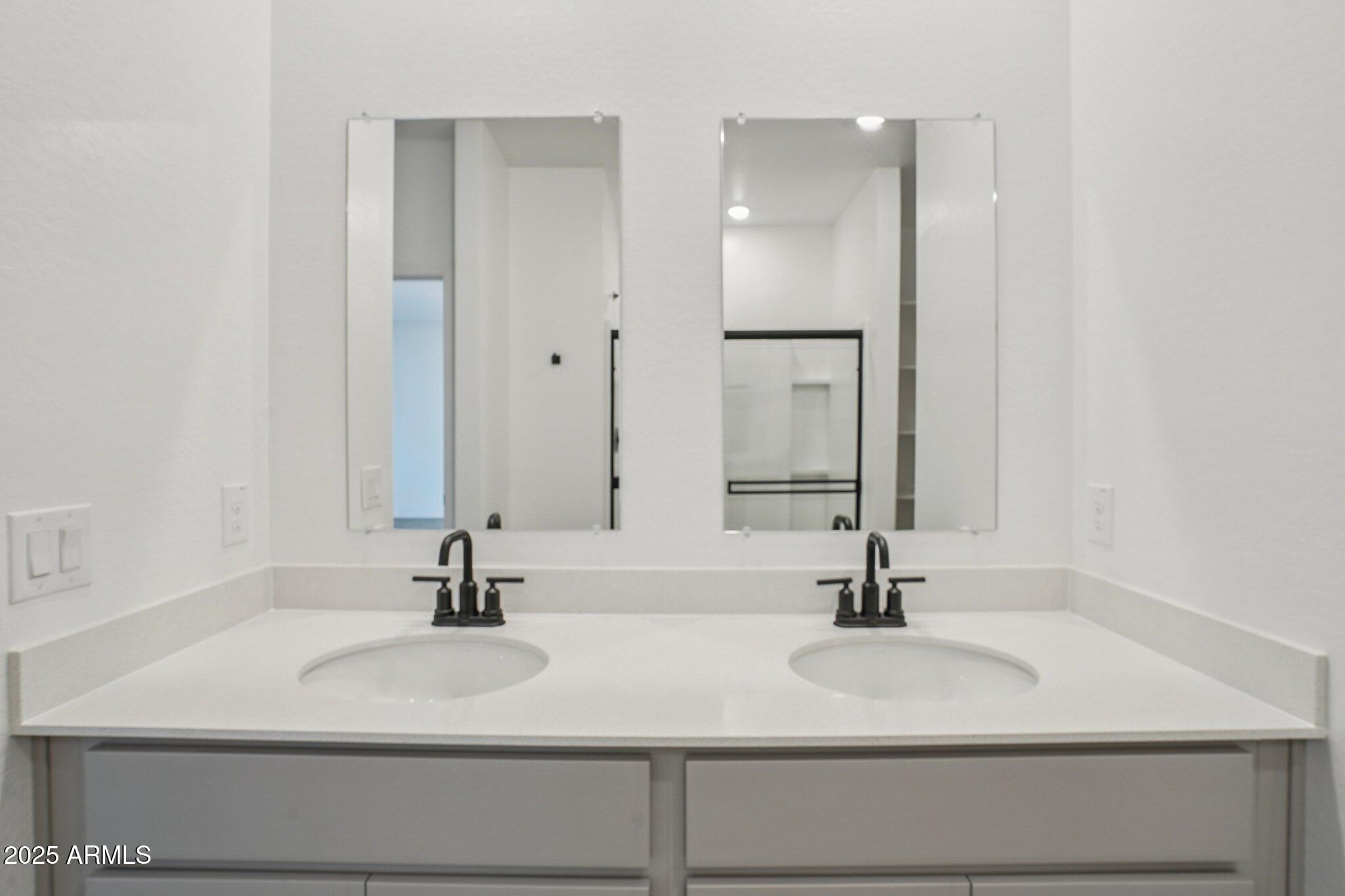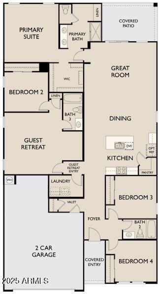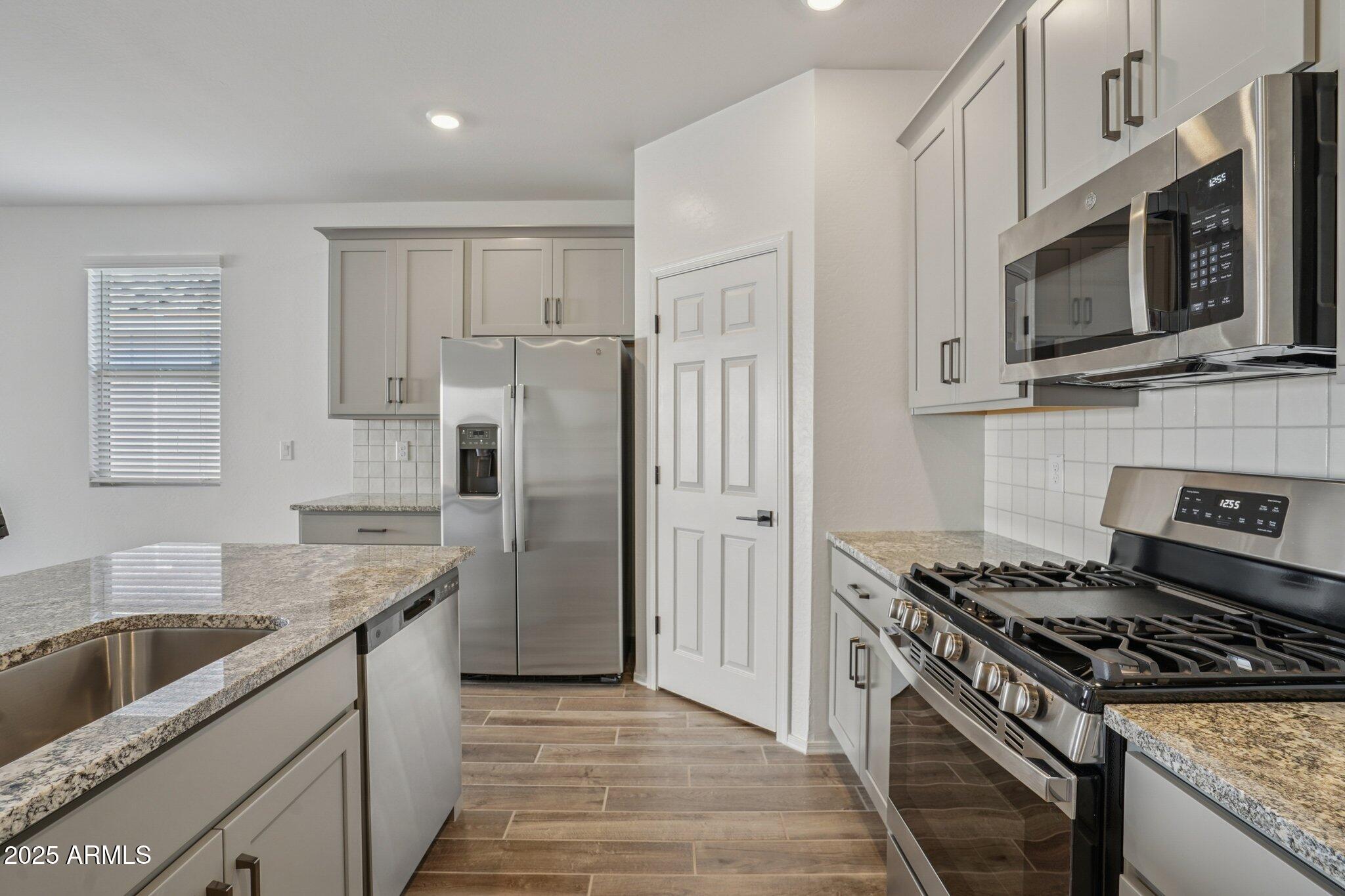 Welcome to the Sunflower! Boasting 2,219 sq ft, 4 bedrooms, 3 baths; this home offers a versatile floor plan perfect for any buyer. Enjoy 9 ft ceilings, wood-look tile in main areas, carpet in bedrooms, and 2.5 car garage. The spacious kitchen features the Artisan Collection with 42'' upper soft grey cabinets, granite countertops, tiled backsplash, and hardware. The great room has a 4-panel glass slider that opens to a covered patio. The guest retreat can be a mother-in-law suite, office, or additional living area. GE washer/dryer, fridge, and blinds also included! The Amarillo Creek community offers parks, pickleball court, basketball, and is conveniently located near Route 347 for easy commuting to Phoenix. Minutes from dining, shopping, and all the entertainment that Maricopa has has to offer.