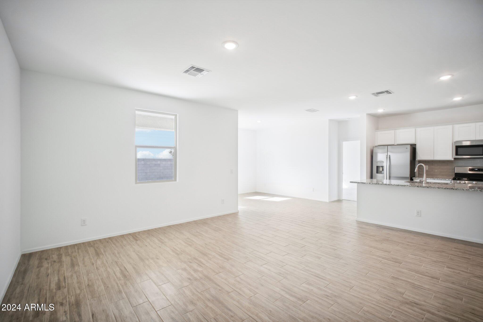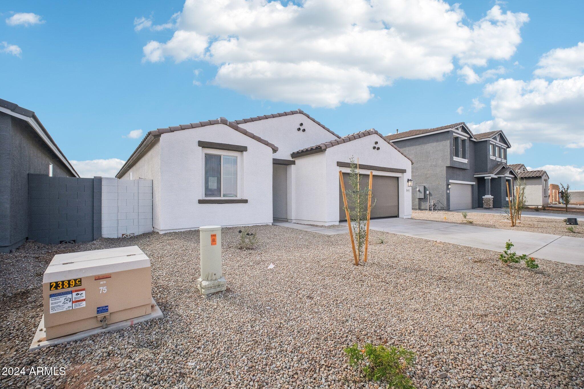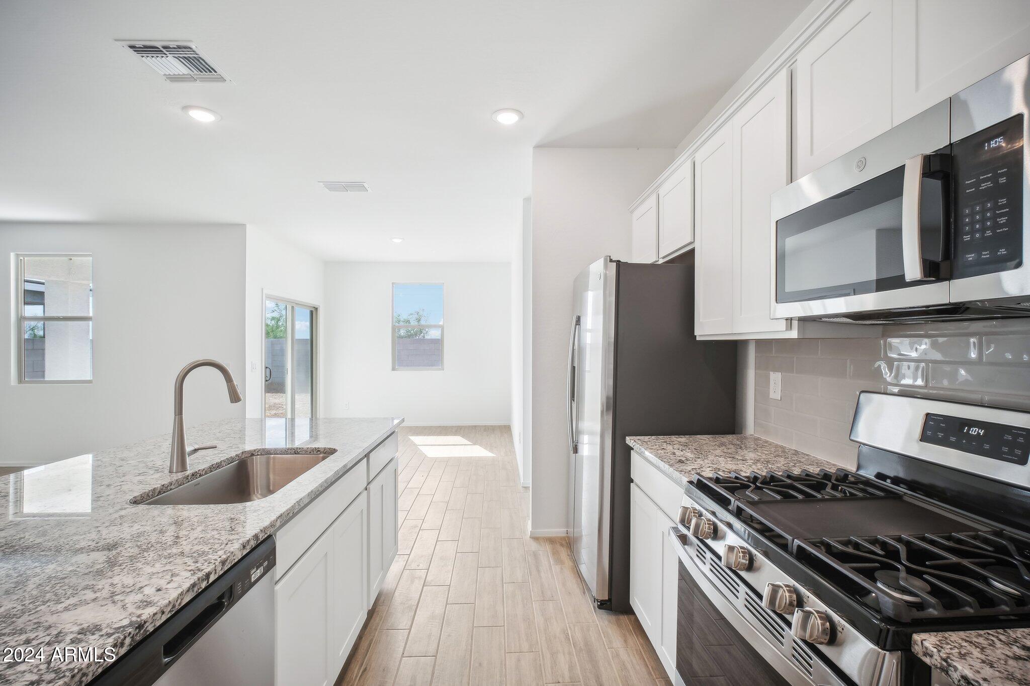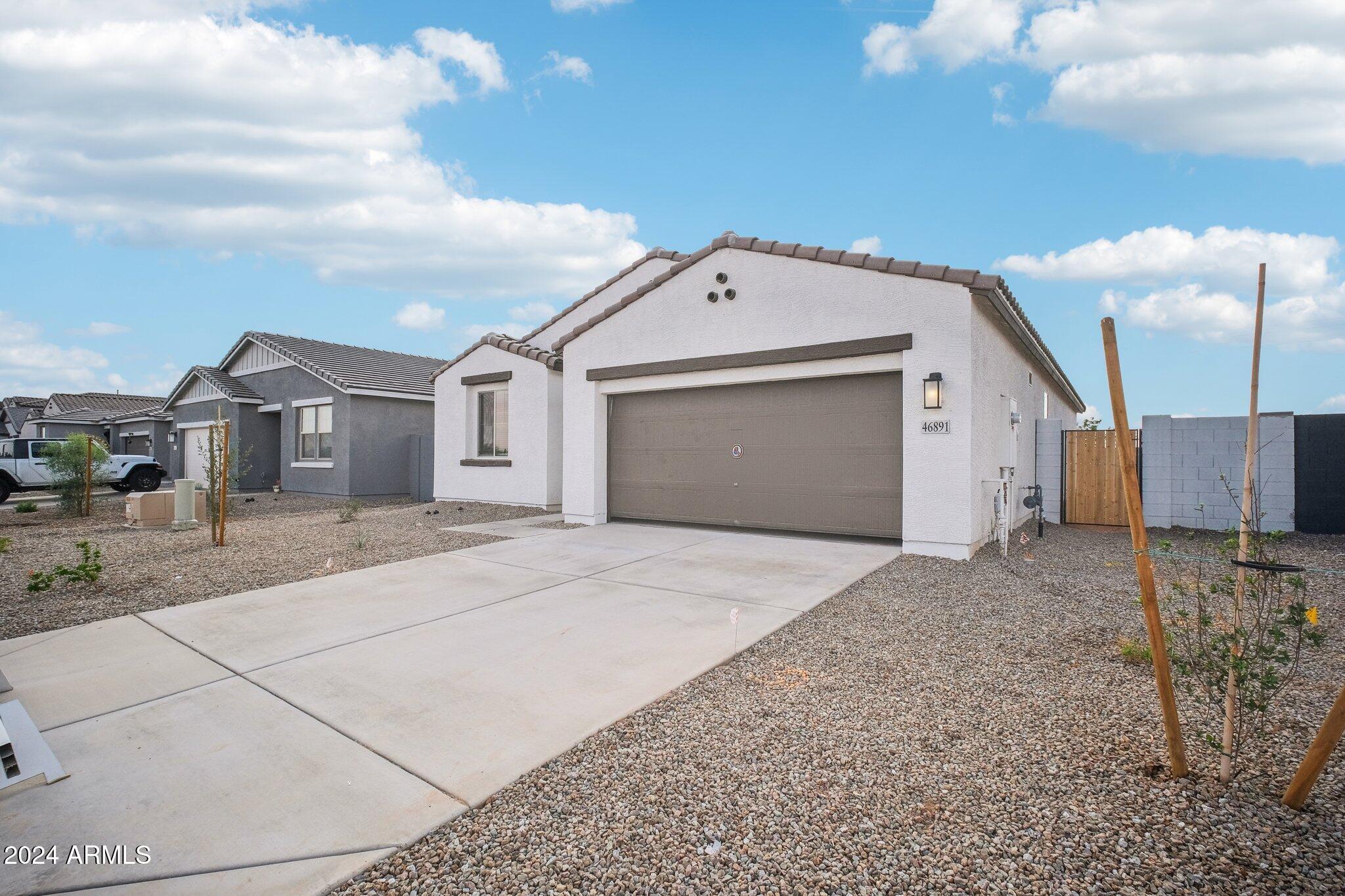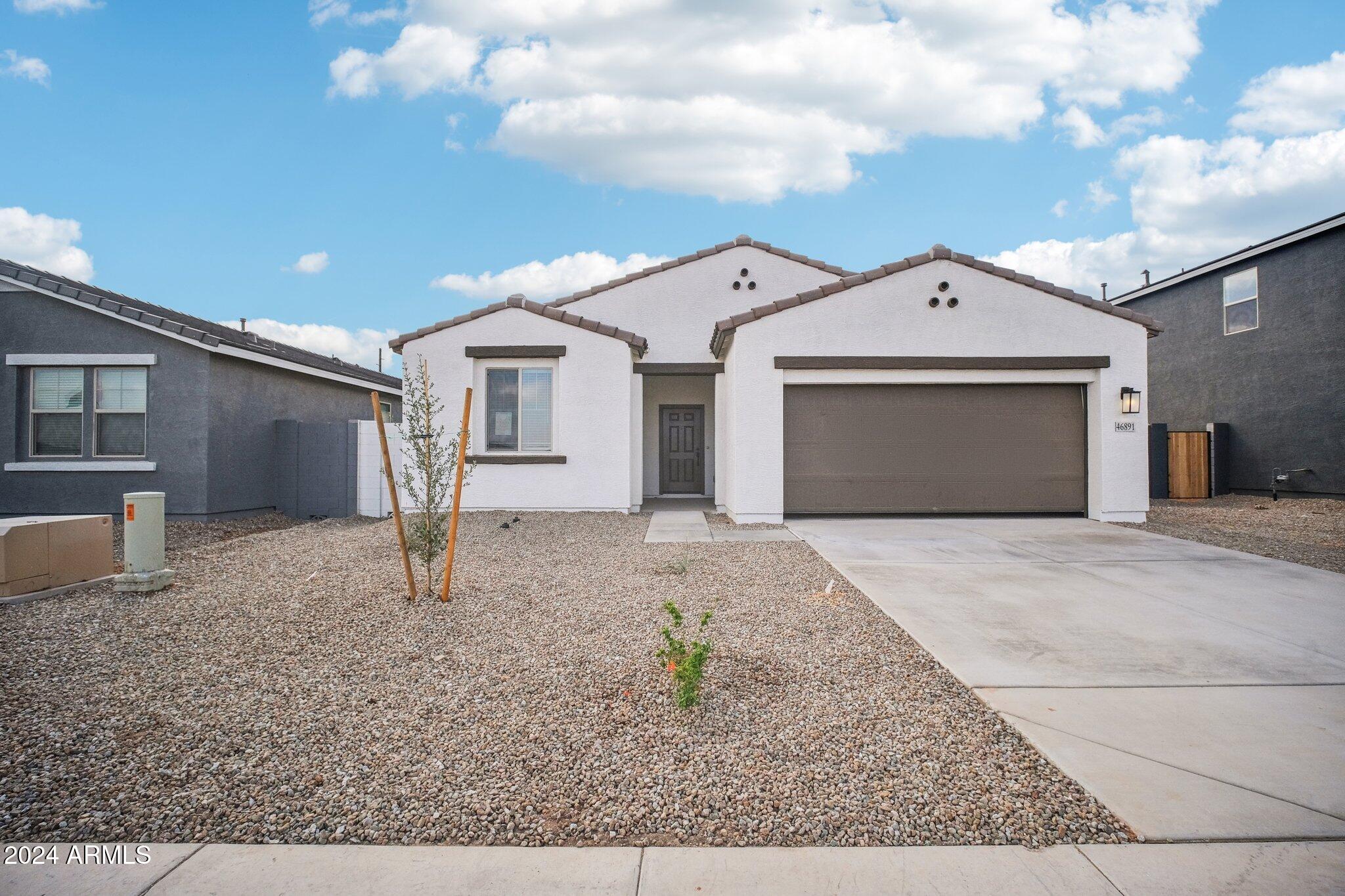 Discover the meticulously crafted Marigold floor plan nestled in the coveted Amarillo Creek community, where elegance meets functionality. At the heart of this home lies an expansive open kitchen with a center island, ideal for hosting gatherings with loved ones. Adorned with white shaker cabinets, exquisite granite countertops complemented by a 3''''x12'''' backsplash, and state-of-the-art stainless steel appliances including a refrigerator and gas range, every detail is designed to elevate your culinary experience. Spanning 1,777 square feet of brand new construction, this never-lived-in home maximizes space with 3 bedrooms, a spacious den, 2 bathrooms, a fully equipped laundry room with washer and dryer, and a two-car garage. Designer touches such as wood look tile floors and sleek black hardware add a touch of modern elegance throughout. The separate den offers versatility, perfect for a home office, study, or cozy movie nights.The generously sized primary suite is a sanctuary, boasting dual sinks and a walk-in closet for effortless organization. The open concept layout and 9" ceilings create a bright and airy ambiance, while front yard landscaping ensures a warm welcome. Outside, an expansive rear yard provides endless opportunities to customize your outdoor oasis.