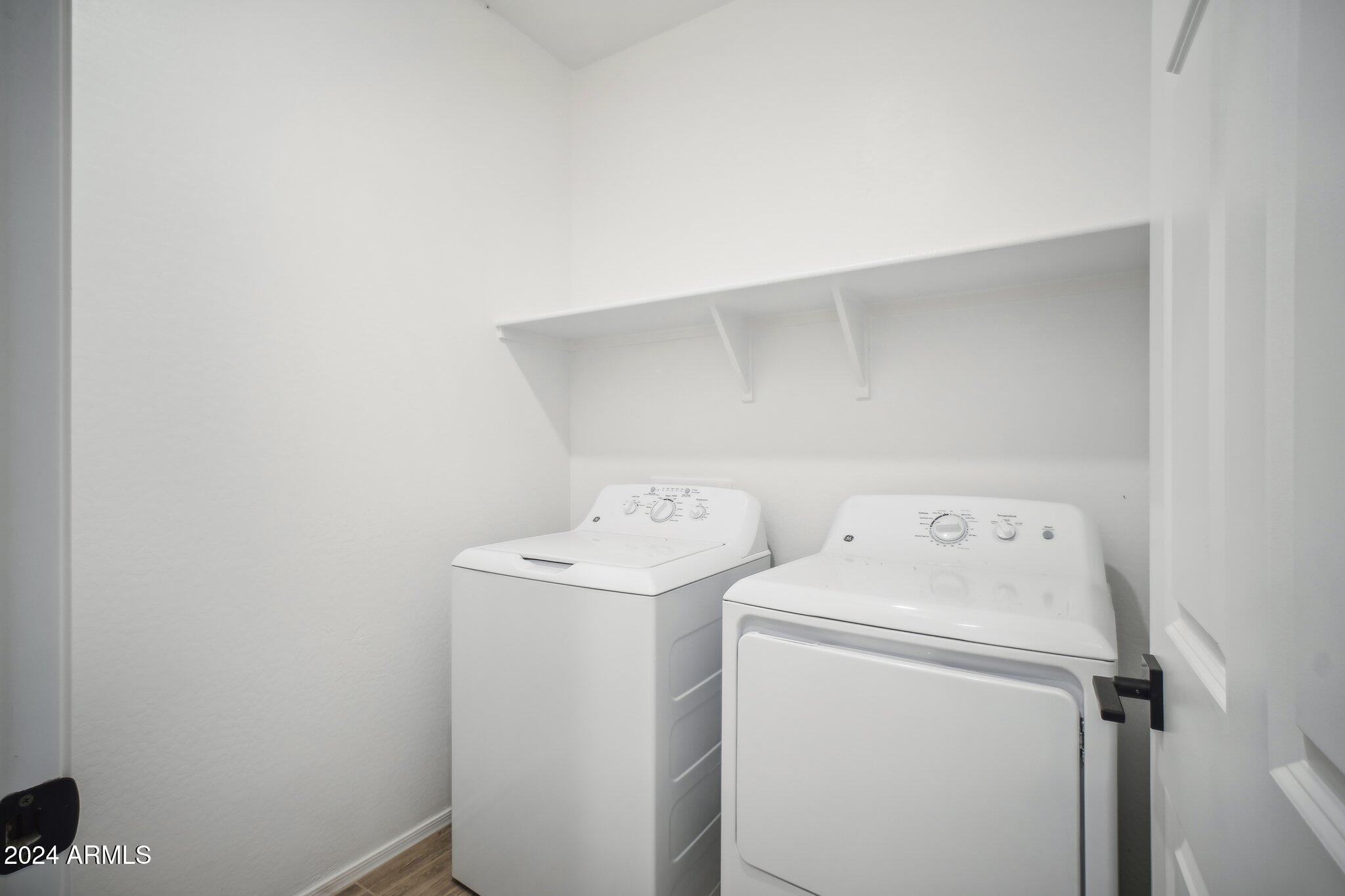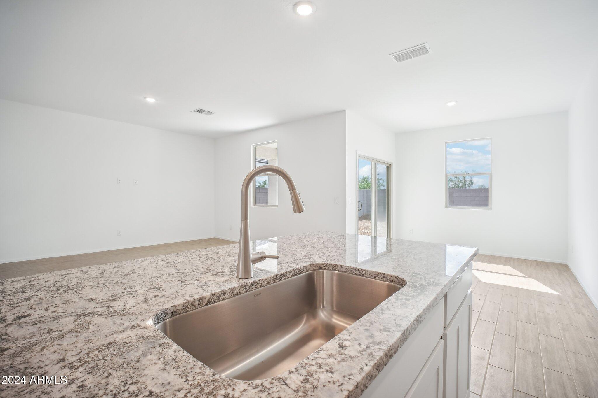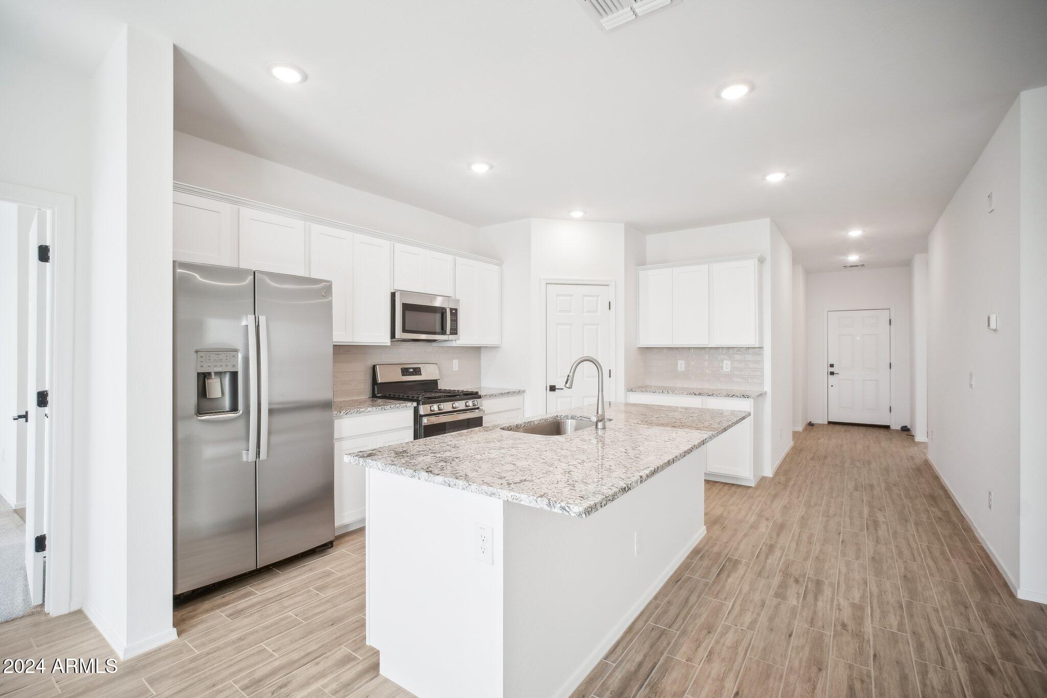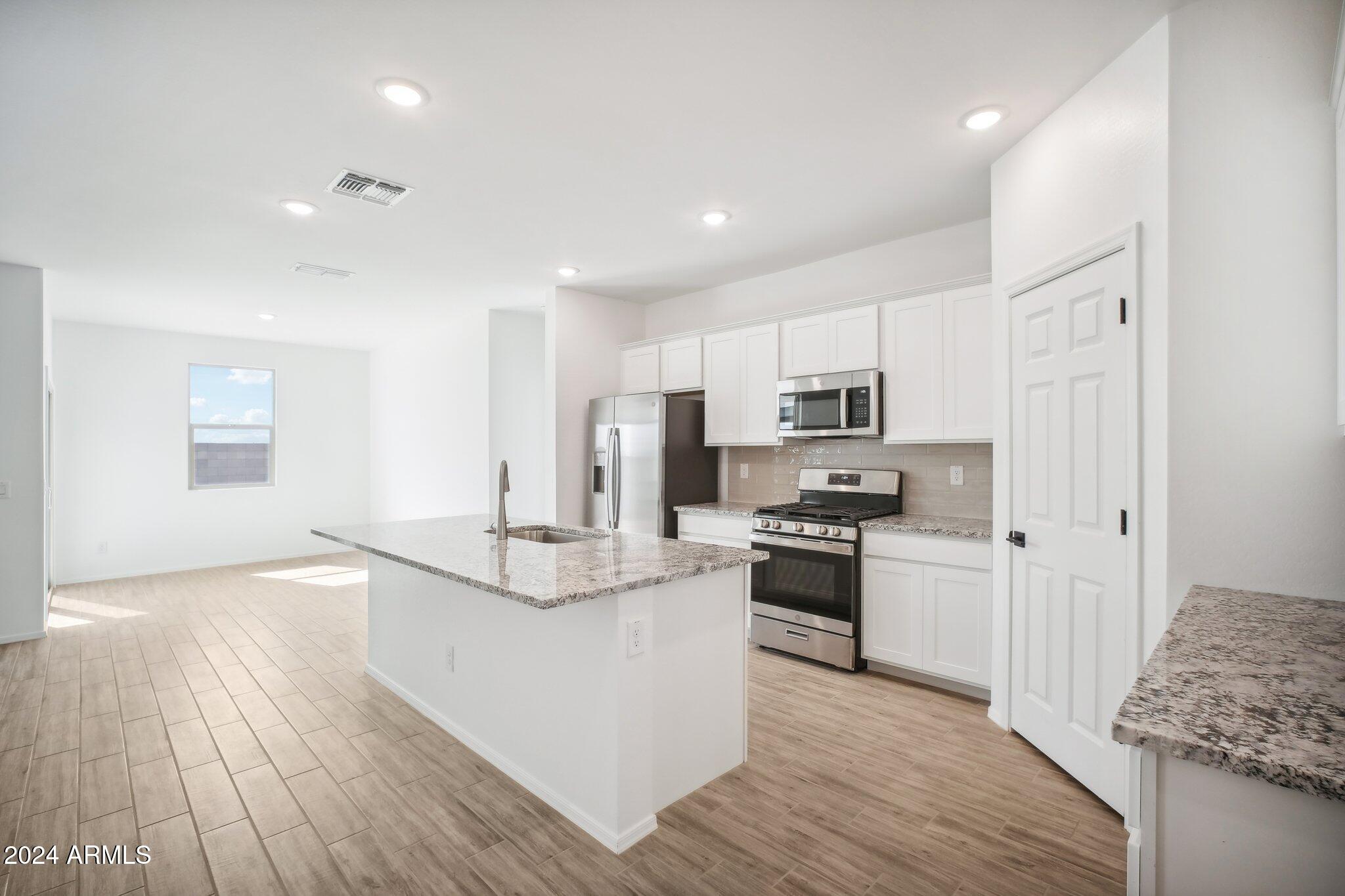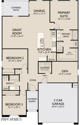 Discover the meticulously crafted Marigold floor plan nestled in the coveted Amarillo Creek community, where elegance meets functionality. At the heart of this home lies an expansive open kitchen with a center island, ideal for hosting gatherings with loved ones. Adorned with white shaker cabinets, exquisite granite countertops complemented by a 3''''x12'''' backsplash, and state-of-the-art stainless steel appliances including a refrigerator and gas range, every detail is designed to elevate your culinary experience. Spanning 1,777 square feet of brand new construction, this never-lived-in home maximizes space with 3 bedrooms, a spacious den, 2 bathrooms, a fully equipped laundry room with washer and dryer, and a two-car garage. Designer touches such as wood look tile floors and sleek black hardware add a touch of modern elegance throughout. The separate den offers versatility, perfect for a home office, study, or cozy movie nights.The generously sized primary suite is a sanctuary, boasting dual sinks and a walk-in closet for effortless organization. The open concept layout and 9" ceilings create a bright and airy ambiance, while front yard landscaping ensures a warm welcome. Outside, an expansive rear yard provides endless opportunities to customize your outdoor oasis.