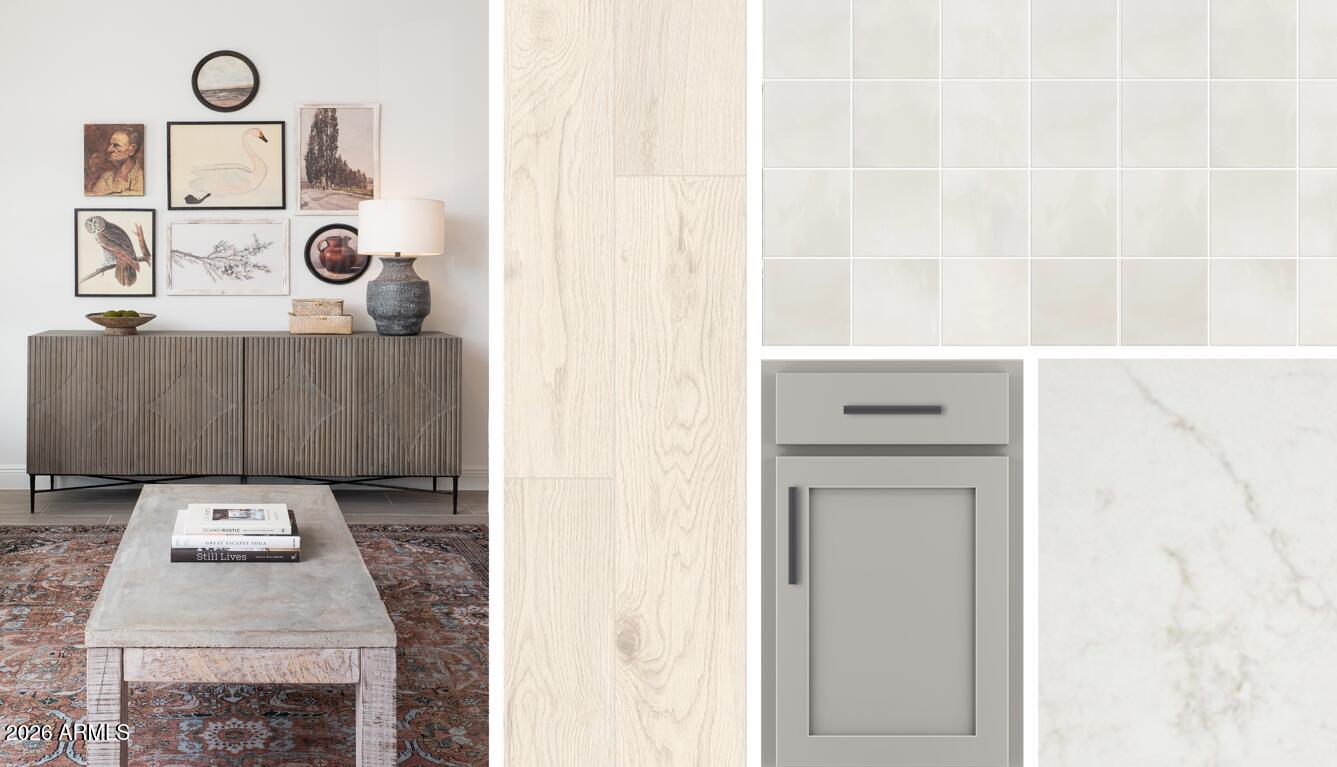 Sol at Amarillo Creek in Maricopa featuring the Jade floorplan, the largest single-level plan at 2,623 sq ft with 4 bedrooms, 3.5 baths, den, and 3-car garage. Open kitchen, dining, and great room with butler's pantry. Kitchen includes Hana Sky quartz, gray soft-close cabinets, taupe tile backsplash, and GE stainless gas appliances with fridge. Wood-look tile in main areas, 2'' faux wood blinds throughout. Spacious primary suite with dual sinks, walk-in shower, and large closet. 4-panel slider to covered patio, north-facing yard with mountain views. Washer/dryer included.