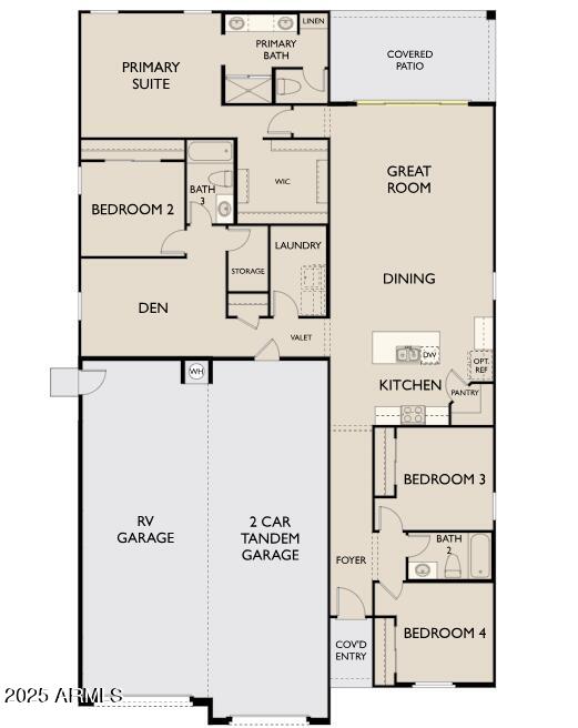 Welcome to your Dream Single-Story RV Garage Home! This Opal RV Garage brand-new construction home plan boasts Arizona's classic Modern Desert architecture in the front, blending seamlessly with its surroundings. With 2,124 square feet of designer-curated living space, this gem offers a place of casual comforts and airy style. The spacious open-concept floor plan has four bedrooms, a large den, and 3 bathrooms. You'll love the magnificent four-panel center siding glass door, bathing the area in sunlight, and the Lakewood Vista 7 x 22 Plank Tile wood-look floors throughout the main living areas, offering elegance and easy maintenance. A chef's delight, the kitchen delivers in every way with White Ivory Quartz countertops, a stainless steel single bowl under-mount sink, a stainless steel Gas range, a large island, Baker Blvd Herringbone tile backsplash, and Fairview white 42" upper cabinets with satin nickel cabinet hardware. This oasis home also has a 2-car tandem garage plus an RV Garage to store your big toys, classic cars, and so much more. The possibilities are endless.The Amarillo Creek community is conveniently located near Route 347, which makes it easy to commute to Phoenix, Chandler, and Mesa. It is just minutes away from Maricopa's array of dining, shopping, and entertainment options.