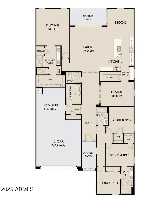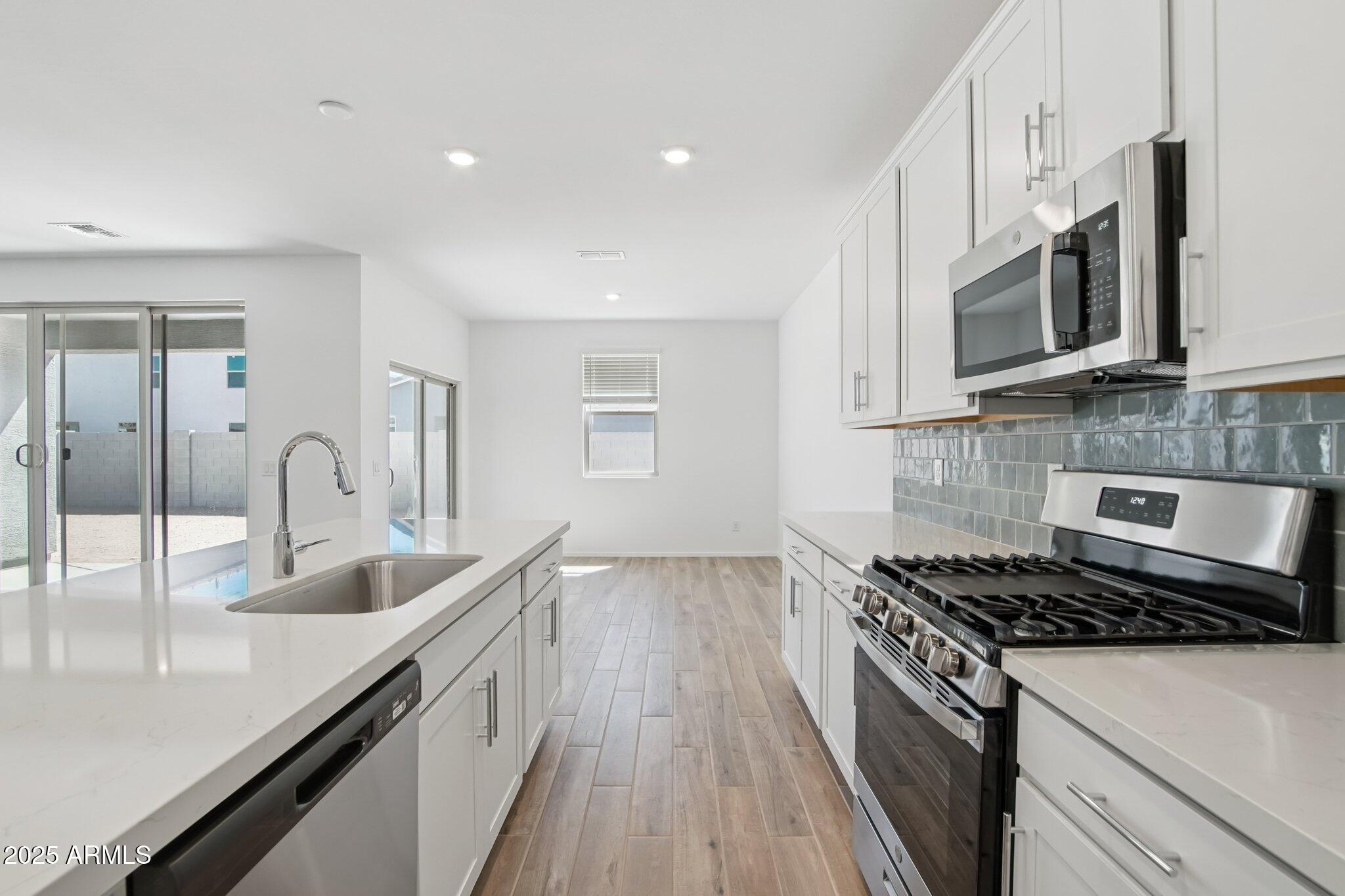 This brand-new construction showcases our Farmhouse exterior architecture.This Farmhouse style Jade home boasts 2,623 sq ft of living space, featuring 4 bedrooms, 3.5 bathrooms, a 3 car tandem garage, a separate dining area , and ample storage throughout. The open concept kitchen is perfect for entertaining family and friends with the kitchen featuring Fairview white 42'' upper cabinets with polished chrome pull cabinet hardware, Zelige Cielo 4 x4 backsplash, beautiful crisp stria quartz countertops, stainless steel gas stove, and a walk in pantry designed with an organizer's dream in mind. You'll love the 4-panel center meet sliding glass door that utilizes the indoor and outdoor flow for a bright airy feel, 9' ceilings and vicinity natural 6 x 36 plank tile flooring. The Amarillo Creek community is conveniently located near Route 347 for easy commuting to Phoenix, Chandler and Mesa. Just minutes away from an array of dining, shopping and entertainment options that Maricopa has to offer. Don't miss out on this beautifully appointed turn key home! This home feels bright and open.