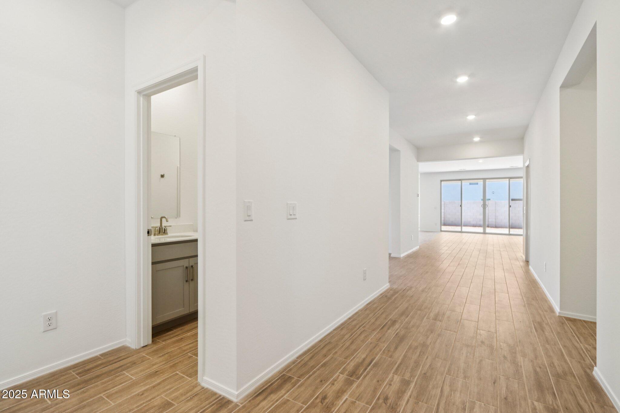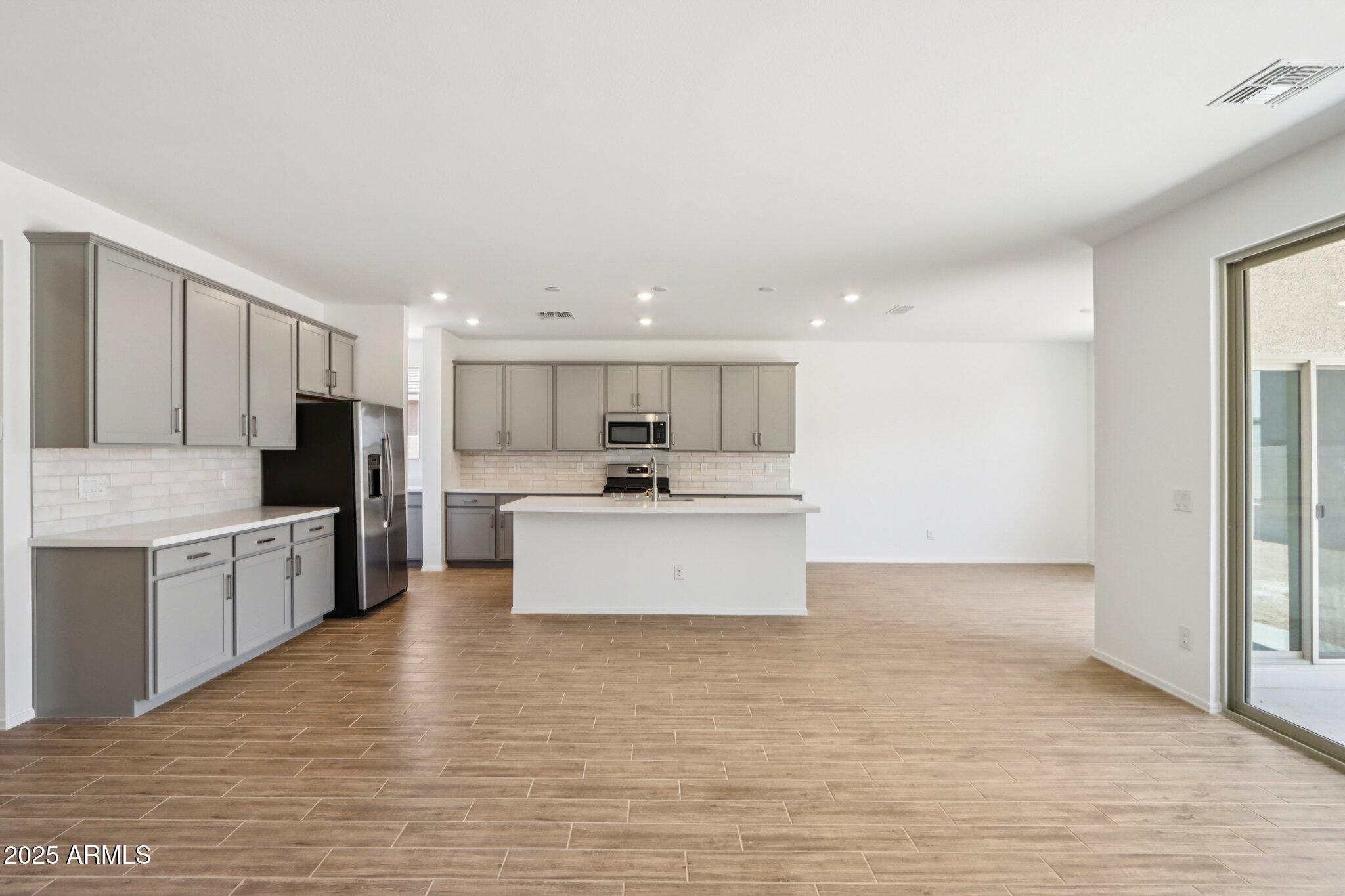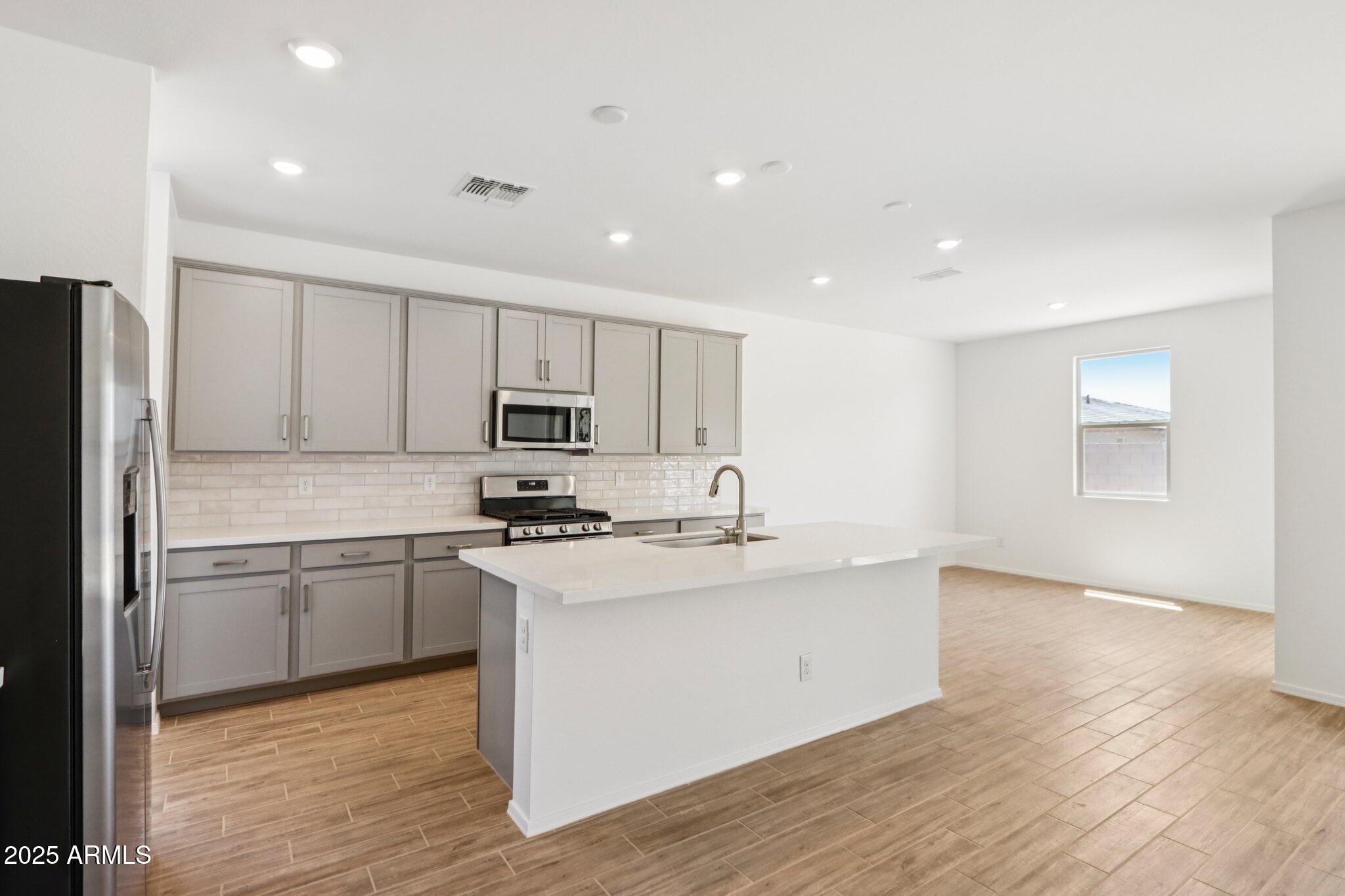 This brand-new construction showcases our Spanish exterior architecture and faces one of our larger parks at Amarillo Creek.This open concept kitchen is perfect for entertaining friends and family with Fairview Gray 42'' Upper Cabinets to included Satin Nickel Pull cabinet hardware, spacious island with a White Sand Quartz countertops, 3 x 12 white horizontal brick backsplash, a stainless steel gas range, and a convenient butler's pantry. The Jade offers 2623 sq feet of living space and features 4 bedrooms, 3.5 bathrooms, and a 3-car tandem Garage with plenty of storage throughout and a double gate. Escape to your own oasis in the separate primary suite, where getting ready is a breeze with dual sinks, walk-in closet and a generously sized bedroom. Thanks to the open concept layout, with Larchmont Canton 6 x 24 Plank tile, 9" ceilings, Large 4 - Panel Center Meet Sliding Glass Door, this home feels bright and open. The Amarillo Creek community is conveniently located near Route 347 for easy commuting to Phoenix, Chandler and Mesa. Just minutes away from an array of dining, shopping and entertainment options that Maricopa has to offer. Don't miss out on this gem of a home!