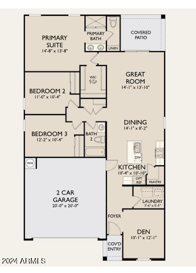 The Jasmine floor plan is perfect for first-time buyers, this single-family home offers 1,494 sq ft of living space, 3 bedrooms, a large den, 2 bathrooms, a 2 Car Garage and a large backyard. The open-concept kitchen is perfect for entertaining family and friends. It features white shaker cabinets, beautiful quartz countertops, modern 12'' X 24'' tile throughout the great room, kitchen, and bathrooms, and sleek stainless steel appliances including a gas stove and fridge. Escape to your oasis in the primary suite, where getting ready is a breeze with dual sinks, a walk-in closet, and a generously sized bedroom. This home feels bright and open thanks to the open concept layout and 9'' ceilings.This Jasmine floor plan also includes front yard landscaping ensuring a warm welcome.