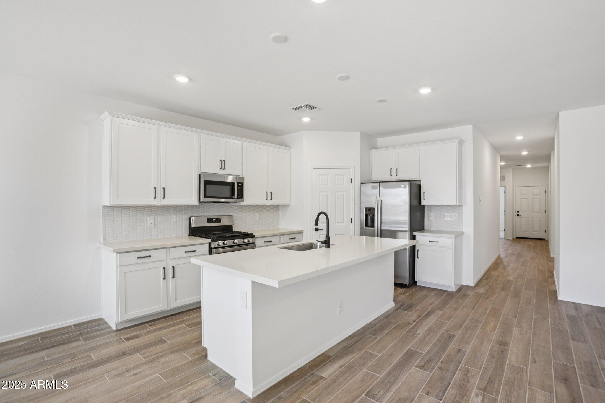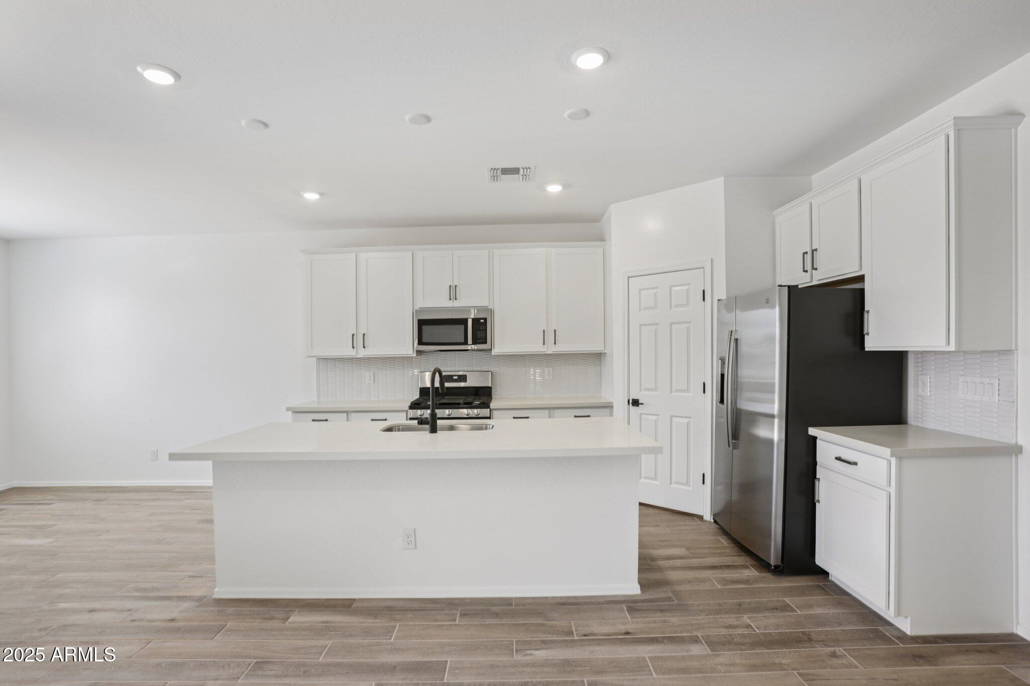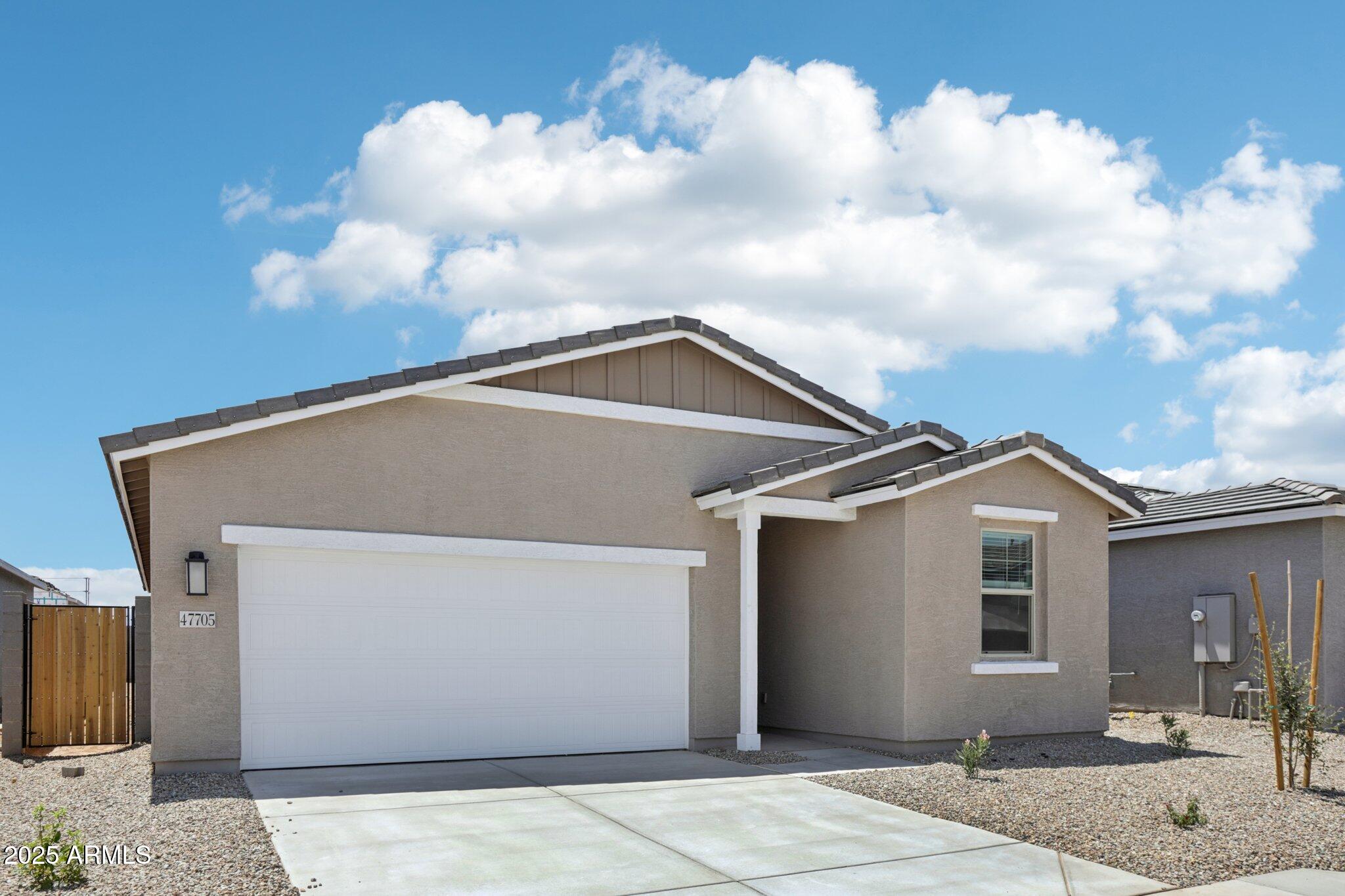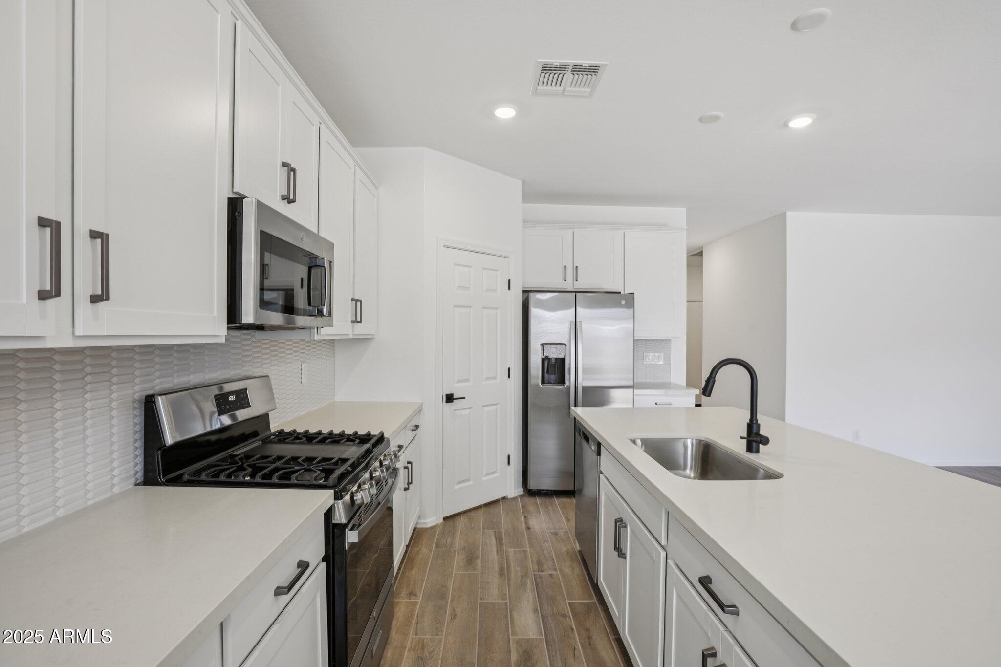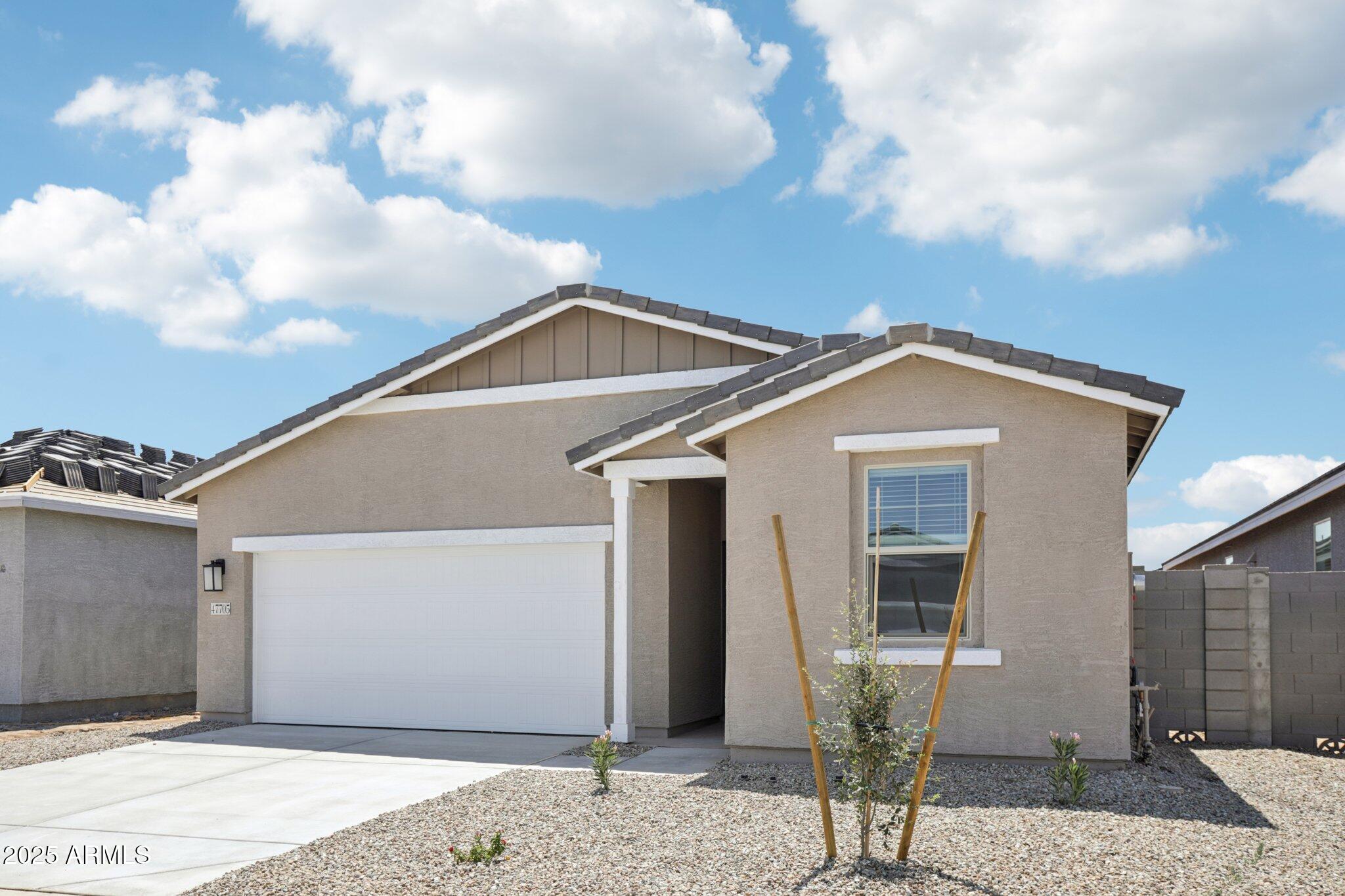 The popular Iris floorplan includes 4-bedrooms, 2-bathrooms and offers 1,797 sq ft of beautifully designed living space and a spacious 2-car garage. Step into a show-stopping kitchen featuring 42'' upper white shaker cabinets, Carrera Breeze quartz countertops, Revalia Remix Calming White Mosaic backsplash, gun metal hardware, and a large pantry. The open-concept layout is enhanced by 9-foot ceilings, Vicinity Natural 6'' x 36''wood-look tile in the main living areas and plush carpeting in the bedrooms. This home comes fully equipped with a stainless steel appliance package, including a gas range, microwave, dishwasher, refrigerator, and even a white washer and dryer for added convenience. Retreat to a serene Primary Suite complete with a generously sized bedroom, dual sinks, a walk-in closet, and added storage. Located in a vibrant community offering scenic mountain views, multiple parks, pickleball and basketball courts, and just minutes from dining, shopping, and entertainment in Maricopa. Don't miss this opportunity to own a beautifully upgraded home in a prime location!