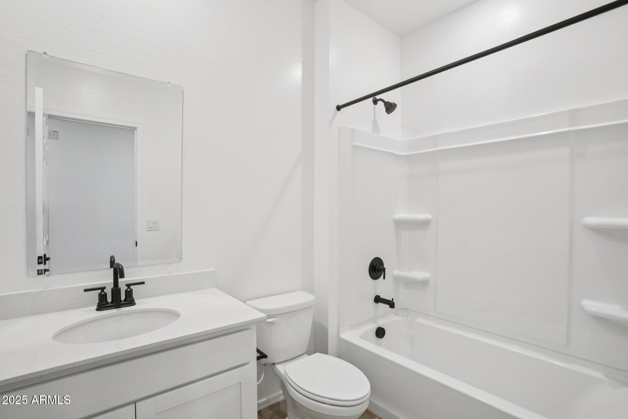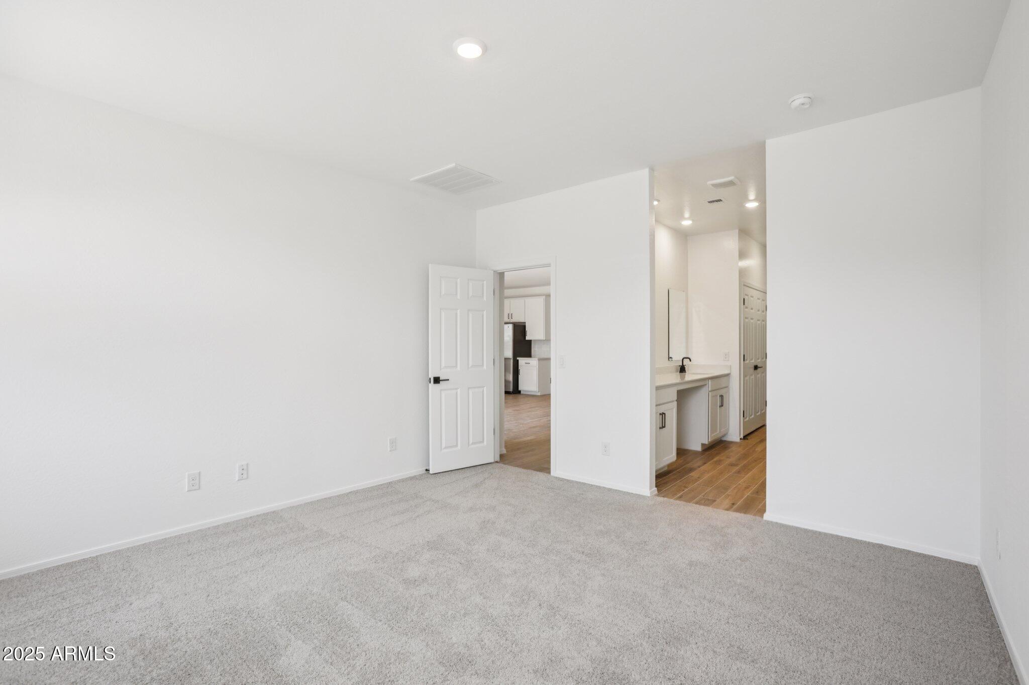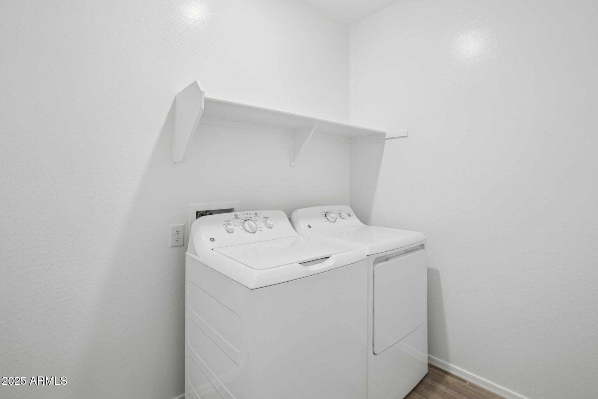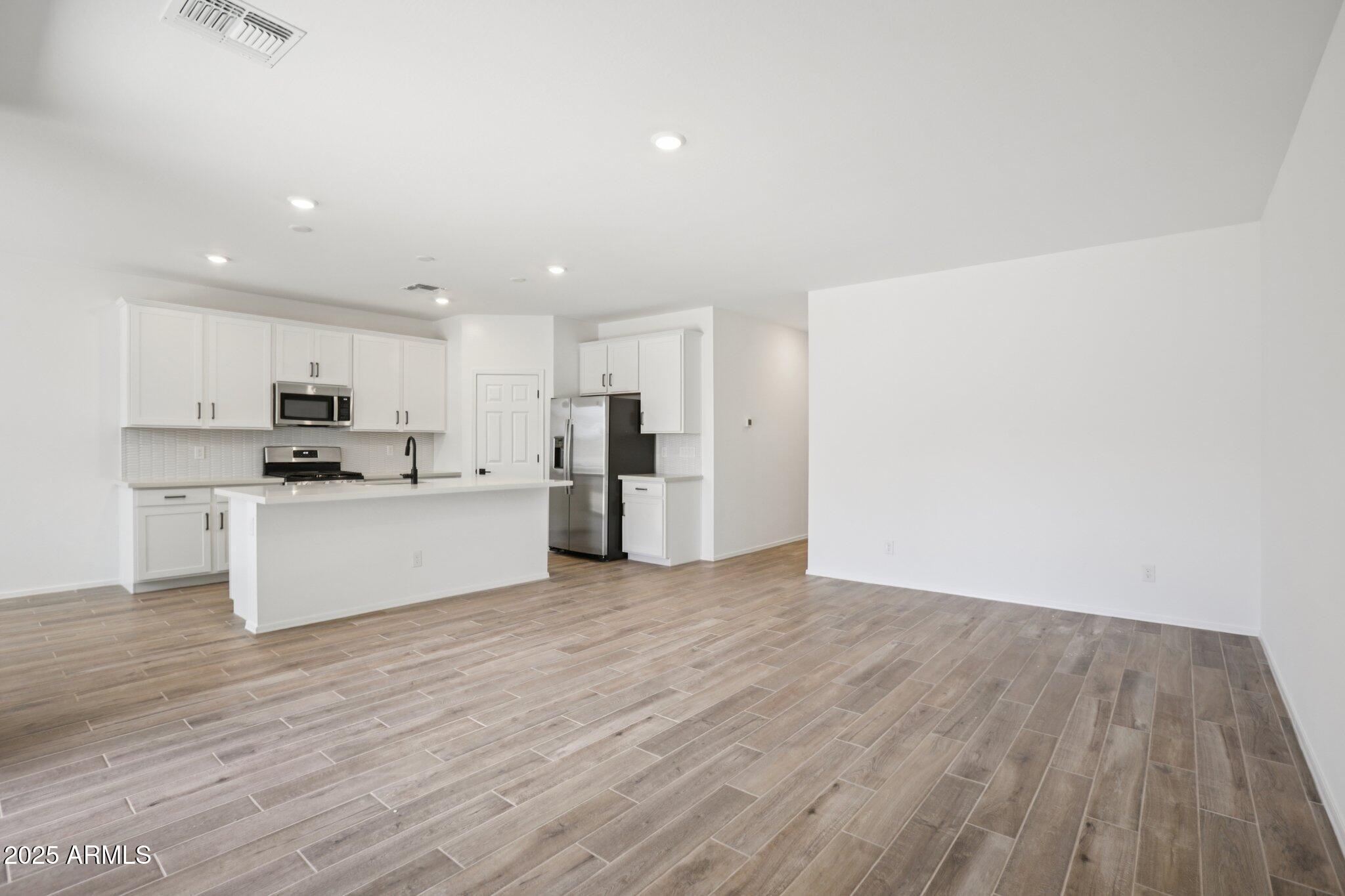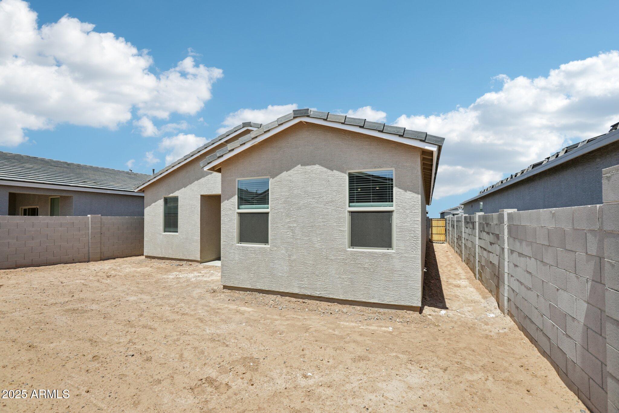 The popular Iris floorplan includes 4-bedrooms, 2-bathrooms and offers 1,797 sq ft of beautifully designed living space and a spacious 2-car garage. Step into a show-stopping kitchen featuring 42'' upper white shaker cabinets, Carrera Breeze quartz countertops, Revalia Remix Calming White Mosaic backsplash, gun metal hardware, and a large pantry. The open-concept layout is enhanced by 9-foot ceilings, Vicinity Natural 6'' x 36''wood-look tile in the main living areas and plush carpeting in the bedrooms. This home comes fully equipped with a stainless steel appliance package, including a gas range, microwave, dishwasher, refrigerator, and even a white washer and dryer for added convenience. Retreat to a serene Primary Suite complete with a generously sized bedroom, dual sinks, a walk-in closet, and added storage. Located in a vibrant community offering scenic mountain views, multiple parks, pickleball and basketball courts, and just minutes from dining, shopping, and entertainment in Maricopa. Don't miss this opportunity to own a beautifully upgraded home in a prime location!