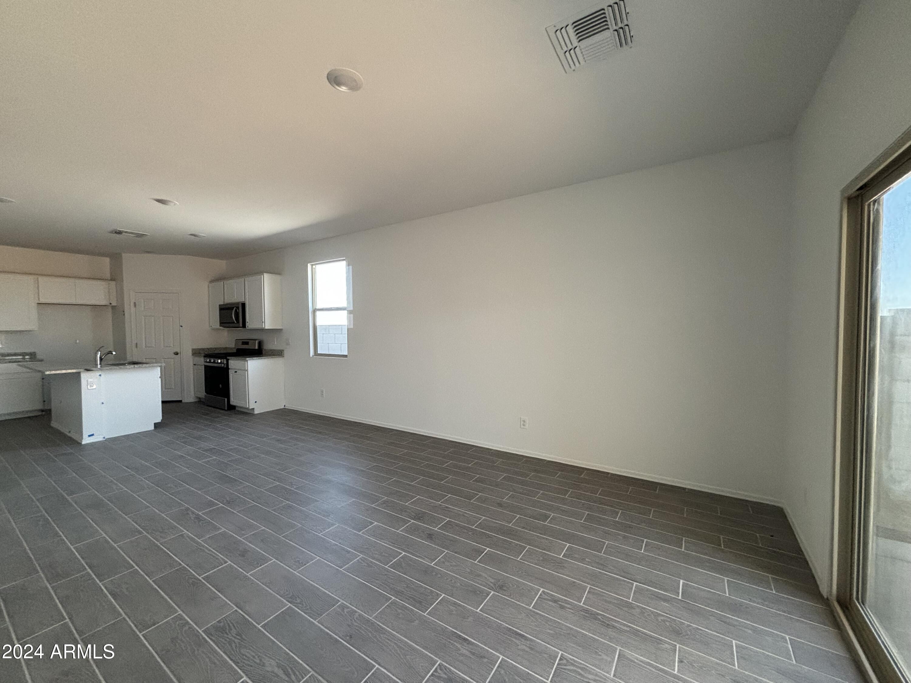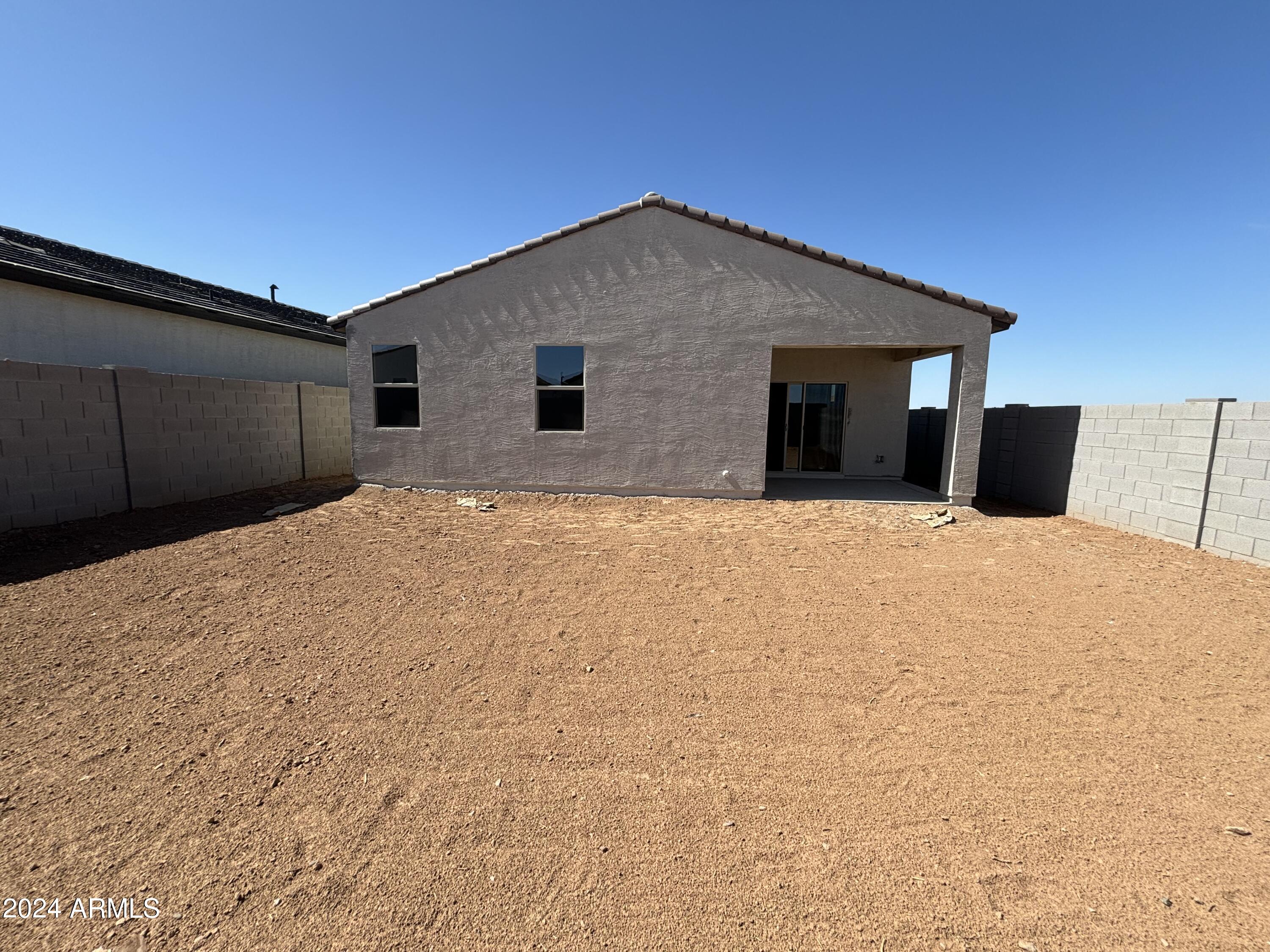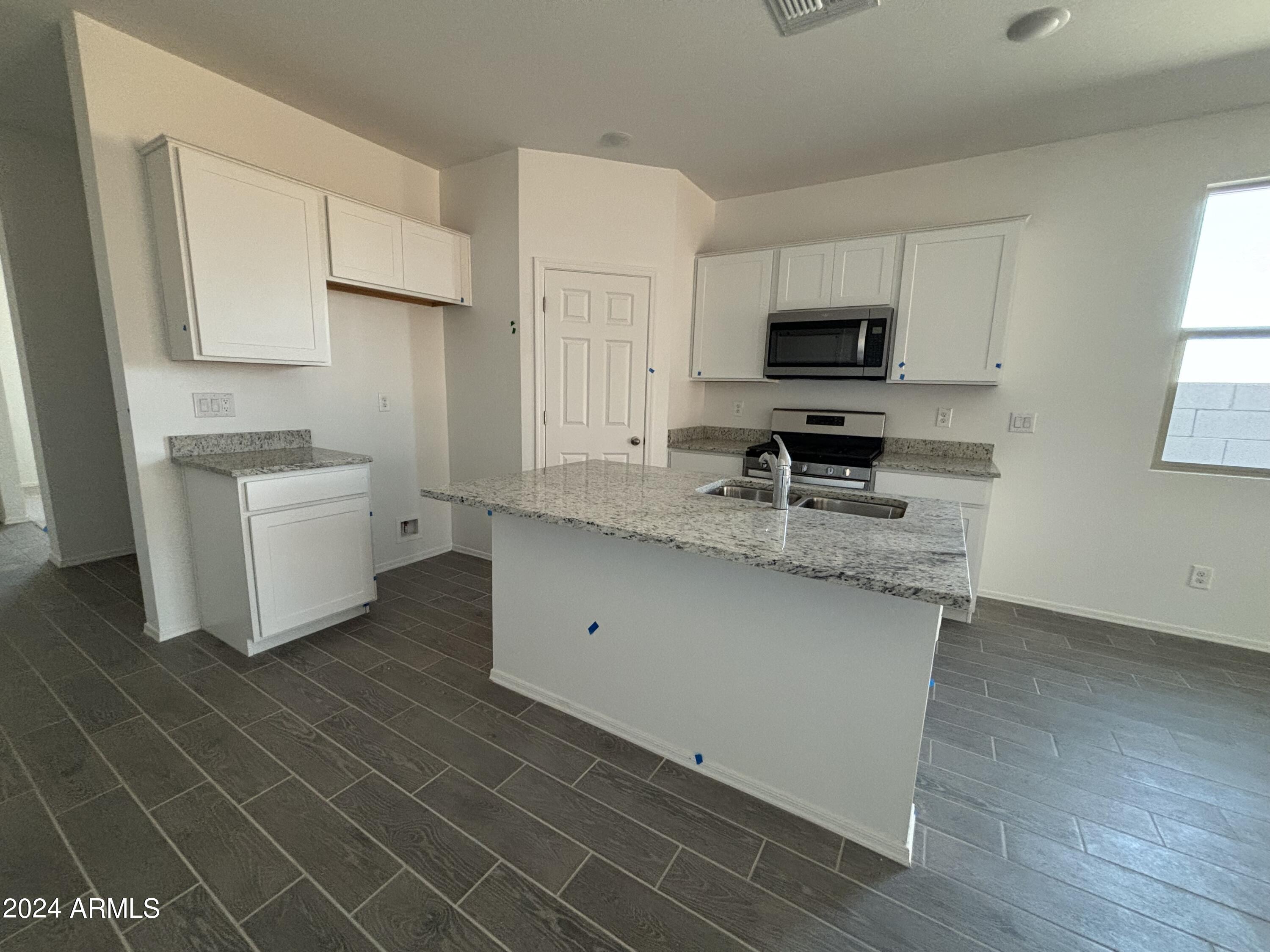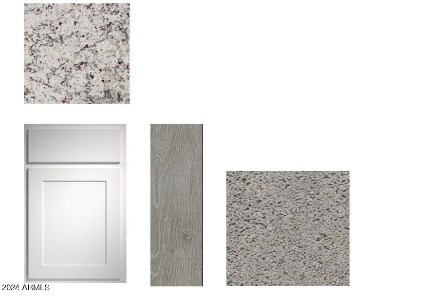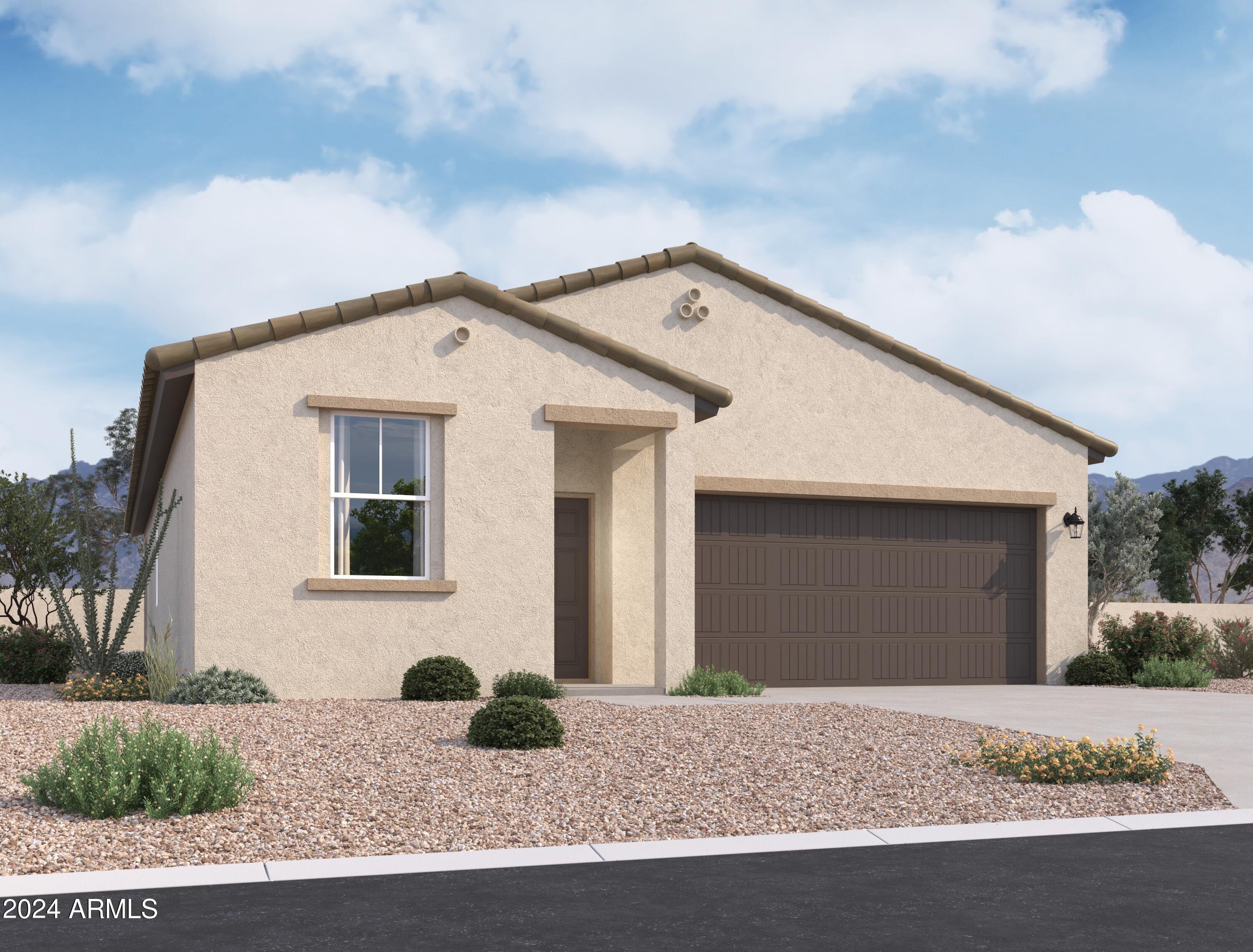 Welcome to Amarillo Creek, an exciting and vibrant new community in Maricopa, Arizona! This stunning home, with its impressive 3 bedrooms and 2 baths, boasts an exquisite design. Step inside and prepare to be wowed by the professionally appointed features throughout. The heart of this home is the beautiful kitchen, complete with granite countertops and sleek white cabinets. Stainless steel appliances add a touch of modern elegance, making this space a joy to cook and entertain in. The upgraded tile flooring, laid seamlessly throughout the home except in bedrooms and den, exudes a contemporary charm. The grey wood look tile, complemented by grey grout, adds a stylish touch, while the beige speckled countertops bring warmth and sophistication to the overall aesthetic.