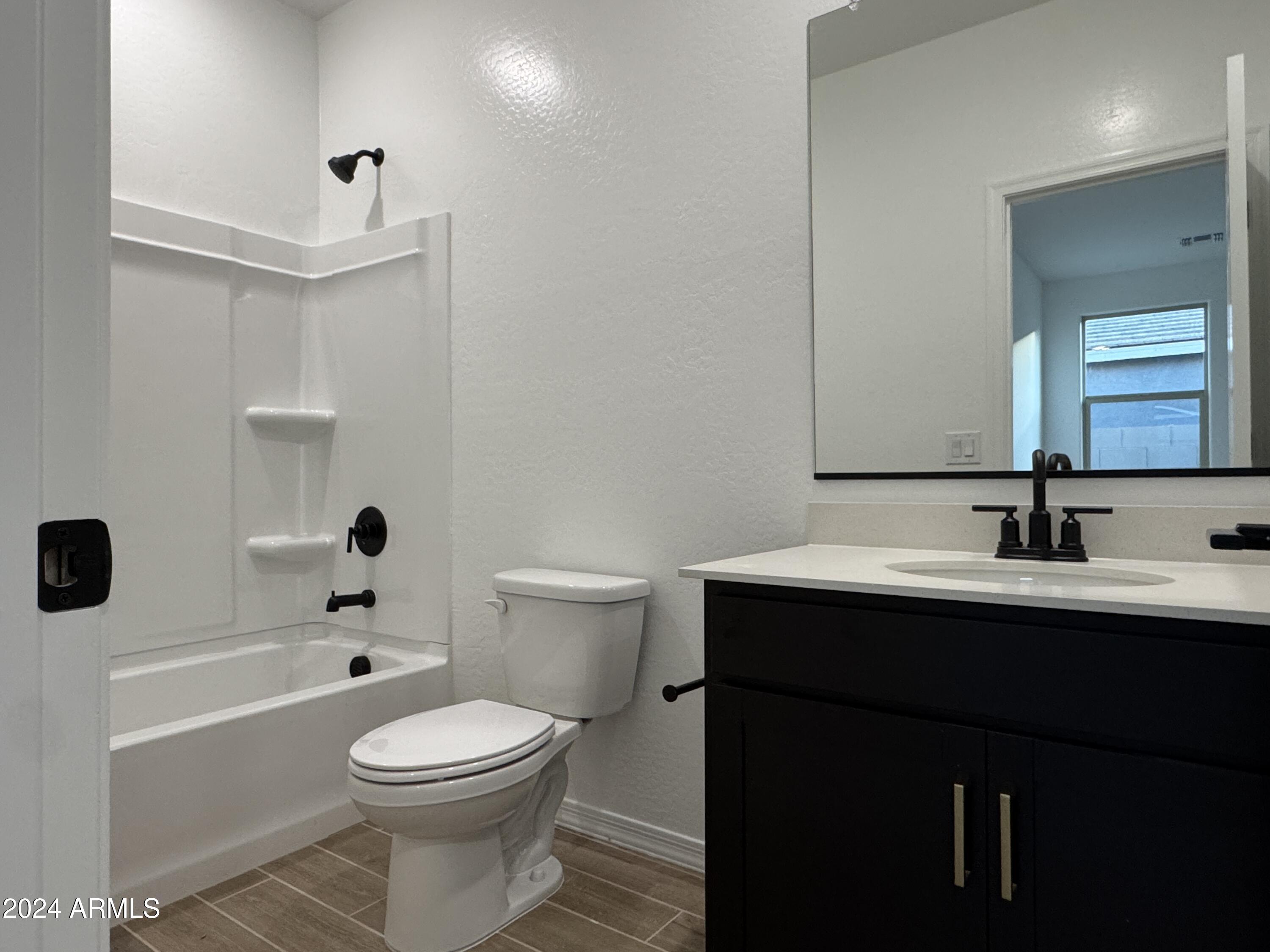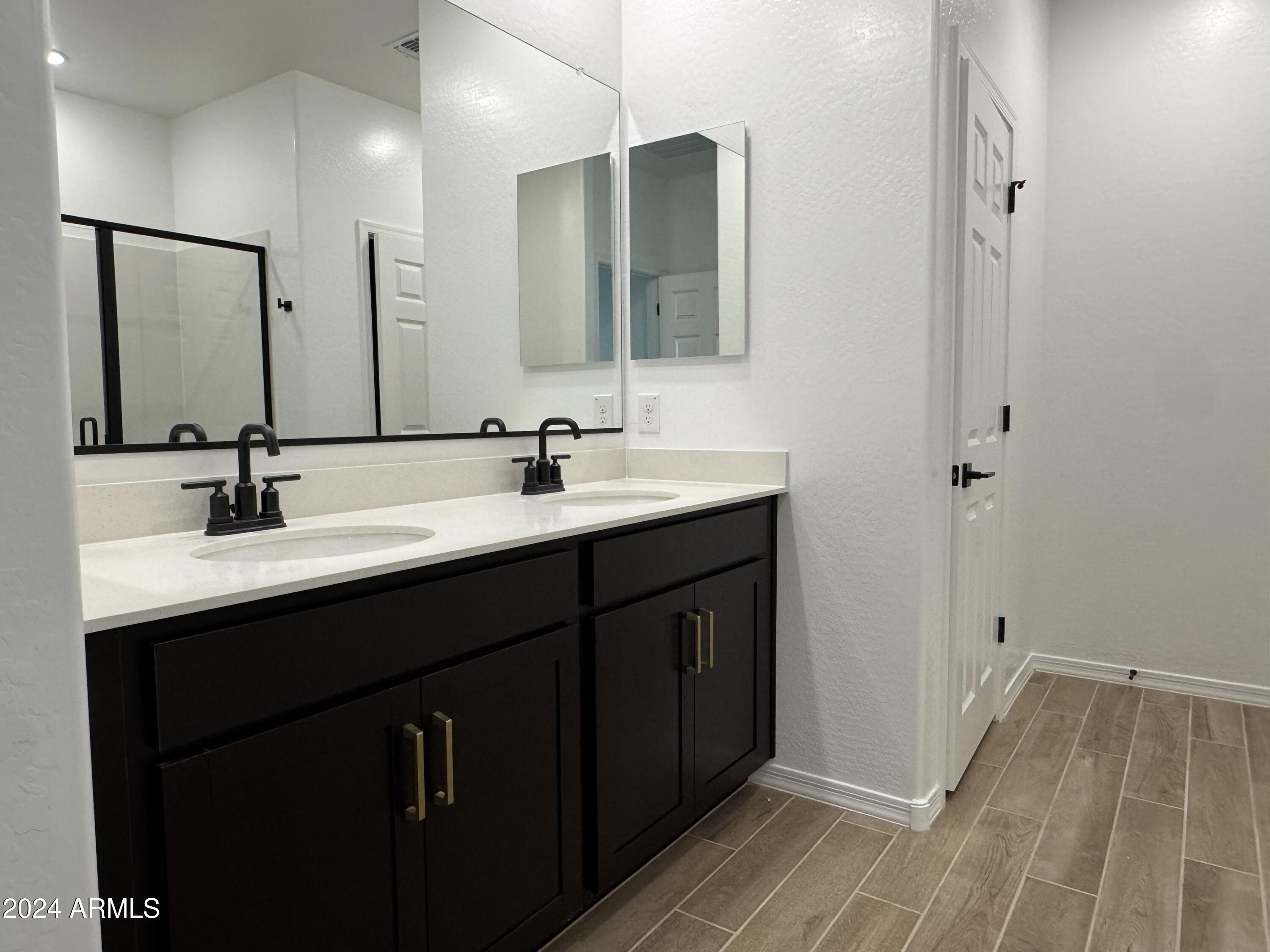 The primary suite is thoughtfully situated away from the secondary bedrooms for added privacy. It features a generous walk-in closet and a luxurious en-suite bathroom with dual round sinks and upgraded matte black finishes that enhance its sophisticated ambiance.