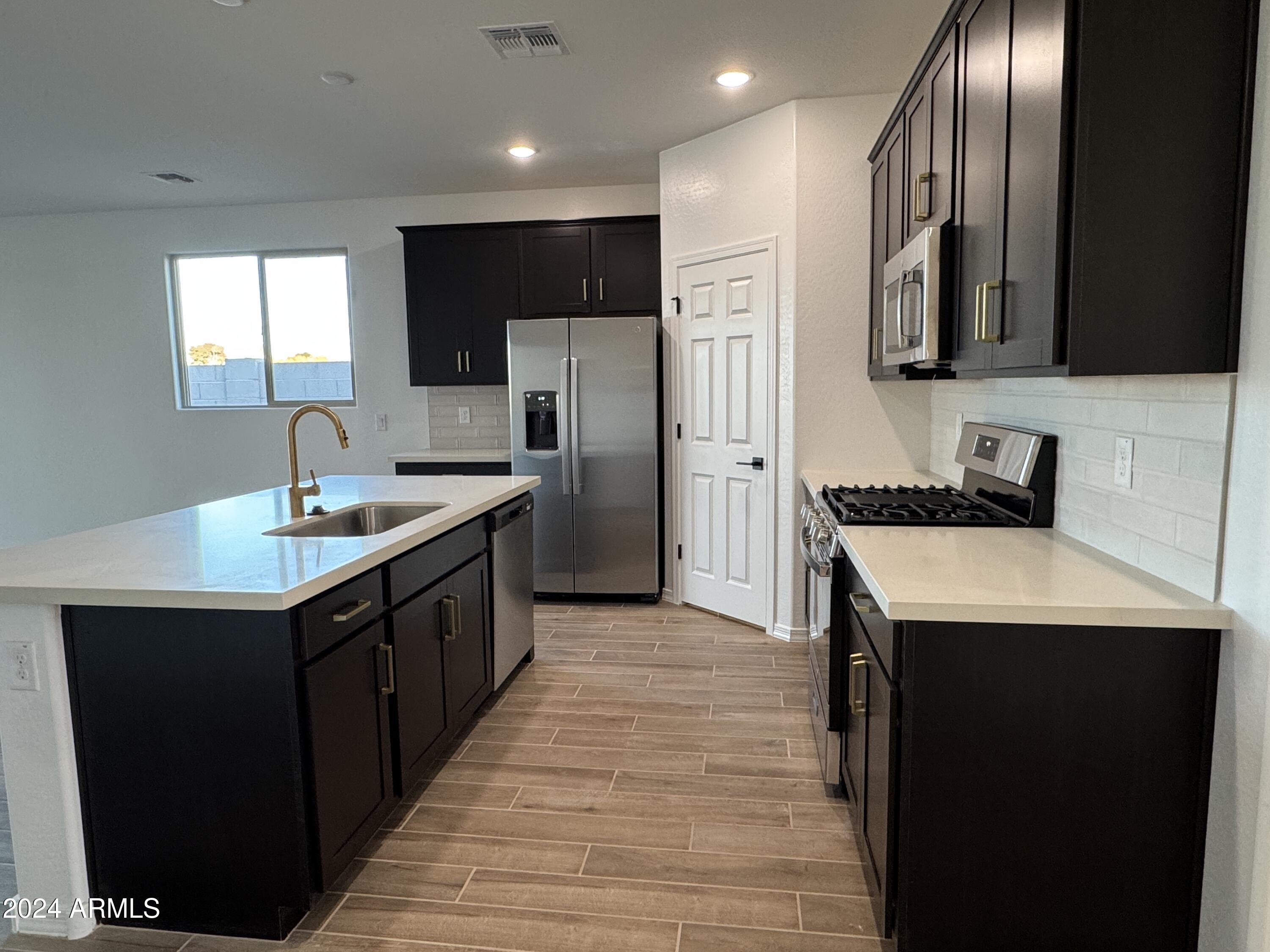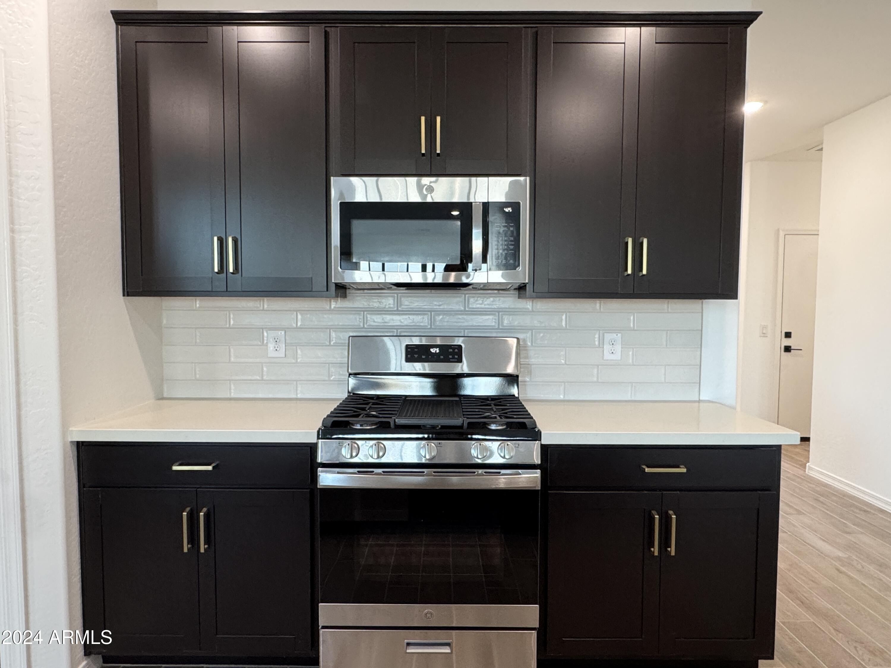 The kitchen is a chef's dream, featuring gorgeous 42-inch espresso upper cabinets are contrasted beautifully by Carrara style white quartz countertops and a matte white backsplash. The kitchen is complimented by champagne bronze cabinet pulls and gold kitchen faucet. This space is both functional and fashionable. Stainless-steel appliances including dishwasher, microwave, gas stove, and refrigerator ensure move-in readiness.