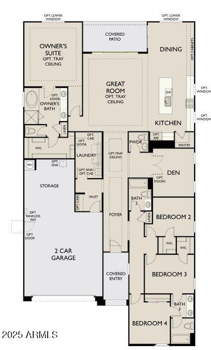 The Jade floorplan at Destination at Gateway - Expedition offers 2,623 sq. ft. of modern living with 4 beds, 3.5 baths, a den, and a 2.5-car garage on a 7,200 sq. ft. lot. This modern desert home features an open great room with 4-panel slider, chef's kitchen with 42'' white soft-close cabinets, quartz countertops, GE stainless steel gas appliances, mosaic backsplash, and light wood plank tile flooring. Owner's suite boasts a rain shower, dry-off deck, and walk-in closet connected to laundry. Additional highlights: Jack & Jill bath, covered patio, pendant lighting, EV outlet, and east/west exposure facing the park.