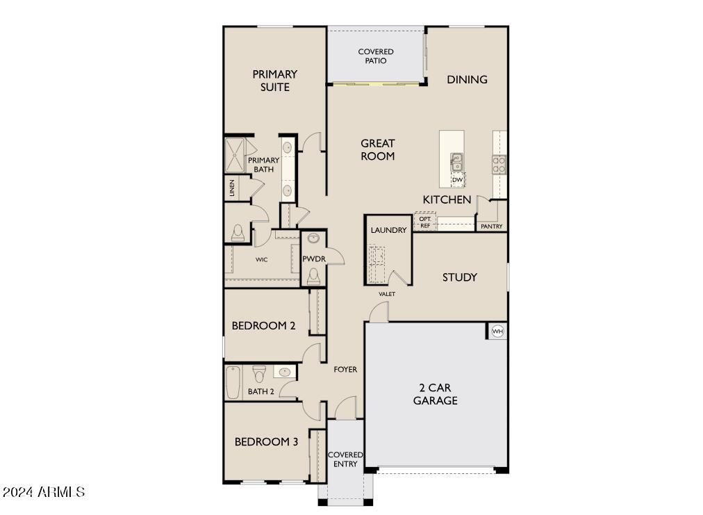 Discover the exquisite Larkspur floorplan in this stunning single-story home, offering 1,953 sq. ft. of elegant living space. This thoughtfully designed residence features 3 spacious bedrooms, 2.5 modern baths, and a versatile den, perfect for a home office or entertainment area. The heart of the home is the stylish kitchen, complete with sleek gray cabinets, a stainless steel sink tub, and a striking granite island--ideal for entertaining. Enjoy the seamless flow of gray-brown plank tile throughout, enhancing the modern aesthetic. Step outside to relax on the covered patio, perfect for enjoying morning coffee or evening gatherings. The attached two-car garage provides ample storage and convenience.