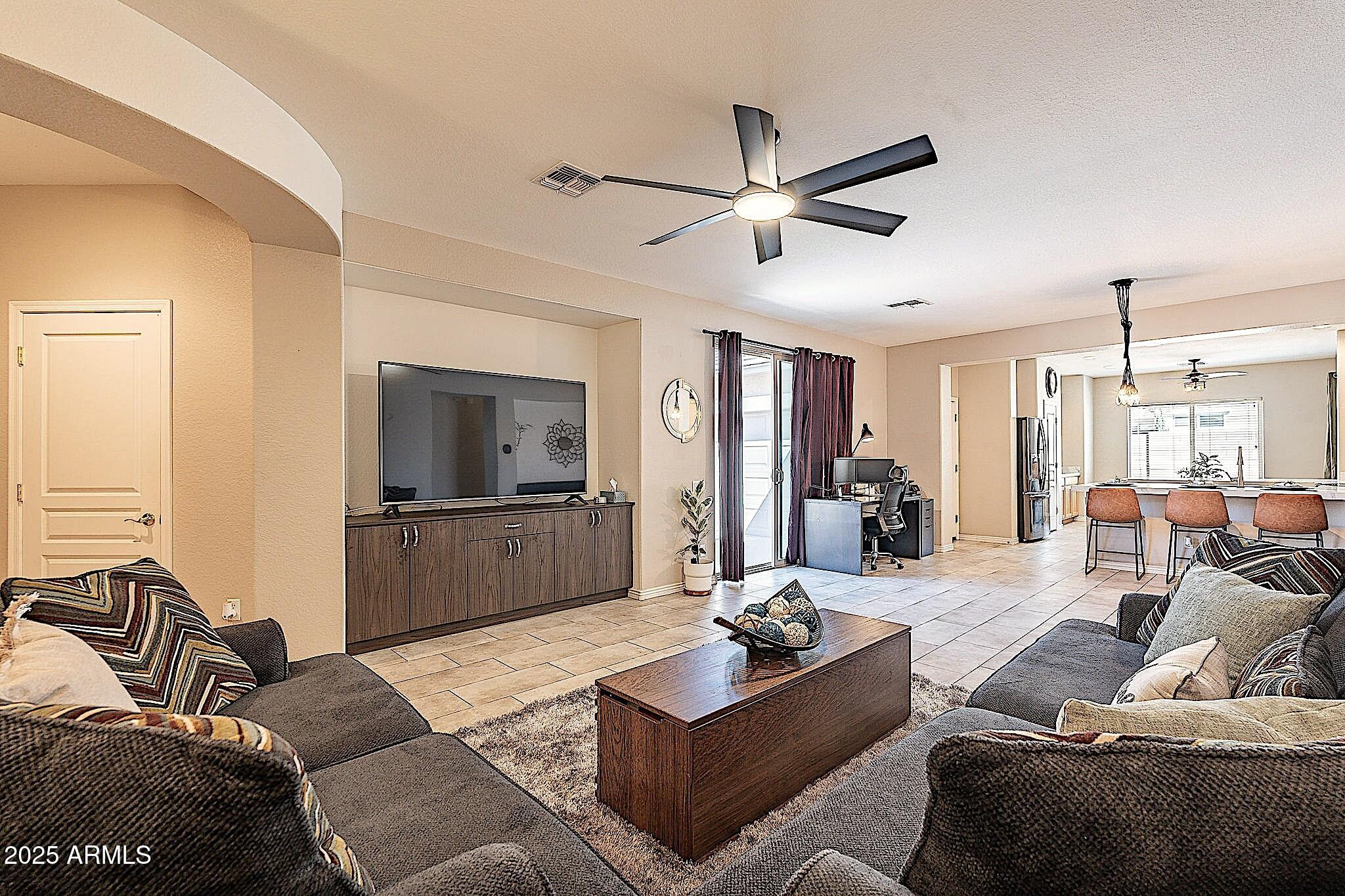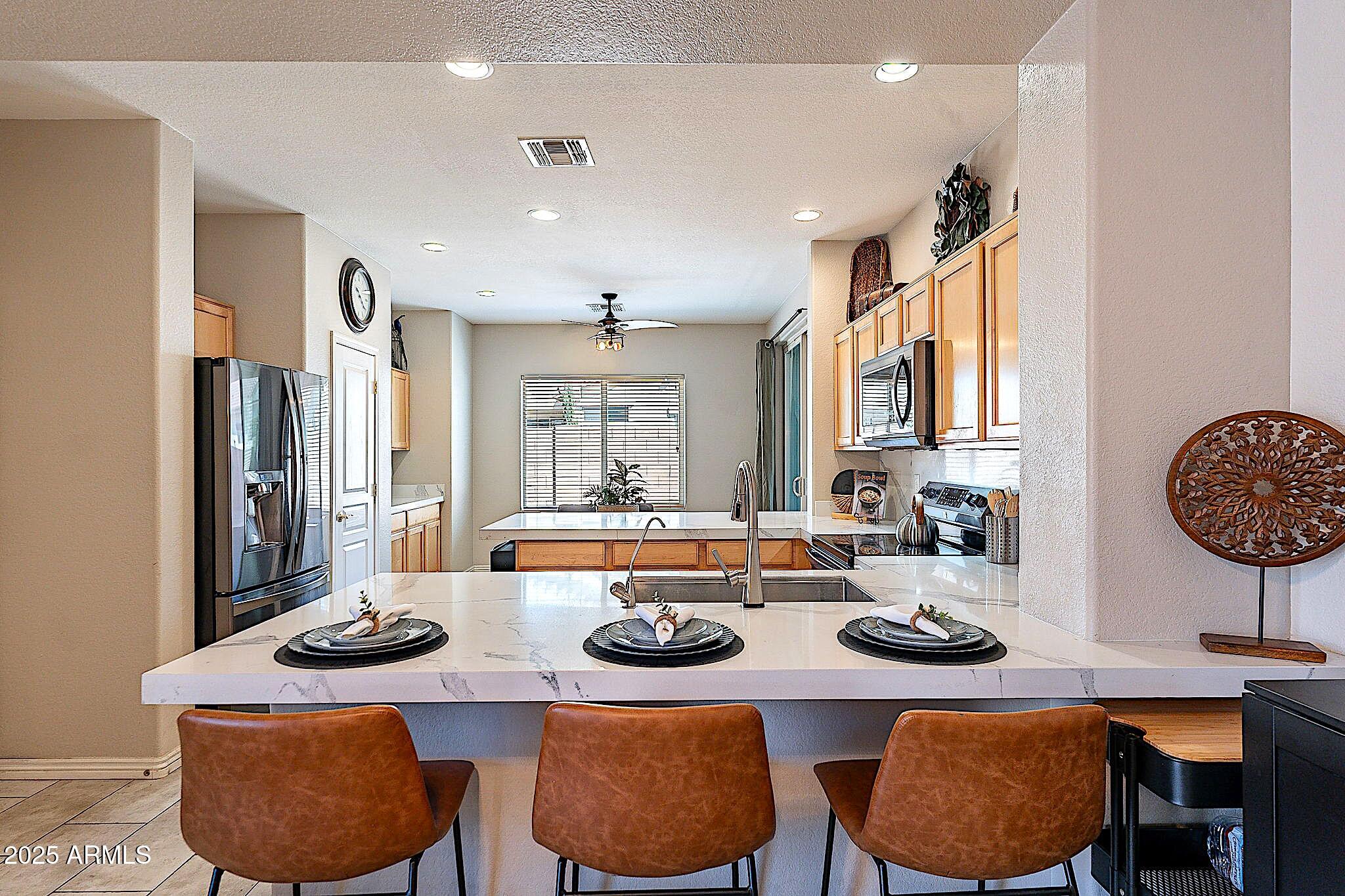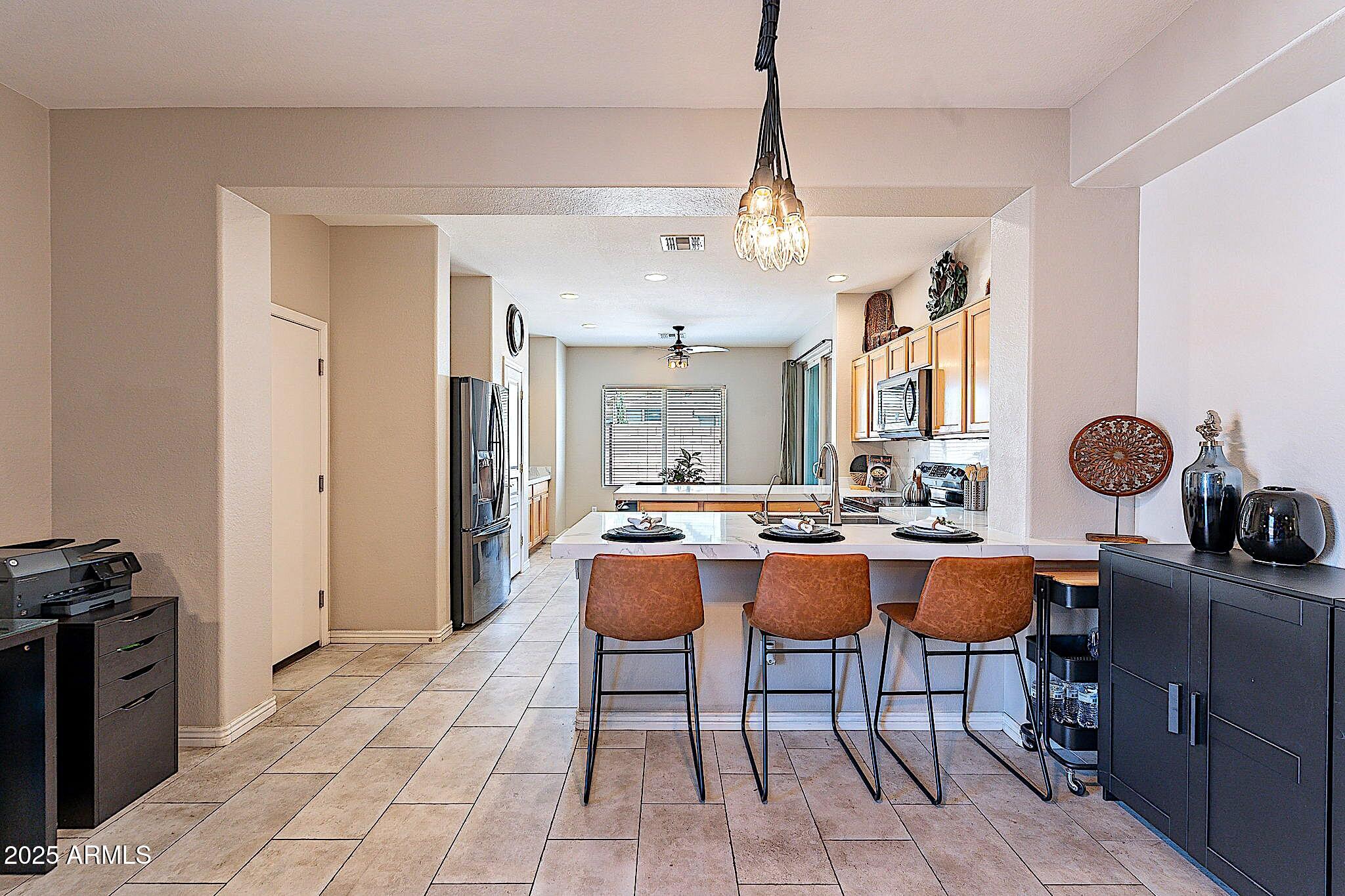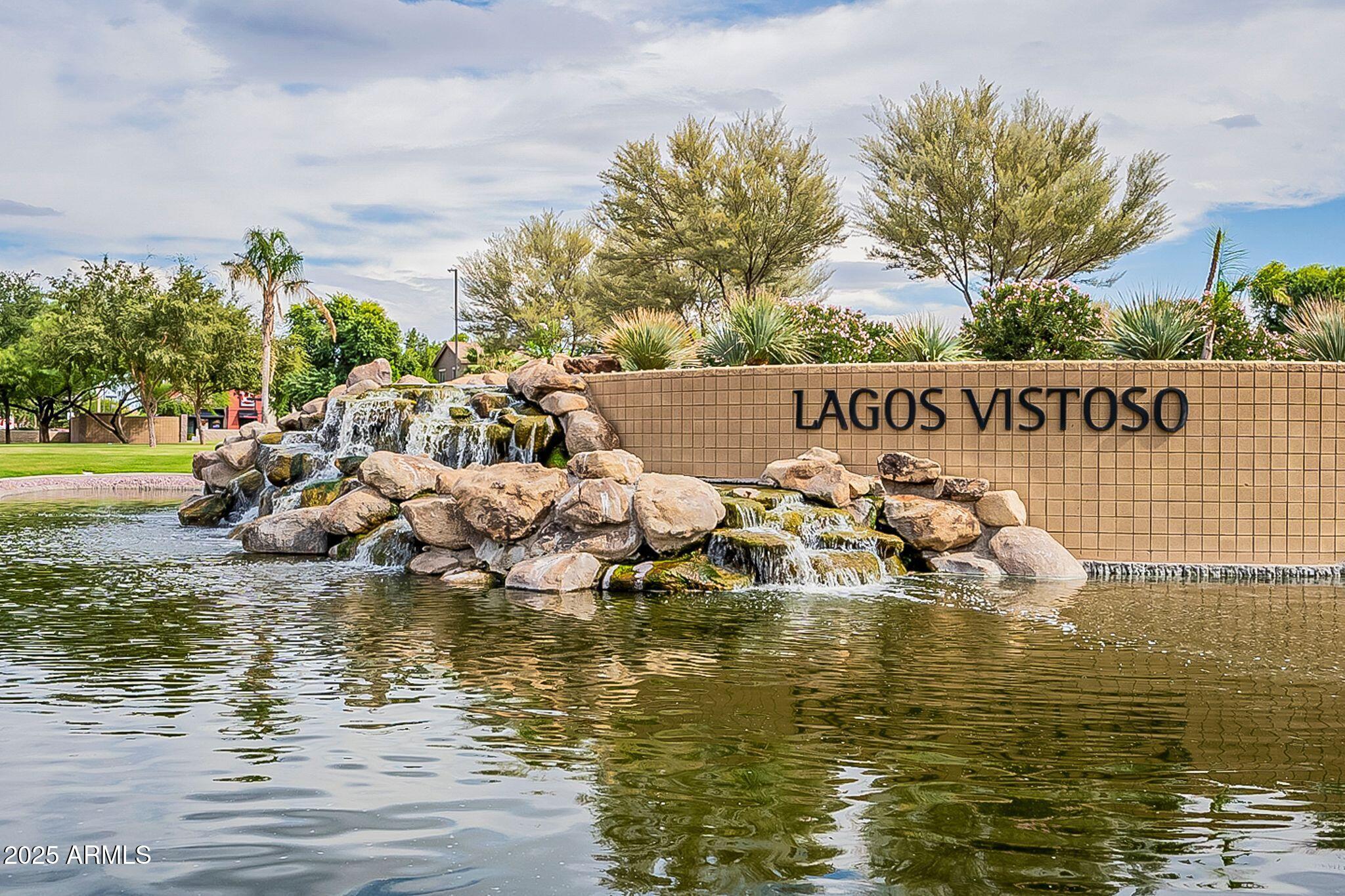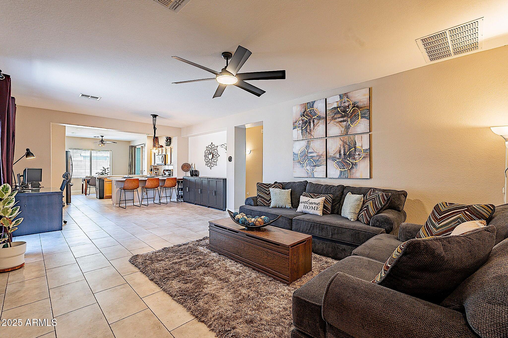 This beautifully maintained single-level home offers 3 bedrooms, 2 baths, and an open-concept greatroom and dining area with sliders leading outside. The kitchen comes complete with black stainless steel appliances, sleek quartz countertops, ample cabinets, and 2 large islands with breakfast bar seating. The private primary suite has a large bedroom, natural lighting, and bathroom with dual sinks, soaking tub/shower combo, and custom-designed walk-in closet. Tile flooring throughout, new AC unit (2023), new water heater (2025), water softener, and RO system. Parking for up to 5 vehicles and epoxy floors and ceiling storage racks in the garage. Nestled in a highly desired gated lake community with lush greenbelts, walking paths, playgrounds, covered ramadas, BBQ grills, & basketball court.